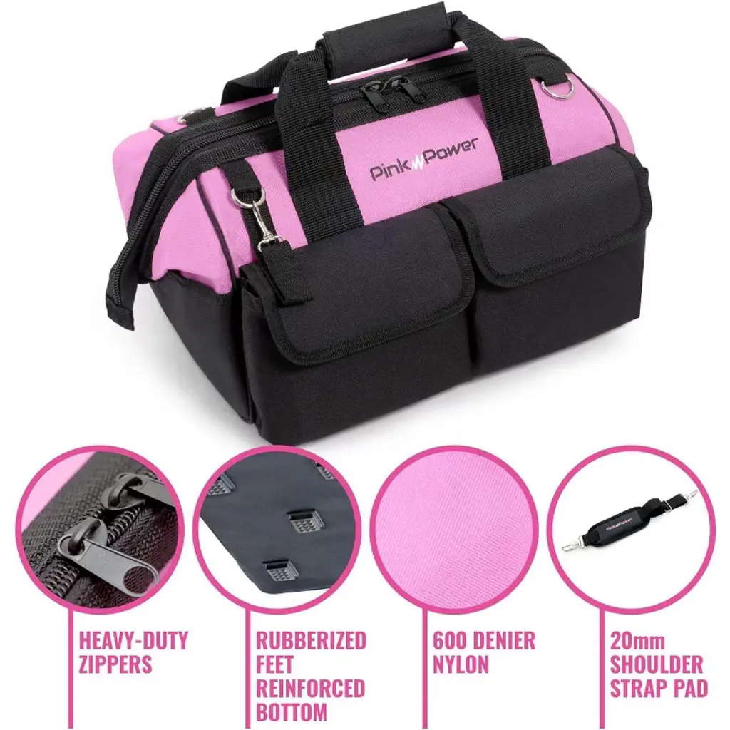 Pink Power Pink Tool Bag For Women -16" Tool Tote Bag W/ 22 Storage Pockets - Womens Small Tool Bag For Hand Tools, Power Tool - Tool Caddy Organizer
