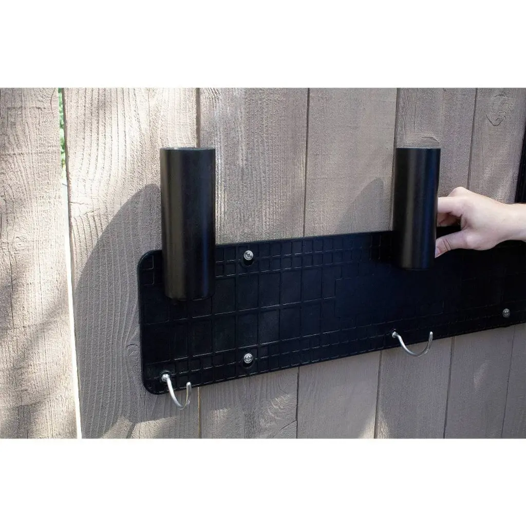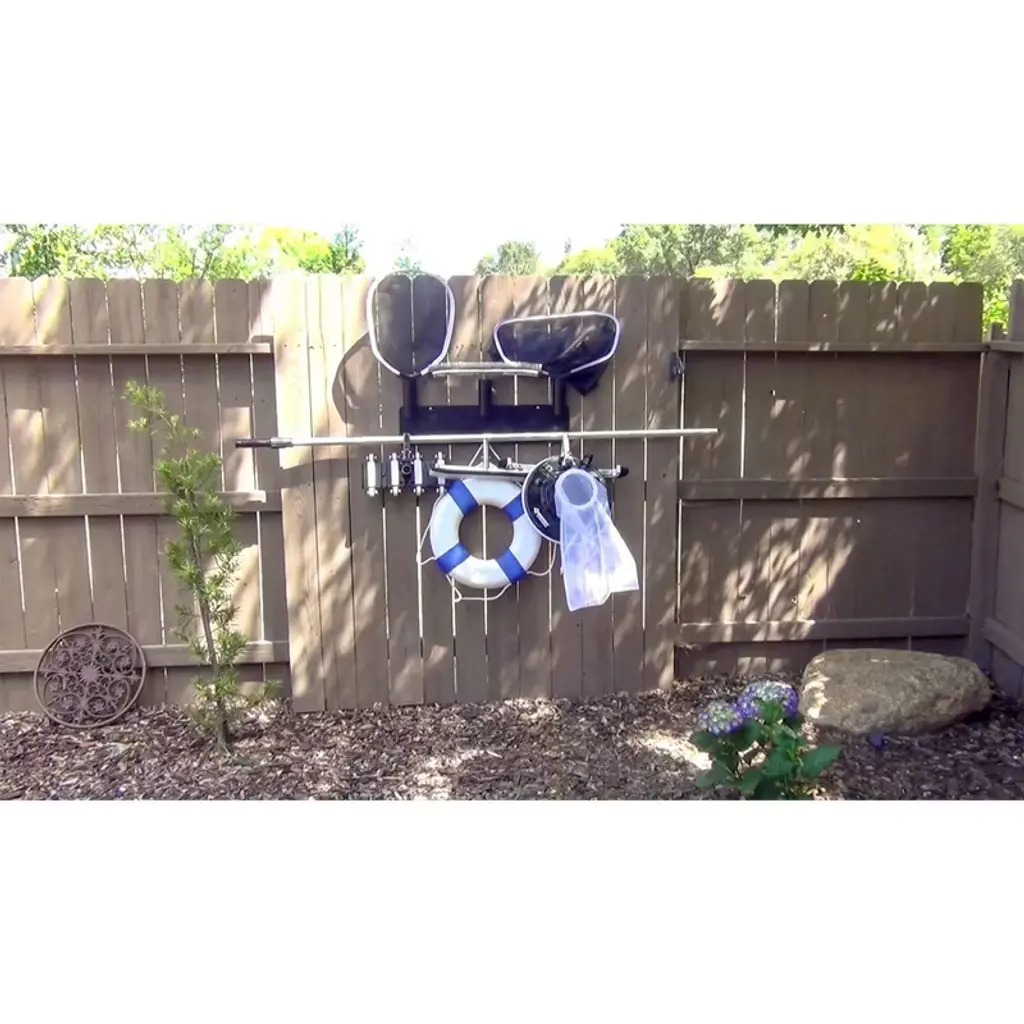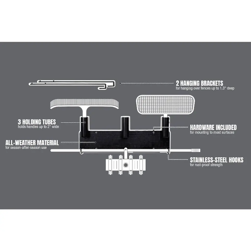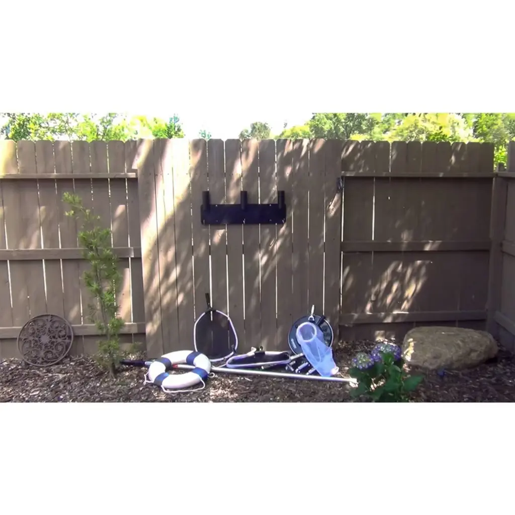 Chosen by 2019 Pool and Spa Magazine as top 50 product of the year. Keeping your pool tools or garden supplies neat and tidy and off the ground is easy with the pool tool organizer rack. Made from weather-resistant material, once assembled, the pool maintenance tool storage and organizer can hold up to 90 pounds of pool gear. Pool rakes, skimmers, pool brushes, pool poles, pool vacuum heads and more. Load it up and know that all your pool gear is at the ready when you need it. Assembles in minutes, The Swimming Pool Tool and Garden Tool Organizer can be mounted directly to any hard surface. Or, assemble with the two brackets and hang outdoor organizer over any fence up to 1.3-inches wide. Ready, set, Get organized!
