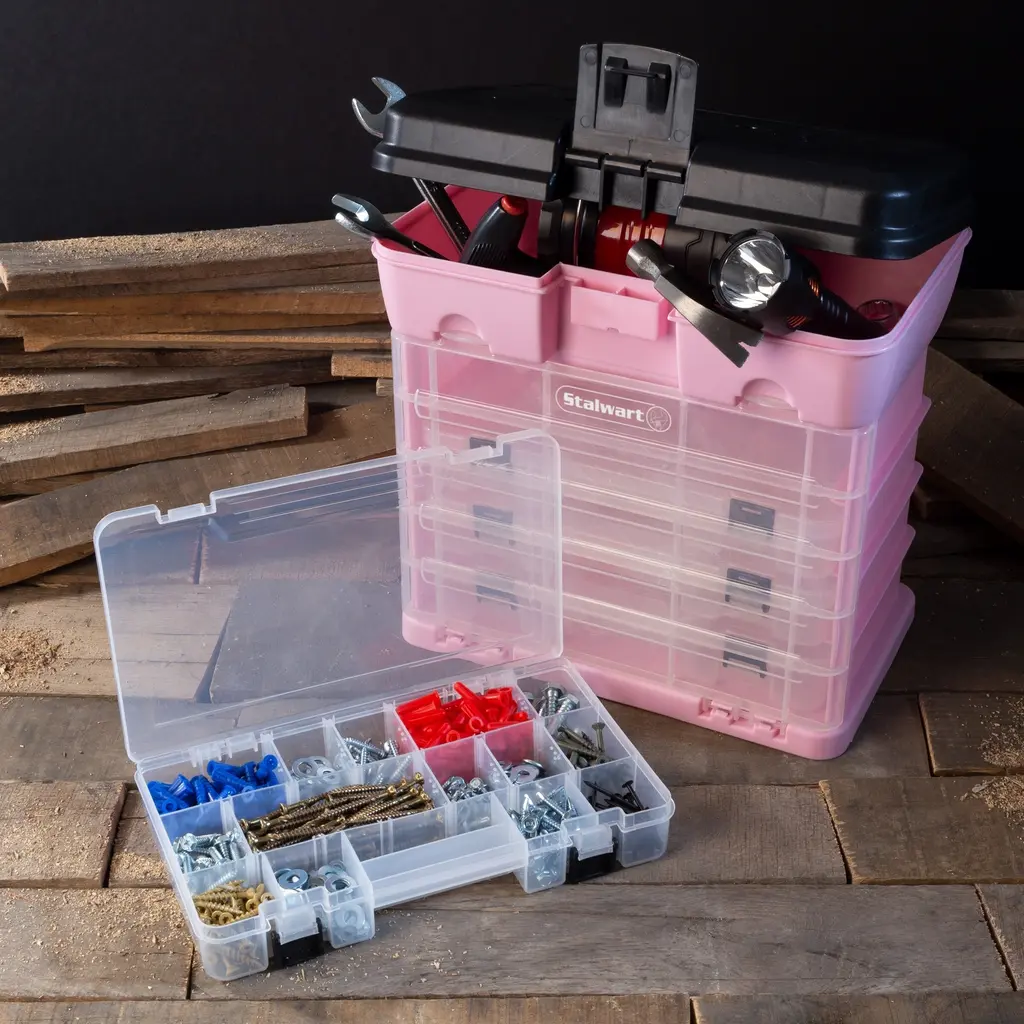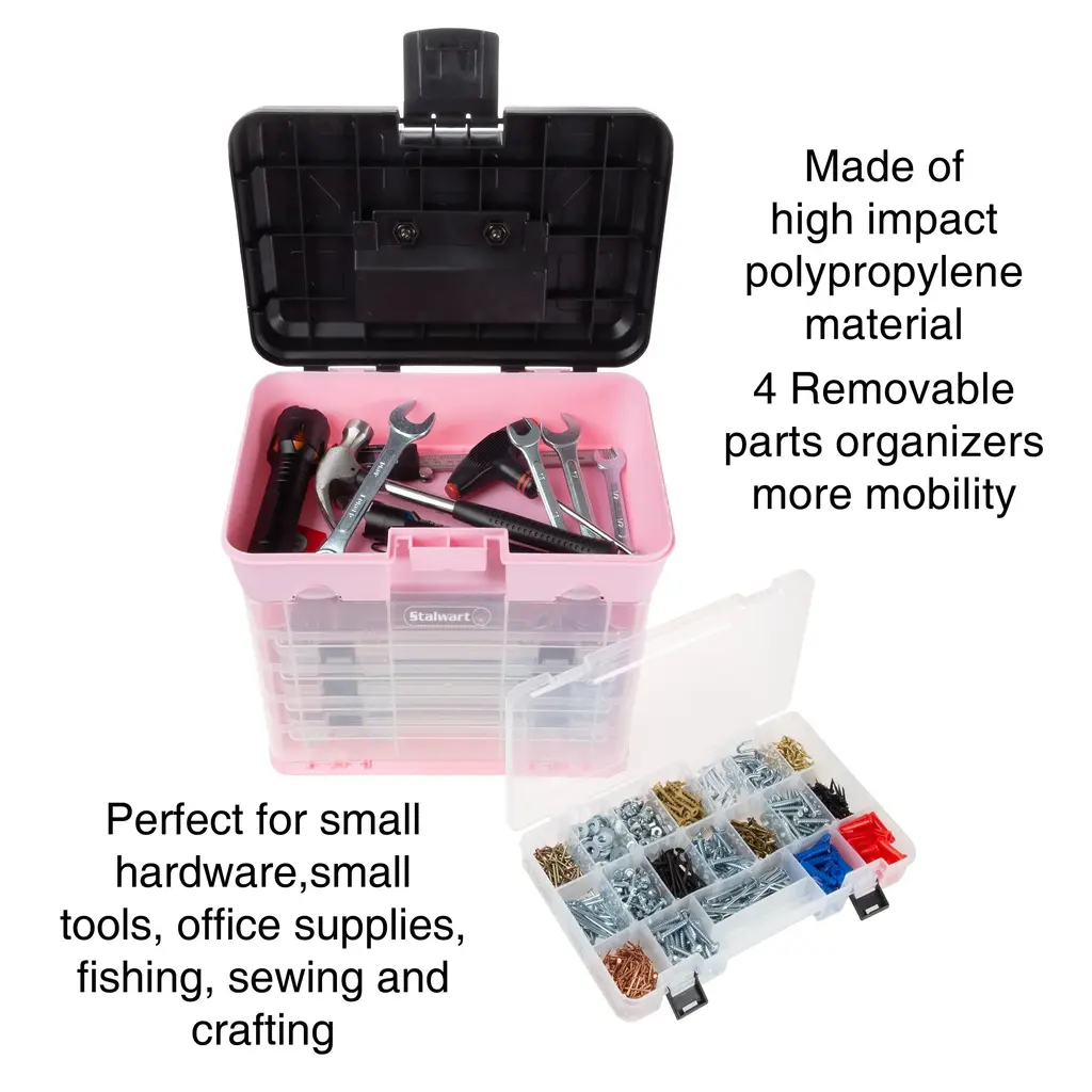 The Storage and Tool Box by Stalwart is the one spot storage solution you have been looking for! Equipped with 4 clear plastic storage boxes, as well as the large main storage section that’s perfect for holding bigger items like tools, it has a spot for everything you need to keep organized. Each drawer is fully removable, constructed from durable polypropylene, and features a secure snap shut lid.. The drawers all slide in and out of the main unit for quick access and are locked in with a latched cover when not in use. The case also has a convenient handle for portability and easy travel. It’s an excellent multi-purpose storage box that’s perfect for everything from tools, hardware like nails, screws and bolts, to fishing tackle, beads, jewelry and crafting supplies! SATISFACTION GUARANTEED- Stalwart is committed to providing the consumer with the absolute best price and value on all of our products, which we ensure by applying a rigorous quality control process. NOTE: This is an exclusive product of Stalwart and ONLY Storage and Tool Boxes by Stalwart are GUARANTEED to be genuine IMPORTANT: Avoid buying counterfeit products and transacting with unauthorized sellers. Look for our logo on the packaging for every one of our products. Stalwart is a registered trademark protected by U.S. Trademark law and will be vigorously defended.