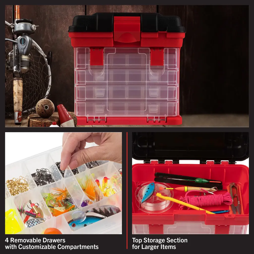 Keep your workshop or crafting room tidy and organized with the Plastic Tool Box with Handle by Stalwart. This multipurpose tackle box organizer is constructed from lightweight but impact-resistant polypropylene with a sturdy handle for travel-ready portability and 4 removable drawers with small customizable screw organizers and storage bins as well as a large top compartment. This versatile toolbox is perfect as a craft organizer, fishing box, or nut and bolt organizer — use it wherever there are small parts in need of smart organization. Stalwart, for tool box organizers and storage boxes that are SMART, STRONG, and SECURE. IMPORTANT: Stalwart is committed to providing the consumer with the absolute best price and value on all of our products. NOTE: This is an exclusive product of Stalwart and ONLY Tackle Box Organizers and Storage by Stalwart are GUARANTEED to be genuine. Avoid buying counterfeit products and transacting with unauthorized sellers. Stalwart is a registered trademark protected by U.S. Trademark law and will be vigorously defended.
