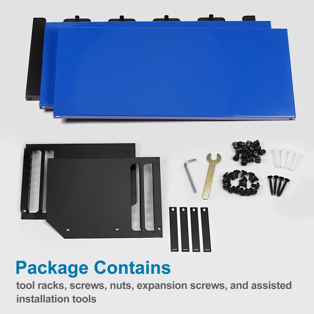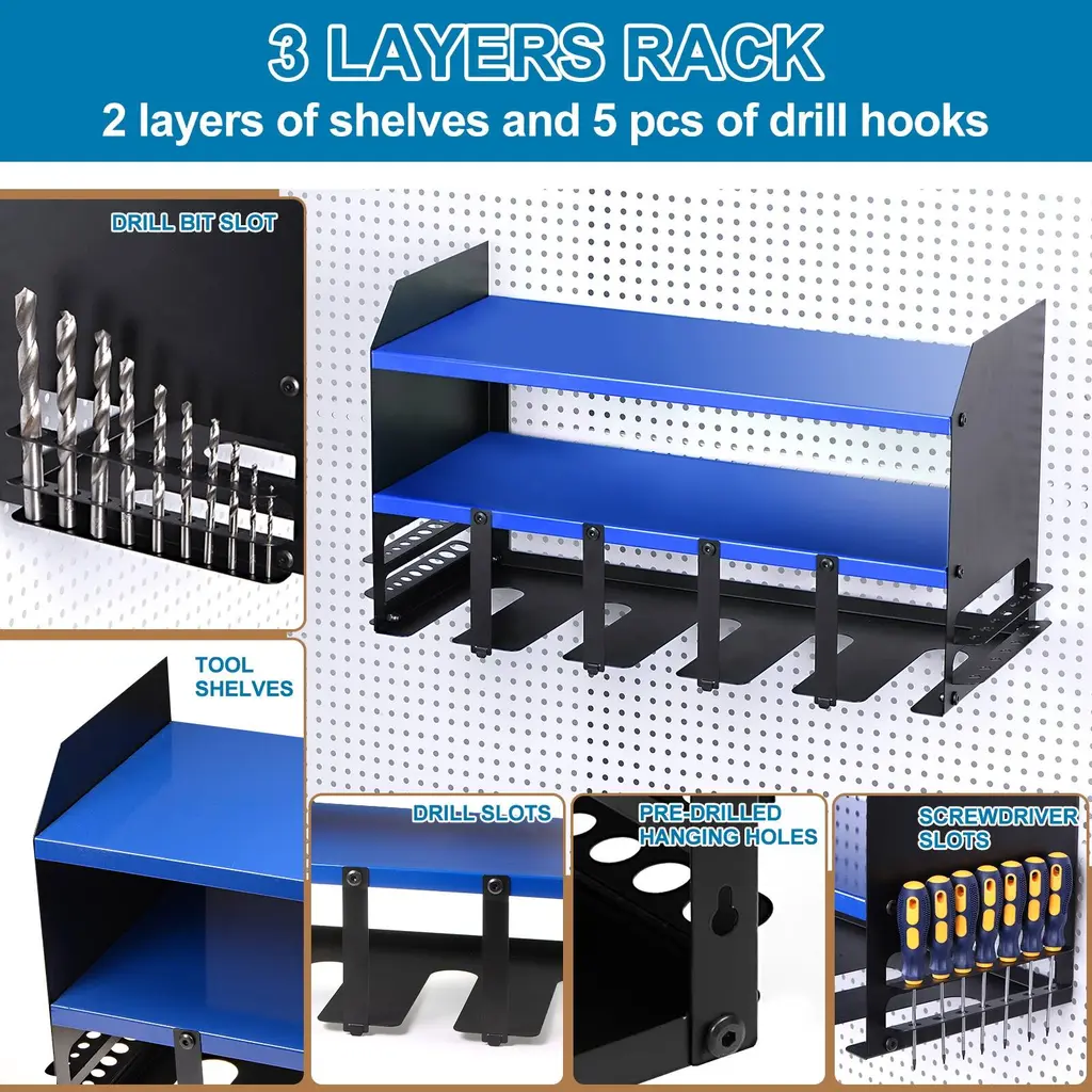 The Power Tool Organizer is the perfect solution for storing and organizing your power tools and hand tools. With its 3-layer design and side slot feature, it offers high capacity storage for drills, screwdrivers, hammers, pliers, and more. Made from durable steel with a rust-resistant sandblasting surface, this wall-mounted tool rack is built to last. It not only helps save space in your workspace but also makes it easy to find and access your tools. Whether you need to organize your garage, workshop, or warehouse, this tool organizer will keep your tools safe, clean, and within reach.Features: