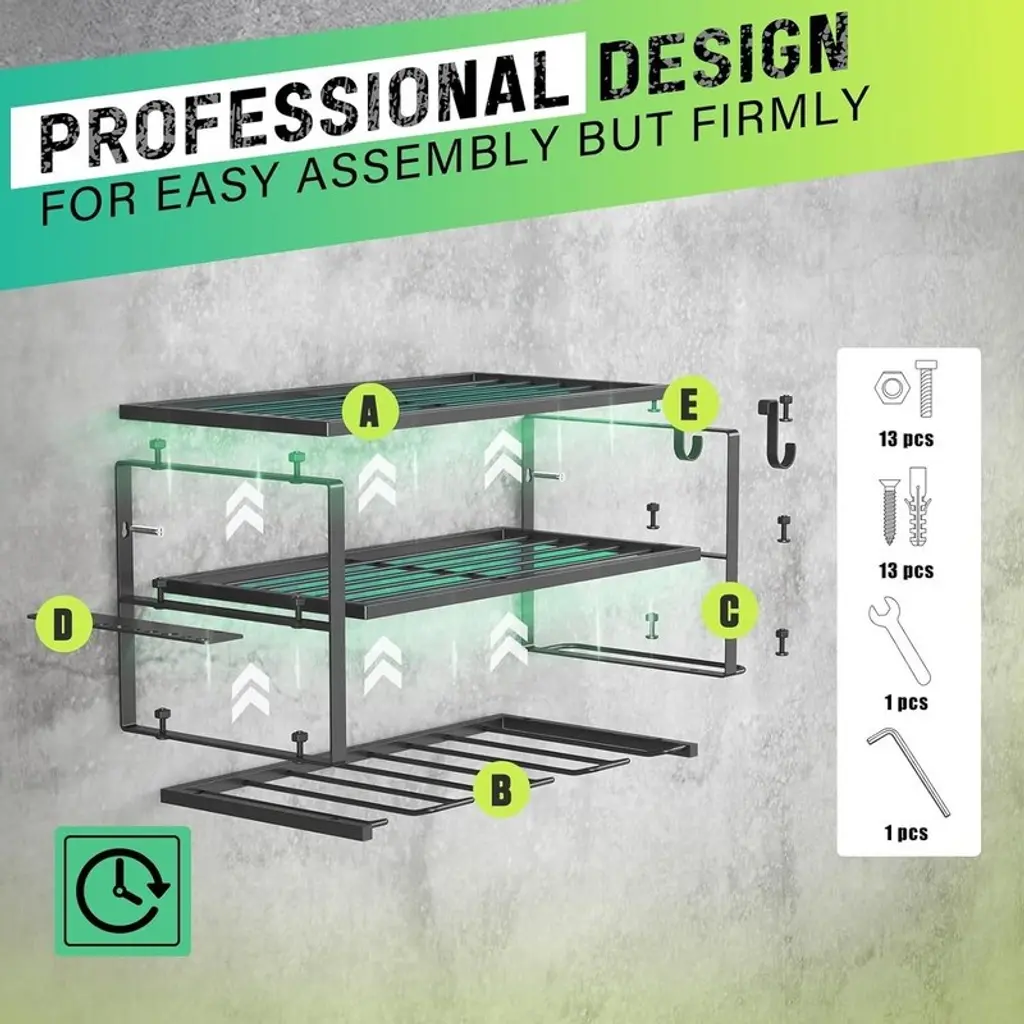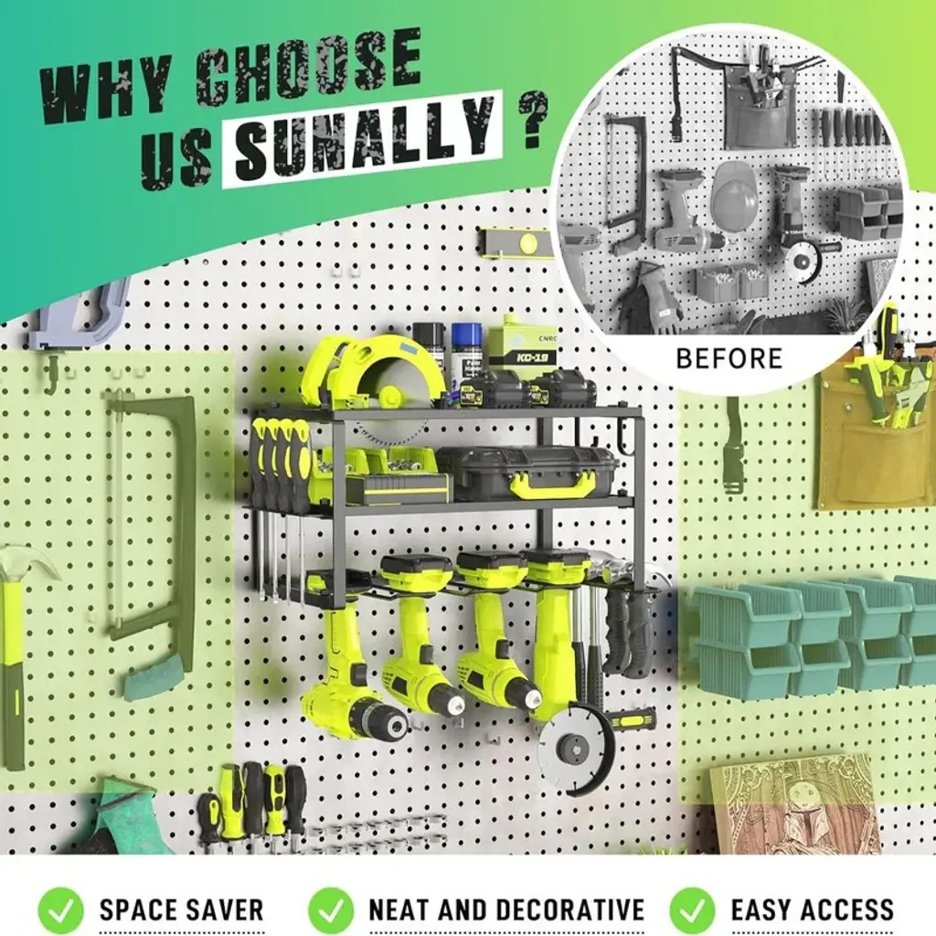 Neat Utility Rack and Space Saver;This power tool holder makes full use of the wasted wall space to display and place your power & handheld tools storage, transform it into a compact & effecient area. This tool organizer helps you keep all your commonly used project tools neatly organized and within your arm's reach. This is not a space saver also a decoration. Strong Weight Capacity;Sunally 3 Tier large capacity tool organizer can store a lot of your tools. And our floating tool hoolder is made of thickened heavy duty steel metal for greater weight capacity and durability, equipped with hexagonal Expansion Bolts for greater load bearing, never worry about the shelf breaking or the tool rack falling from the wall up and down. Easy to Install;Tool organization and storage is removable design, refer to the professional installation manual, you can assemble a perfect tool rack wall mount in just a few minutes. You just need to connect the steel frame with screws and hang it on the wall. Then you will get a perfect tool holder for your workroom Optimized Details;The surface of our drill holder wall prevent from scartching and long-lasting,as we adopted custom materials and special workmanship. The bottom iron wire of the power tool holder is upturned design, preventing the tool holder from sliding down.