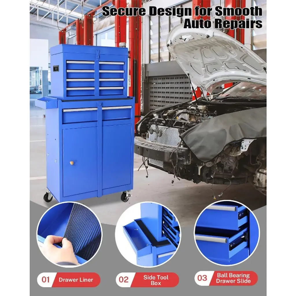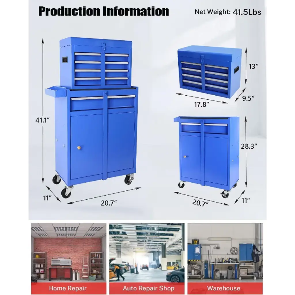 Your Complete Mobile Workshop Solution Tired of wasting time searching for tools? This heavy-duty 5-drawer rolling tool chest keeps your workspace organized and efficient, whether you're in a professional shop or home garage. Built with industrial-grade powder-coated steel, it withstands daily use while resisting rust and wear. The stainless steel work surface doubles as a sturdy workbench for repairs and projects, giving you the perfect spot to assemble parts or lay out tools. Need to move your tools around? The four smooth-rolling wheels (two locking) let you easily push the chest wherever it's needed—from your garage to the driveway or between job sites. When it's time to work in one spot Organization is simple with five removable drawers (available in 2" and 3" heights) that fit everything from bulky wrenches to small screws. Plus, with seven additional storage bins, you'll have plenty of space for accessories like drill bits, nails, or electrical tape. The lockable drawers keep your tools secure, while the non-slip work mat protects delicate surfaces from scratches.