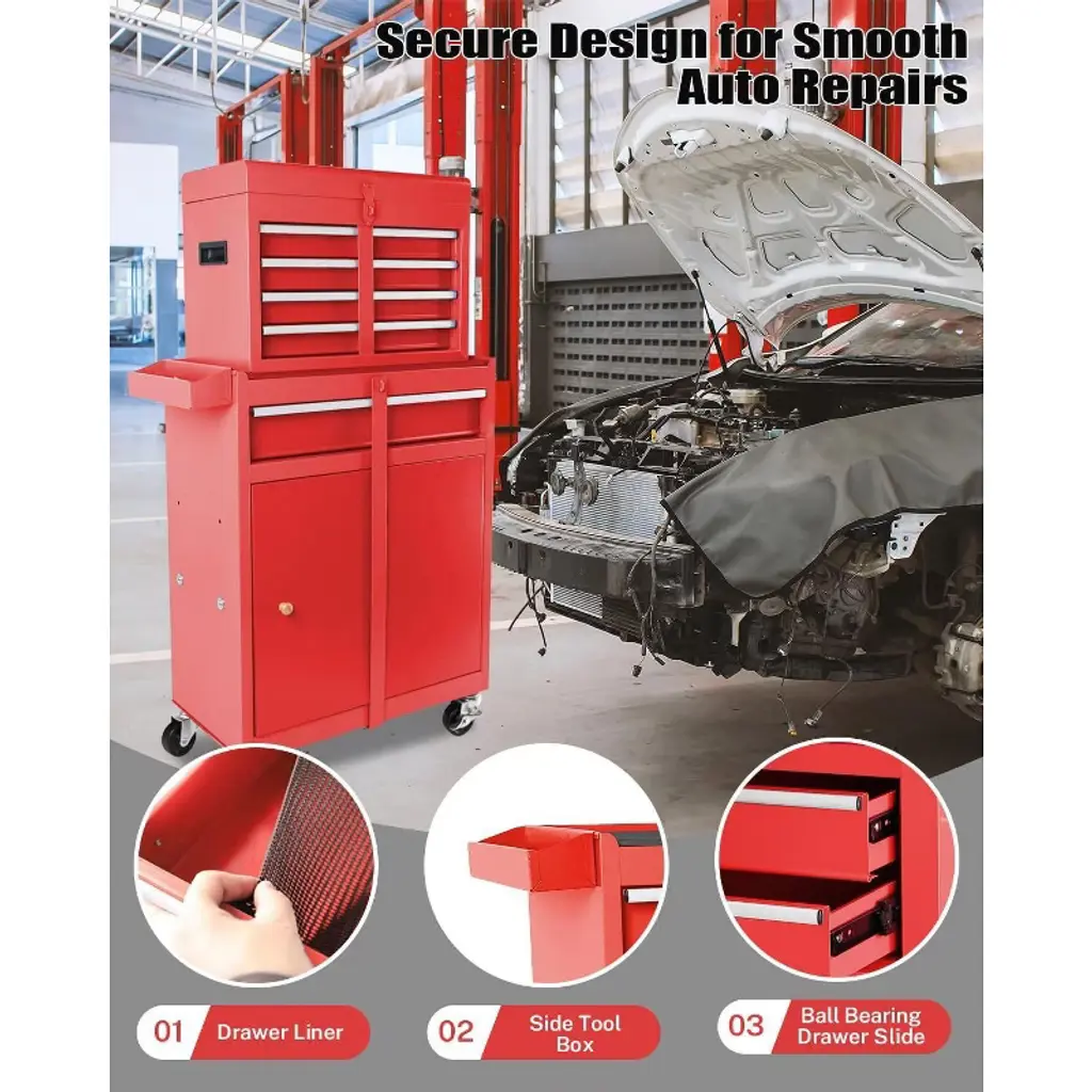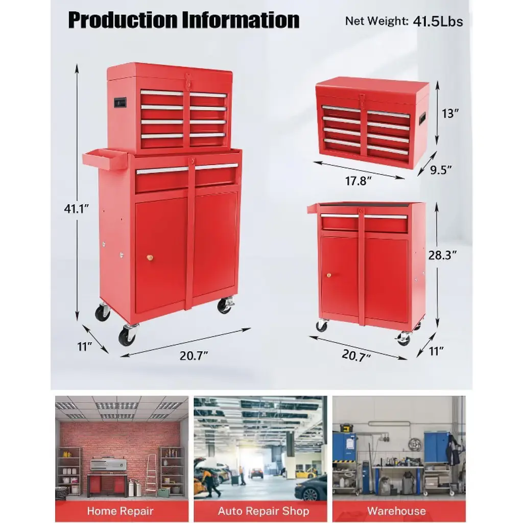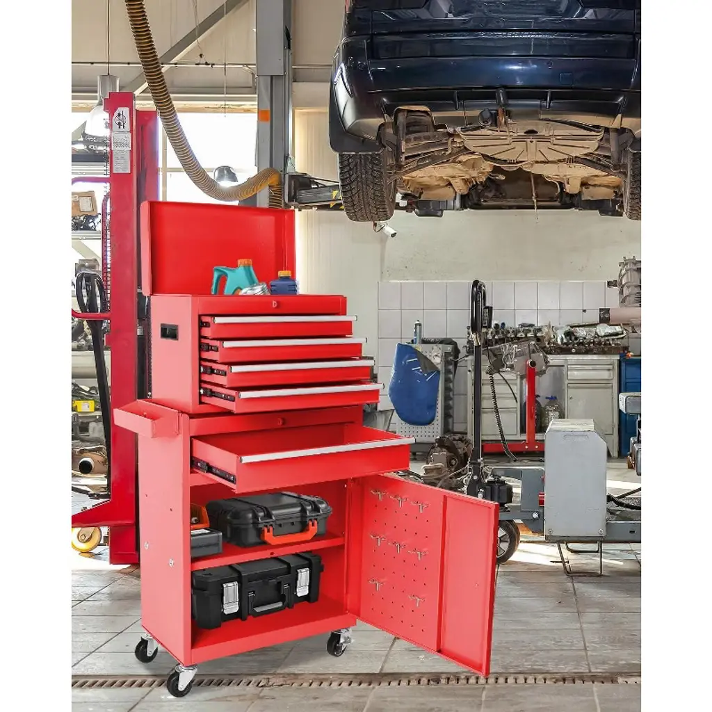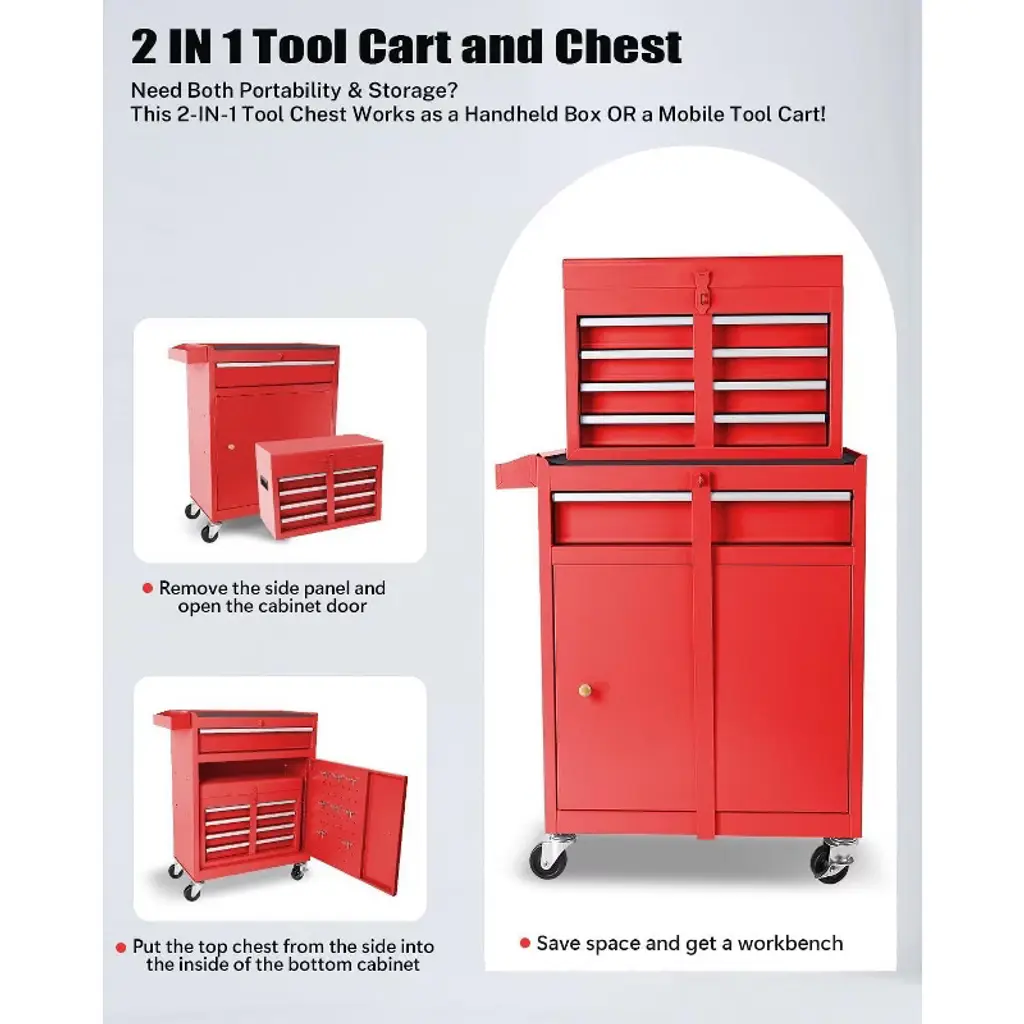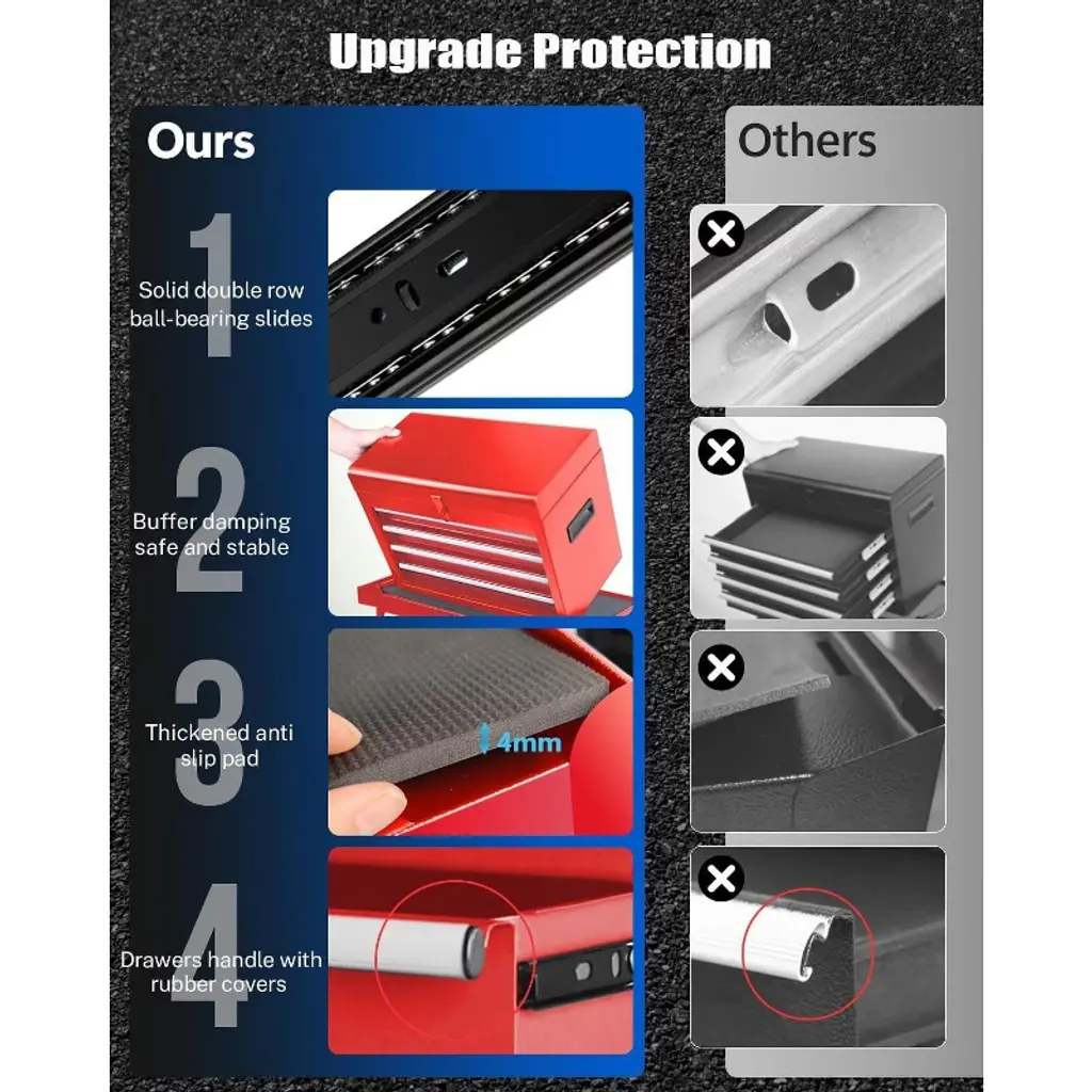 Your Complete Mobile Workshop Solution Tired of wasting time searching for tools? This heavy-duty 5-drawer rolling tool chest keeps your workspace organized and efficient, whether you're in a professional shop or home garage. Built with industrial-grade powder-coated steel, it withstands daily use while resisting rust and wear. The stainless steel work surface doubles as a sturdy workbench for repairs and projects, giving you the perfect spot to assemble parts or lay out tools. Need to move your tools around? The four smooth-rolling wheels (two locking) let you easily push the chest wherever it's needed—from your garage to the driveway or between job sites. When it's time to work in one spot Organization is simple with five removable drawers (available in 2" and 3" heights) that fit everything from bulky wrenches to small screws. Plus, with seven additional storage bins, you'll have plenty of space for accessories like drill bits, nails, or electrical tape. The lockable drawers keep your tools secure, while the non-slip work mat protects delicate surfaces from scratches.