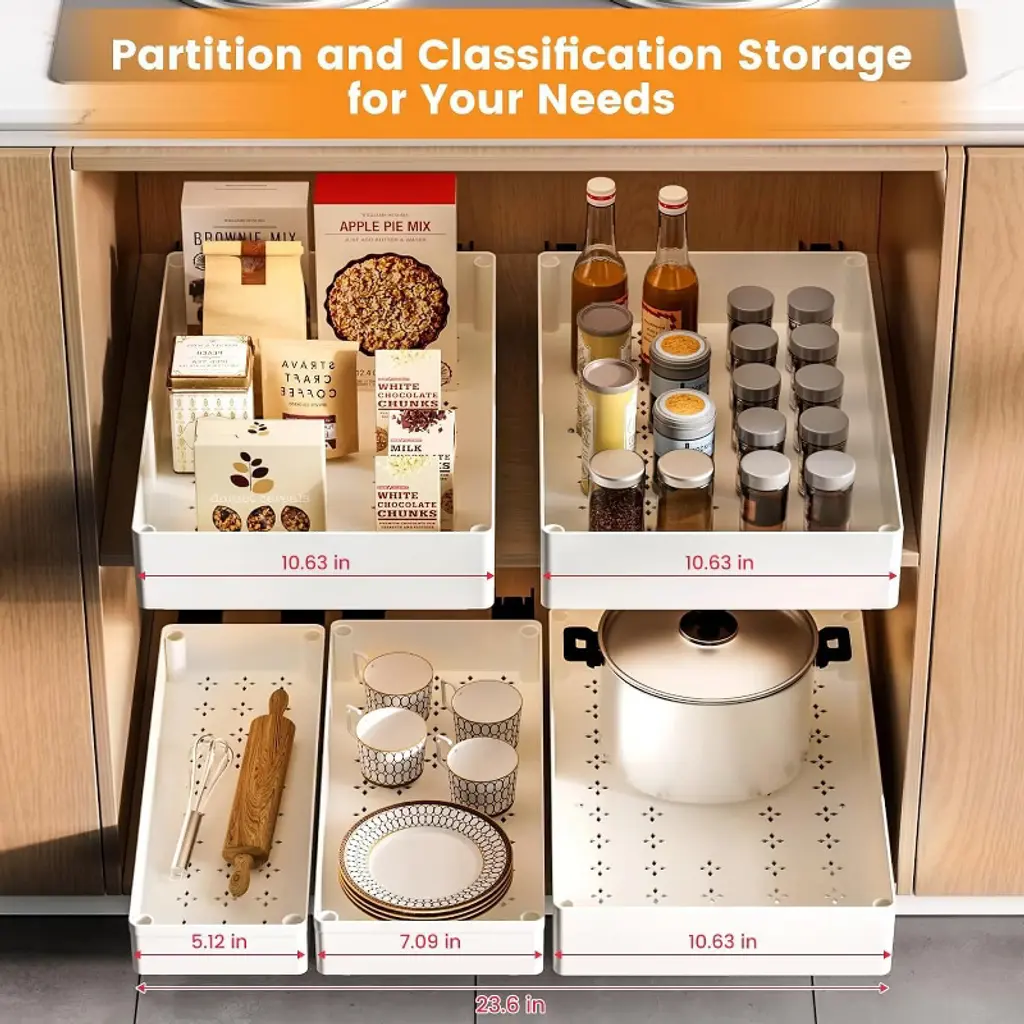 explain: Product Name: Pull Out Cabinet Organizer Materials: Plastic Style: Modern and minimalist Number of layers: 1 layer Pattern: Solid color Color: White Packing list: 1pc/3pcs Pull Out Cabinet Organizer