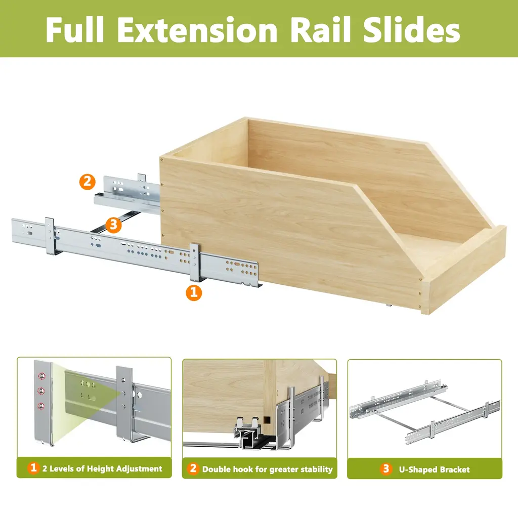 【Ergonomic Design】We understand that one size does not fit all. Therefore, we've designed this 8-inch tall pull out drawers with doubled side and back heights, forming a wrap-around shield to prevent taller items from toppling off your shelves. Perfectly engineered for double stacking cans in your pantry, 8-inch tall birchwood rim in a tapered shape to firmly secure larger items【Easy Assembly】The pull out shelf arrives fully assembled. All you need to do is attach the slide rails to the base or existing full-shelf of your cabinet. A mounting template and all the necessary hardware are included. These pull-out racks simplify your life, making them an ideal choice for your kitchen, pantry, bathroom, closet, or laundry room.(NOTE: Pull-out drawers are mounted on the bottom【Accurate Size】Please ensure you measure the width and depth of your cabinet accurately before purchase. This pull out home organizer fits a 24-inch wide cabinet. Minimum clear width: 20 inches (measured from the hinge); minimum clear depth: 24 inches; minimum clear height: 9 inches【Superior Quality】This pull out kitchen storage cabinet features Hard-close full-extension ball bearing slides, rated for 100 pounds. Constructed from high-quality birch and oak with a natural transparent coating, it's sturdy and built to last. The pull out basket also boasts a natural, elegant color and texture, striking a perfect balance between utility and aesthetics in your kitchen storage solutions【Warranty & Service】If you are not satisfied with the pull-out rack received, feel free to contact us. We guarantee prompt resolution of all your concerns