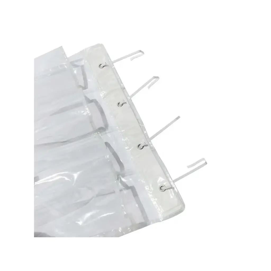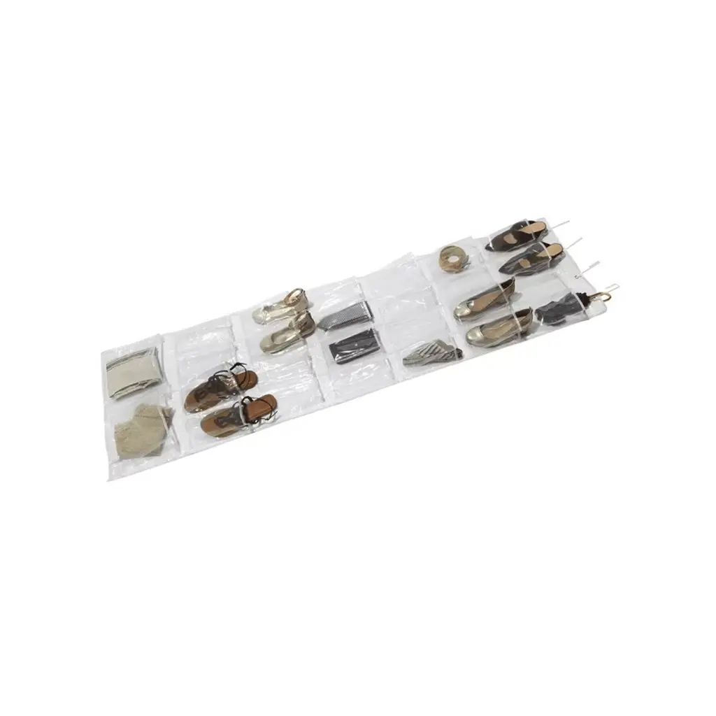 26-Pocket over-the-door Hanging Shoes Organizer made with clear PEVA fabric. This is a good choice for you to display your favorite footwear. It gives user more storing space with less room. This space-saving shoes organizer could easily attach with any size door by using the metal hooks. Adults, teenagers or seniors could use it to store shoes, accessories and something else. This organizer has 26 pockets. They divided to 24 standard pockets and two wider pockets down the bottom. Two bottom pockets feature wide openings that can easily accommodate a pair of shoes or other accessories and keepsakes. Besides, the clear construction allows you to identify the storing items fast and directly. Hence you can easily find whatever you need in the first time.