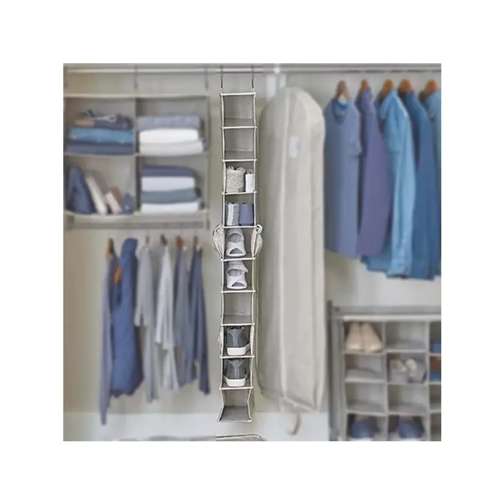 10-Shelf Hanging Closet Organizer for adult with 4 Side Pockets can help you use your closet space more efficiently. Crafted of durable gray fabric, this hanging organizer features ten storage compartments that are perfect for shoes, socks, and more and four side pockets with elastic band closures for sunglasses, scarves, gloves, and other items. This handy closet storage system comes fully assembled and ready to hang off of existing closet rods with sturdy metal hooks. The & Gardens 10-Shelf Hanging Closet Organizer with 4 Side Pockets is a great way to keep stored items neat, easily accessible, and off the floor.