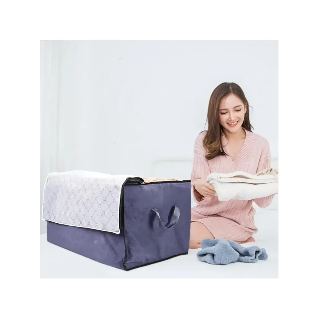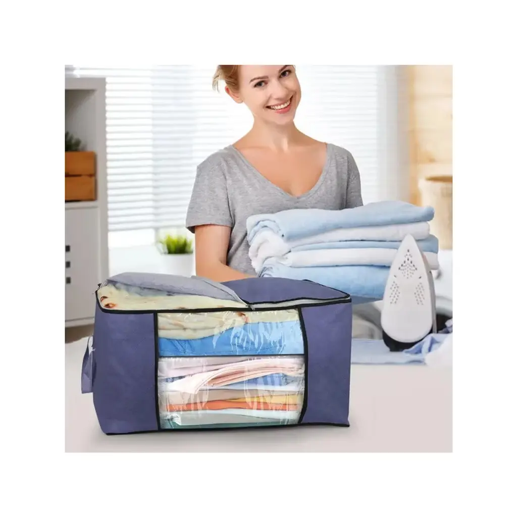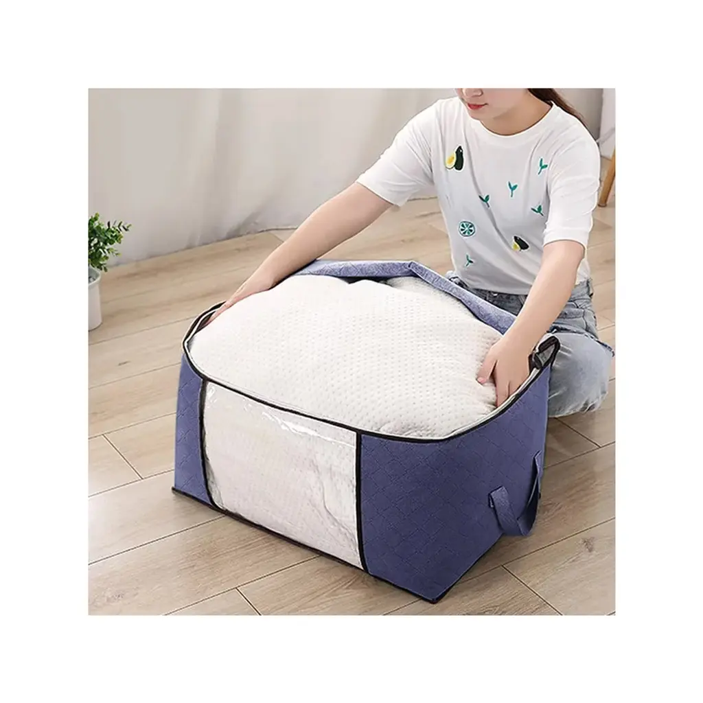 Keep Your Home Neat with Large Capacity*:The storage bag comes in a set of 2(Blue and Grey),and thew size of each bag is 60 x 40 x 35cm / 23.6x 15.7 x13.8 in,about 90L. It is spacious enough for your comforters,blankets,pillows,jackets,linens,holiday decorations,toys,photos,baby clothes or other clothes. **Dust-Proof and Moisture-Resistant with Premium Material*:Our storage bags are specially made with the highest quality,three-ply composite,non-woven fabric to ensure more durability and a sturdy form,as well as to promotes ventilation and protects your stored articles from moisture and dust. You don't need to worry about your comforter or clothes getting mildew. **Easy to Organize with Clear Window*:With a big clear window in the bag,you can see what¡¯s in it easily and take anything you want without opening it. It is so convenient for you to organize your clothing. **Convenient with Smooth Two-way Zippers*:Through the clear window,you can find anything easily,then you can also take anything conveniently with the two-way zippers. You can quickly take items from one side or the other without completely exposing all of your stored clothing. Additionally,Made from stainless steel,it is very sturdy and smooth to be used for extended periods. **Versatility in Many Places*:The clothes storage bag can be put in closet or under the bed in your house for its foldable feature. It also fits for attic,dormitory,bedroom,basement use and so on. In addition,it is very easy to stored when not in use because it can be folded.