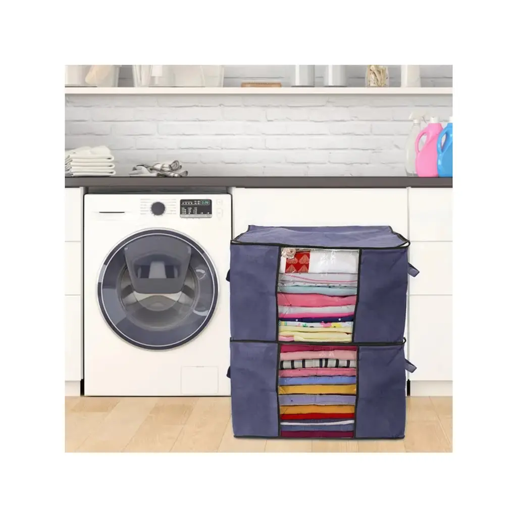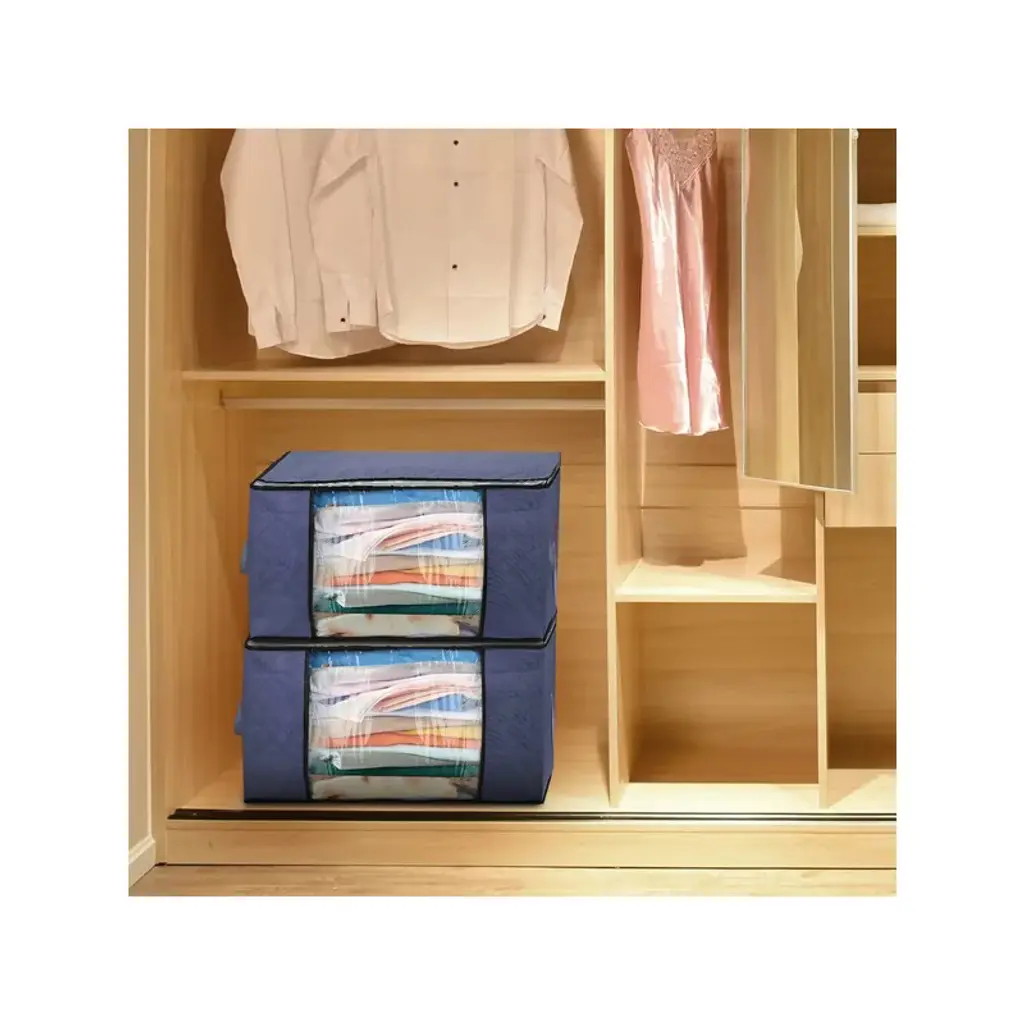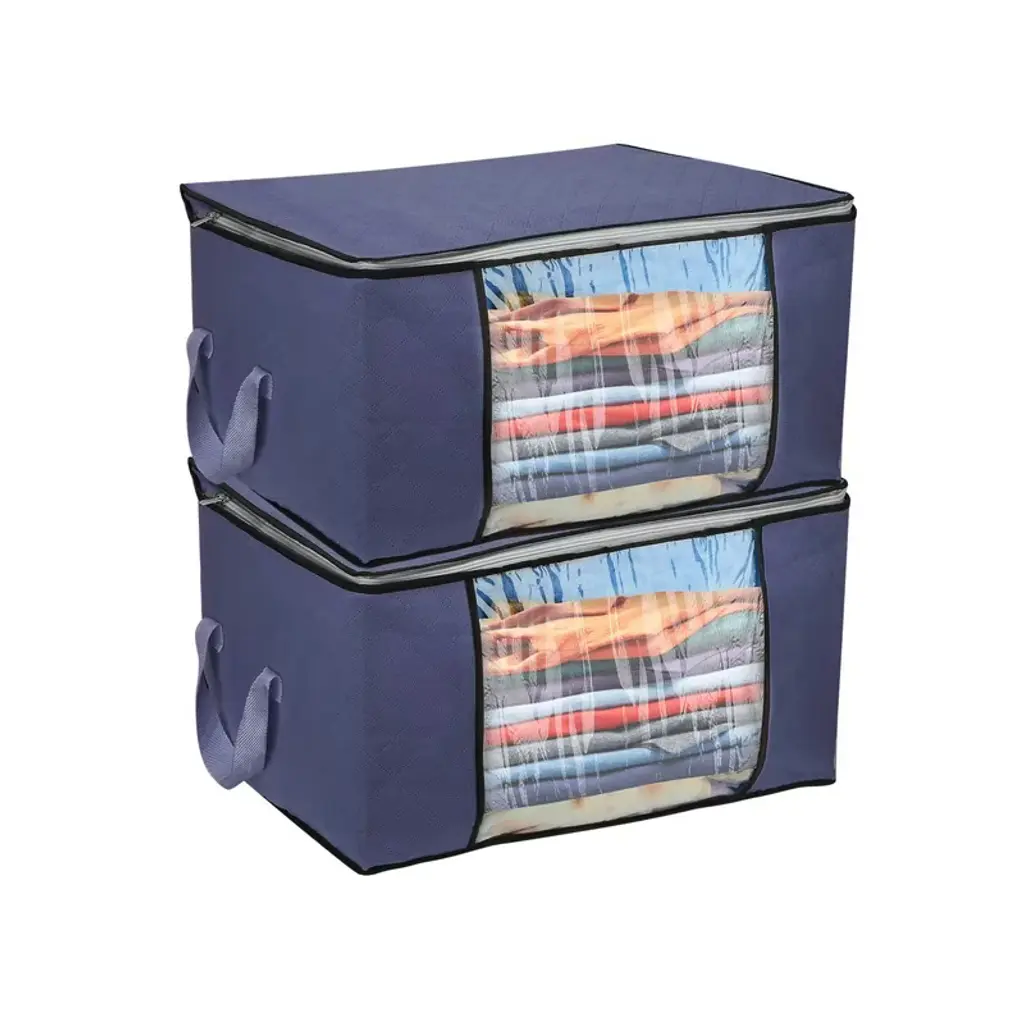 Racxily 2 Pcs Clothes Storage Bag, 90 L Large Capacity Foldable Closet Organizer W/ Thick Fabric Clear Window Dual-zipper ,Blue