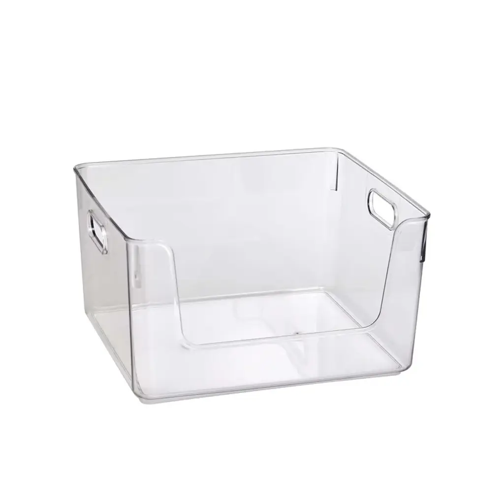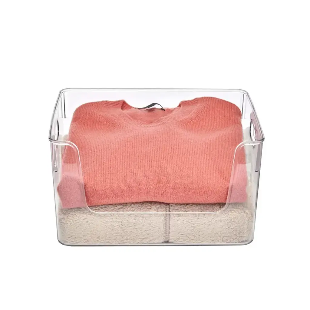 clear open front organizer bin is designed for adults. It has 2 handles which enable convenient delivery. You could easily take it anywhere. Stack-able design is good for saving space and organization.This is the ideal transparent storage solution for sweaters, accessories & more. Scoop front design for easy accessibility to retrieve items. The product is made of durable clear plastic, which allows contents easily to be viewed. It is also multi-functional as it could be used in pantry or anywhere. This organizer bin could fits perfectly into your closet, you will find your closet clean and tidy with this organizer!