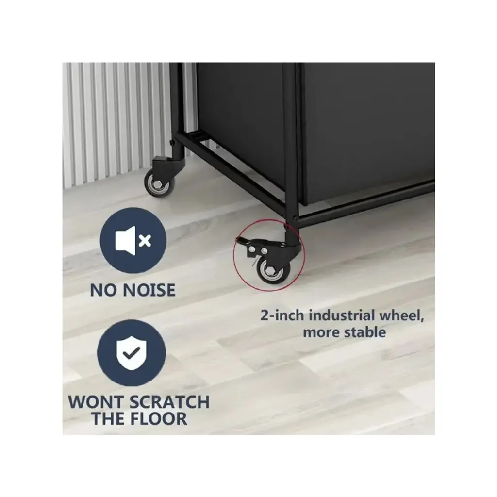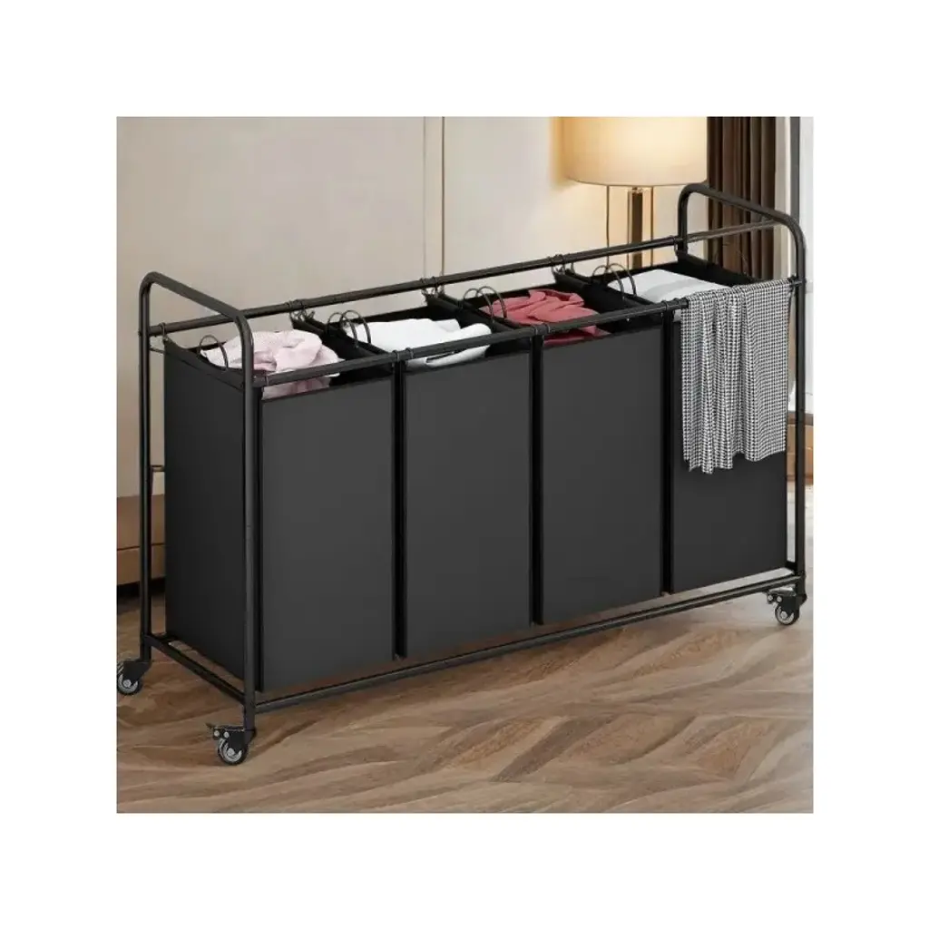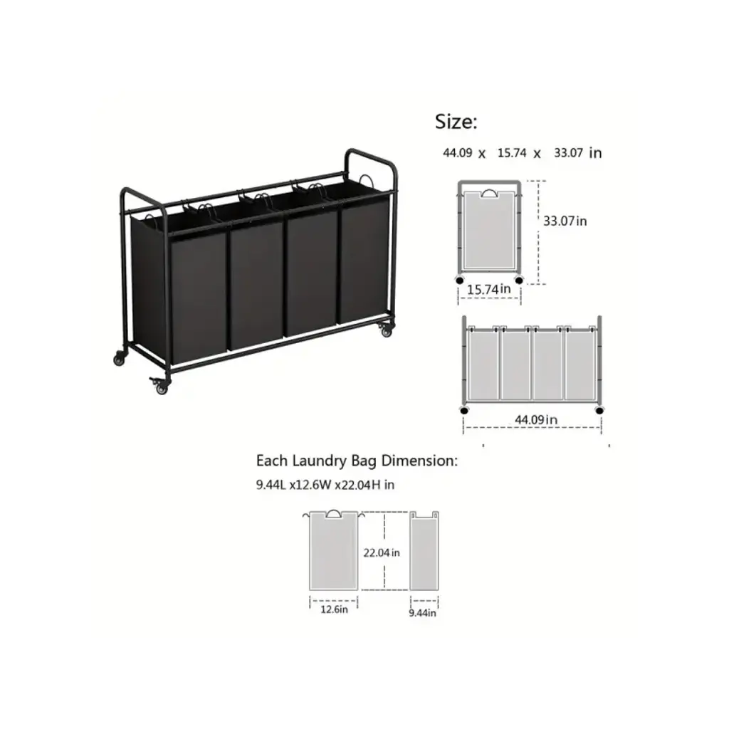 Keep your laundry routine organized and efficient with this 4-bag black laundry sorter hamper. Designed with a heavy-duty steel frame and smooth black finish, this laundry cart features four removable bags that make sorting laundry a breeze. Whether you¡¯re separating lights, darks, delicates, or towels, each compartment offers ample space and quick access. The cart rolls effortlessly on four swivel wheels, two of which lock for stability. Each bag is made from durable, easy-to-clean fabric and can be taken off for individual trips to the washer. Perfect for homes, dorms, or laundry rooms, this sorter