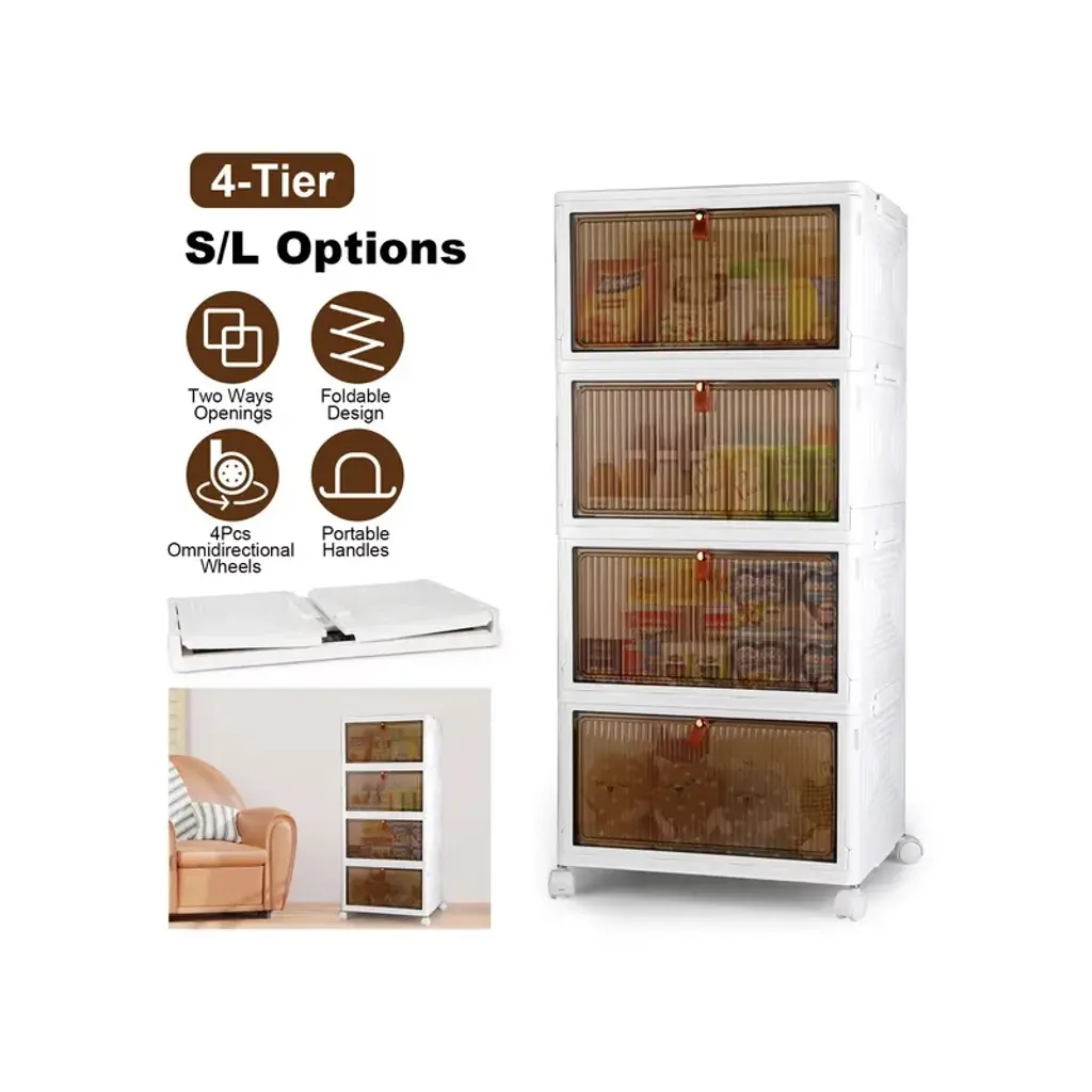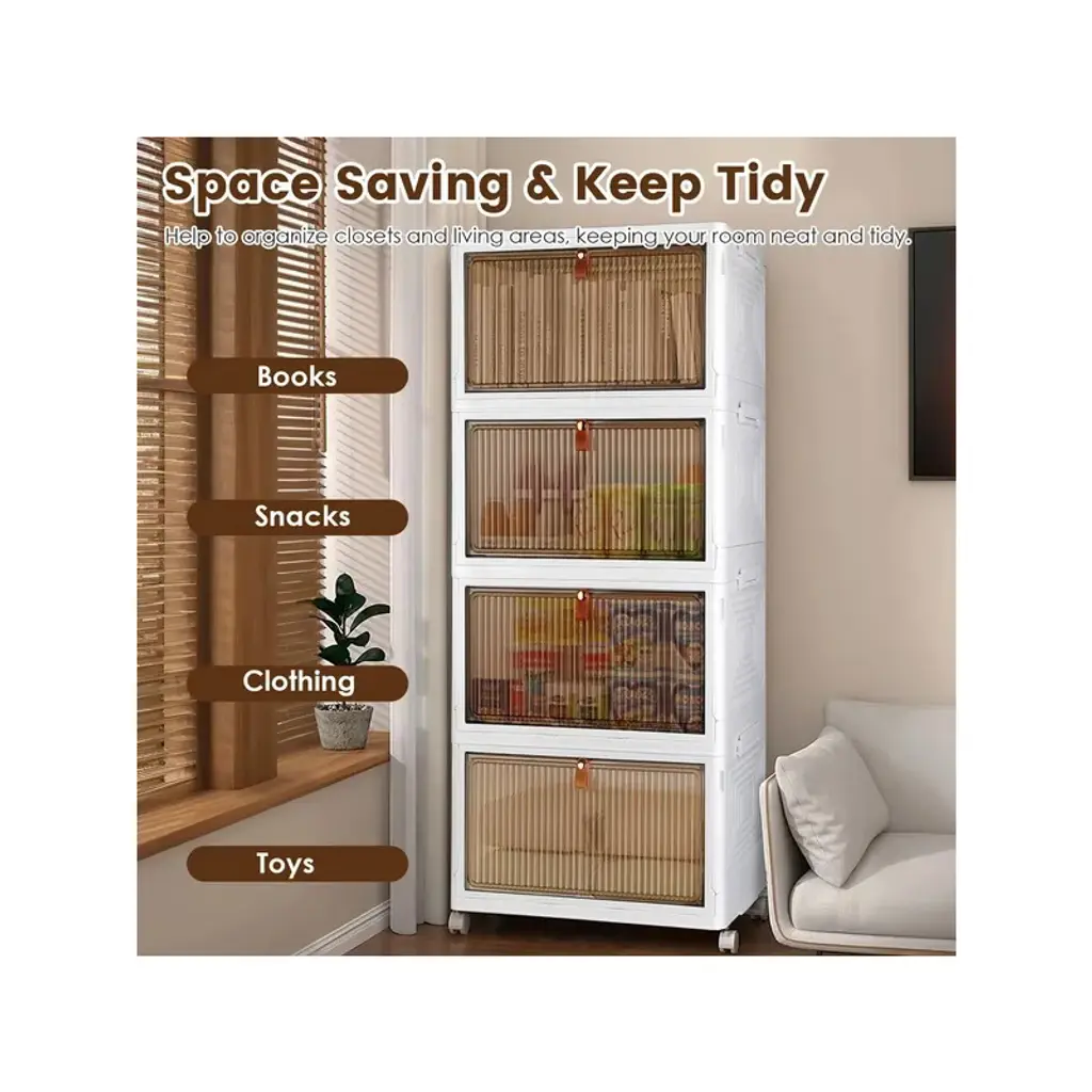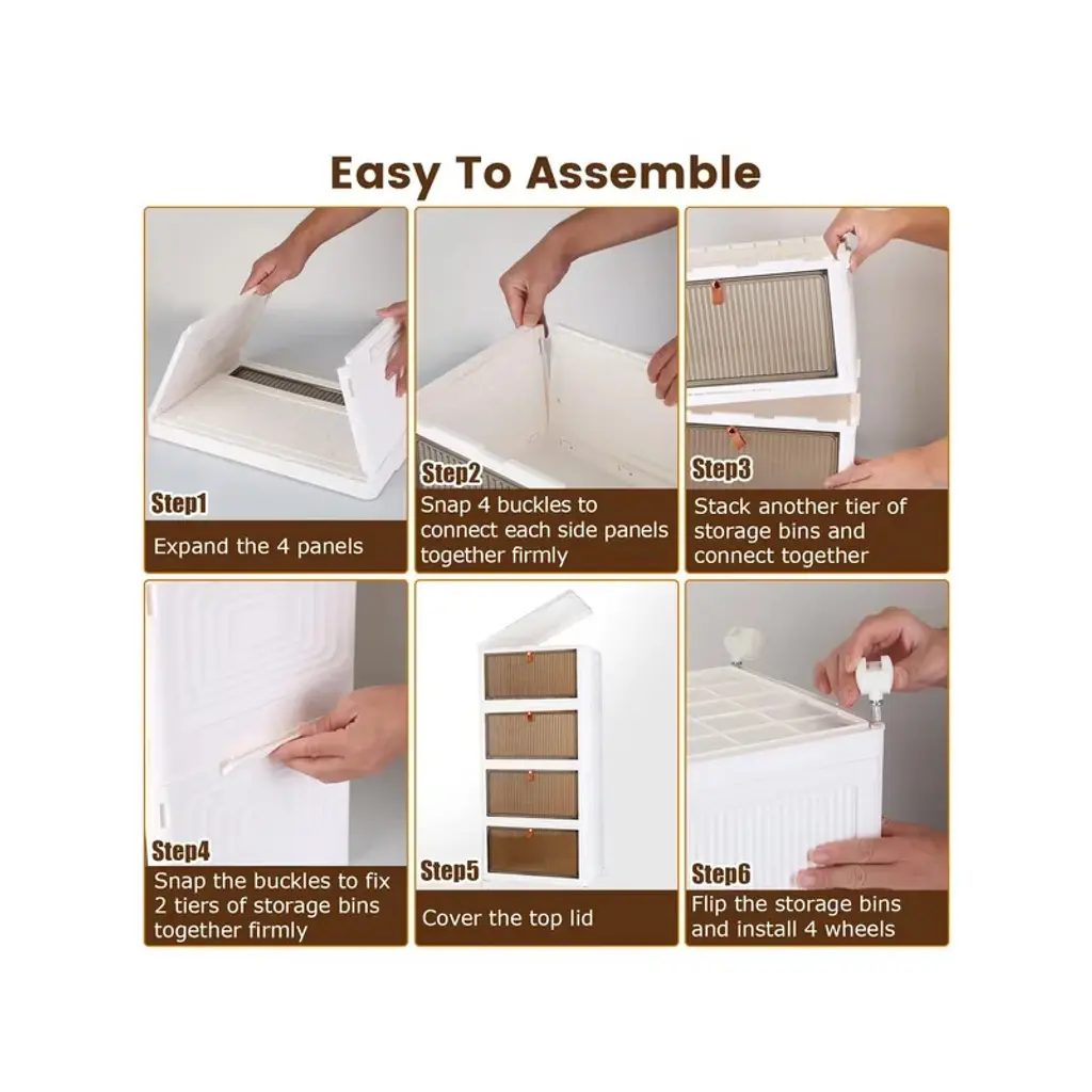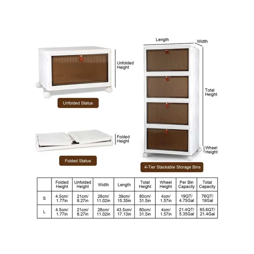 Easy To Use & Move*:Designed with magnetic door and handle,easy to store and take out items more conveniently. Comes with 4Pcs detachable 360¡ã rotatable wheels,which makes it easier for you to move it to any place in your house like from bedroom to living room. Besides,two wheels can be locked for stable standing in place. *Two Ways Opening*:Designed with a front door and a top lid,you can easily access to everything inside without having to pull everything down or removing the things on the top lid. Top cover keeps things from being exposed to dust. *Versatile & Spacious Storage Bins*:It only takes about 10 seconds to snap pieces together,assemble it quickly. With 4-tier design,it can hold about 76QT/85.6QT item. Can be used as bathroom organizer,kitchen organization,closet organizer,dog food storage container,food storage containers,laundry room organization,toy storage,car organizer,Christmas decorations clearance,bedroom storage,snack organizer,book bins,hat storage,shoe bins and etc.. Our storage bin will render you much more tidy and space saving. *Foldable & Stackable Storage Bin*:Easy to freely stack multiple tiers storage bins into multi-layer closet organizer according to your personal storage demands. The plastic storage boxes are foldable when not in use,effectively helping you maximize limited space and saving space in your home. *Exquisite Appearance*:The heavy-duty plastic storage containers for organizing the home featuring delicate beige shell,translucent brown door and leather handle,have a trendy appearance and keep your surroundings neat,clean,and functional.
