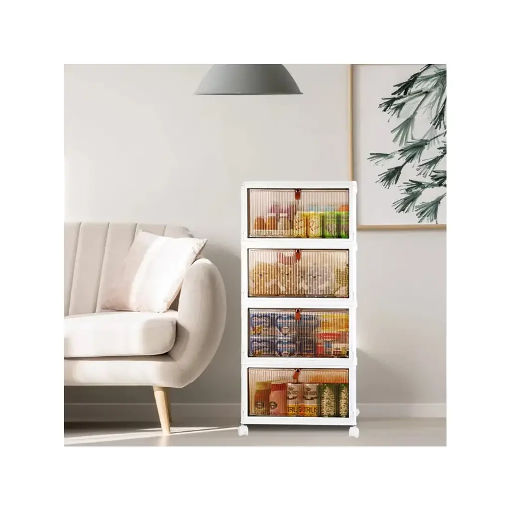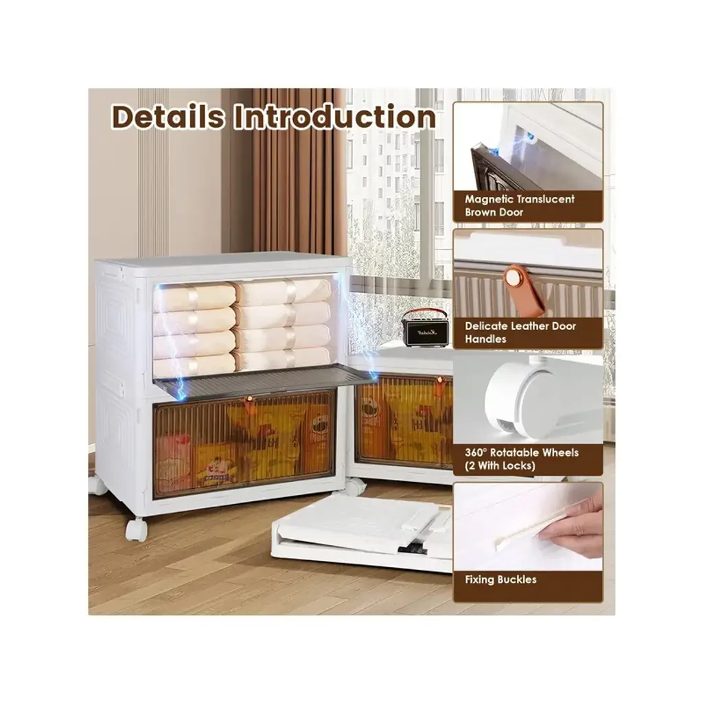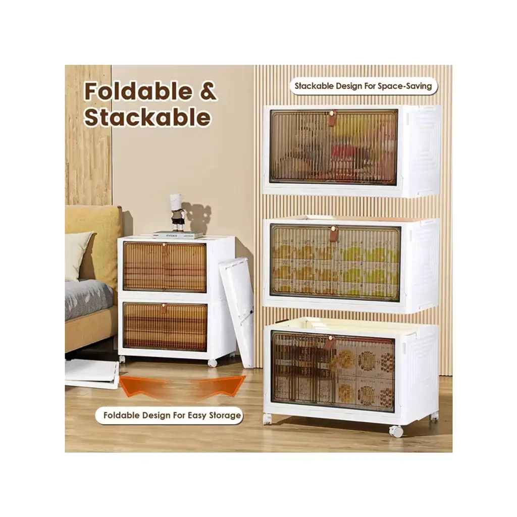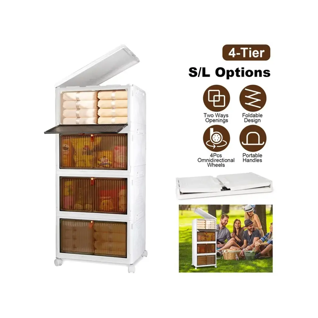 Easy To Use & Move*:Designed with magnetic door and handle,easy to store and take out items more conveniently. Comes with 4Pcs detachable 360¡ã rotatable wheels,which makes it easier for you to move it to any place in your house like from bedroom to living room. Besides,two wheels can be locked for stable standing in place. *Two Ways Opening*:Designed with a front door and a top lid,you can easily access to everything inside without having to pull everything down or removing the things on the top lid. Top cover keeps things from being exposed to dust. *Versatile & Spacious Storage Bins*:It only takes about 10 seconds to snap pieces together,assemble it quickly. With 4-tier design,it can hold about 76QT/85.6QT item. Can be used as bathroom organizer,kitchen organization,closet organizer,dog food storage container,food storage containers,laundry room organization,toy storage,car organizer,Christmas decorations clearance,bedroom storage,snack organizer,book bins,hat storage,shoe bins and etc.. Our storage bin will render you much more tidy and space saving. *Foldable & Stackable Storage Bin*:Easy to freely stack multiple tiers storage bins into multi-layer closet organizer according to your personal storage demands. The plastic storage boxes are foldable when not in use,effectively helping you maximize limited space and saving space in your home. *Exquisite Appearance*:The heavy-duty plastic storage containers for organizing the home featuring delicate beige shell,translucent brown door and leather handle,have a trendy appearance and keep your surroundings neat,clean,and functional.