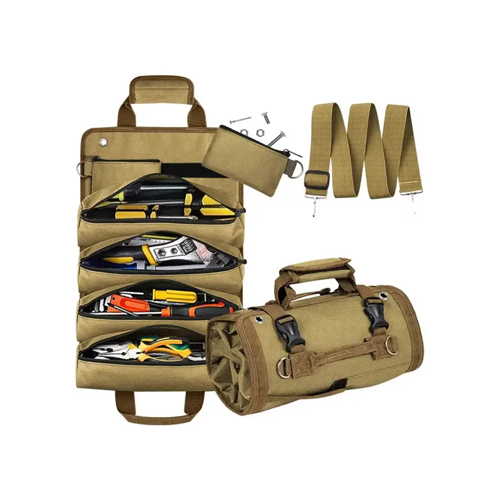 Racxily Roll Up Tool Bag, Heavy Duty Tool Organizer With 2 Detachable Zipper Pouches, Compact Durable Tool Storage, Camel