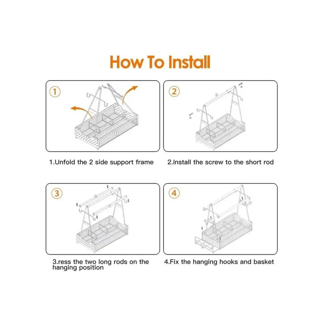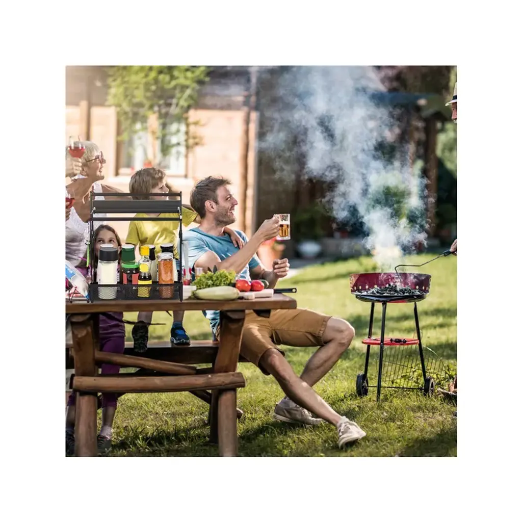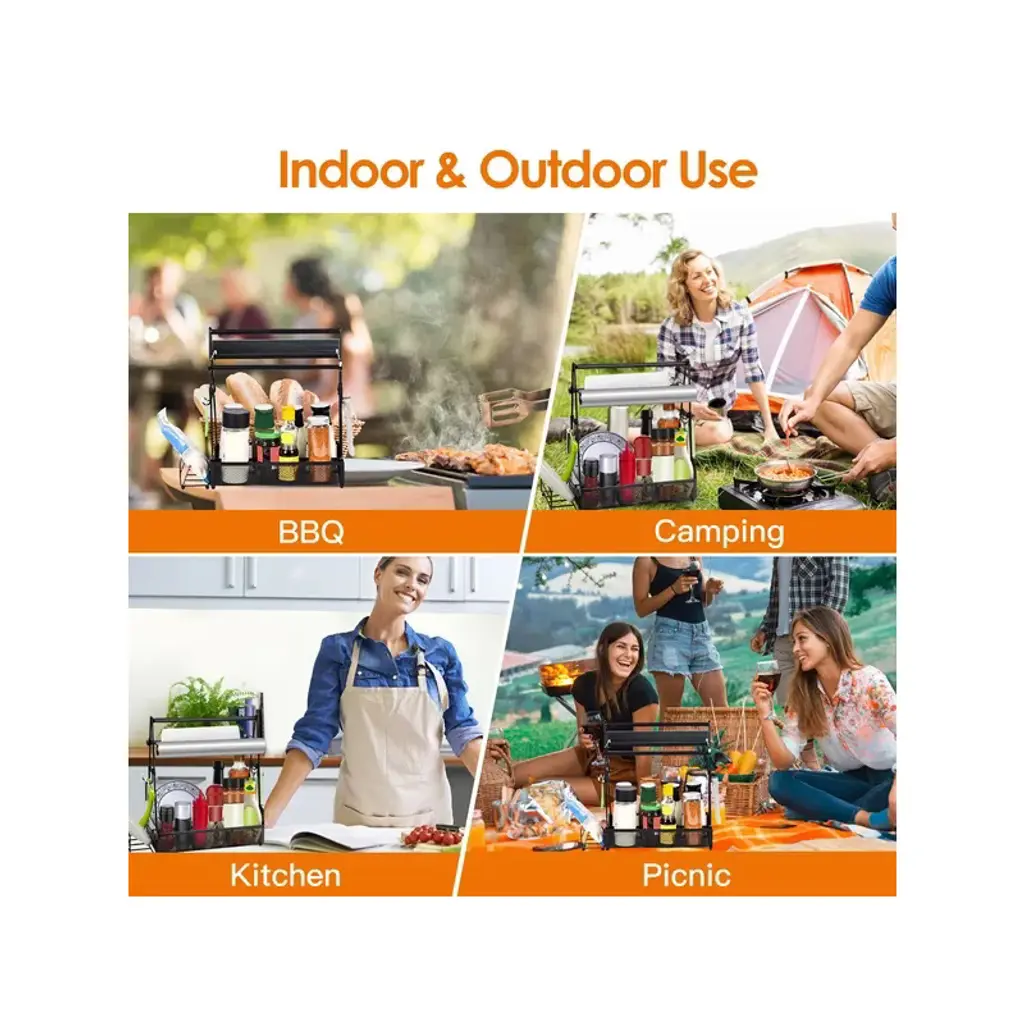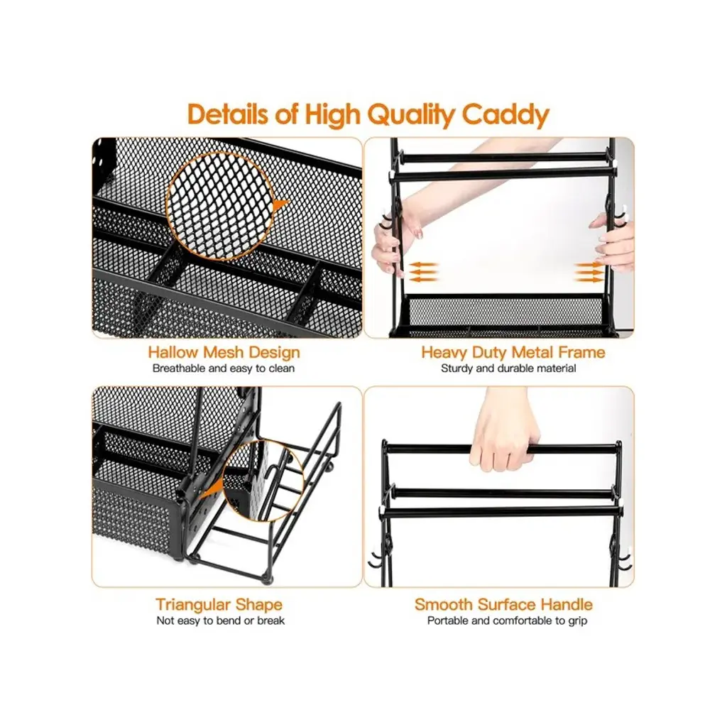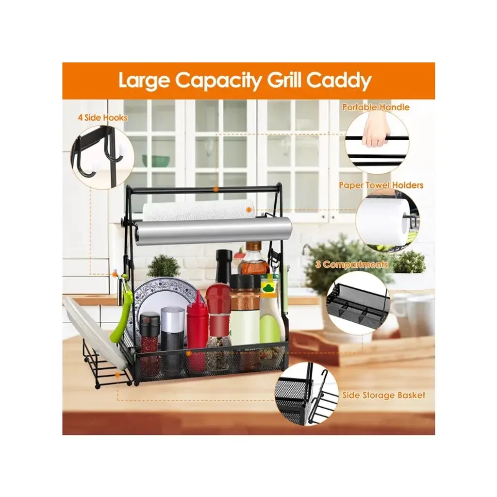 Large Capacity*:Composed of 2 paper towel holders,2 small side hanging hooks,1 side hanging basket and 4 compartments,our utensil caddy is designed to store different types of items. You can easily put all your kitchen and barbecue accessories all together in this large and economical grill caddy. *Stay Organized*:Enough of the clutter and chaos around the grill table? This metal grill caddy save available space for cooking and provides dedicated spaces to organize your essentials secure,neat and tidy in arm-reach area,make it much easier to fetch items you need instantly. Enjoy your funny grilling time with your friends and family without interruption! *Sturdy and Durable*:Made of heavy-duty iron frame,our utensil caddy is durable,sturdy and not easy to bend or break,can withstand multiple seasoning bottles,dishes,bowls and other heavy stuffs. A reliable companion for outdoor barbecue activities,ensure you long lasting service life. *Portable and Versatile*:Portable handle smooth surface give you comfortable grip experience,allow you to conveniently carry it to anywhere you want,like backyard,patio,beach,camping trip,RV. Not only a perfect choice for outdoor activities,but also an ideal helper for your indoor kitchen countertop. *Easy to Assemble*:No extra tools needed,you can quickly install this grill caddy in 2 minutes. Accessories are detachable,you can disassemble the unnecessary parts according to your demands. Breathable hallow mesh design is easy to clean. A must have grill tool for your indoor and outdoor activities.