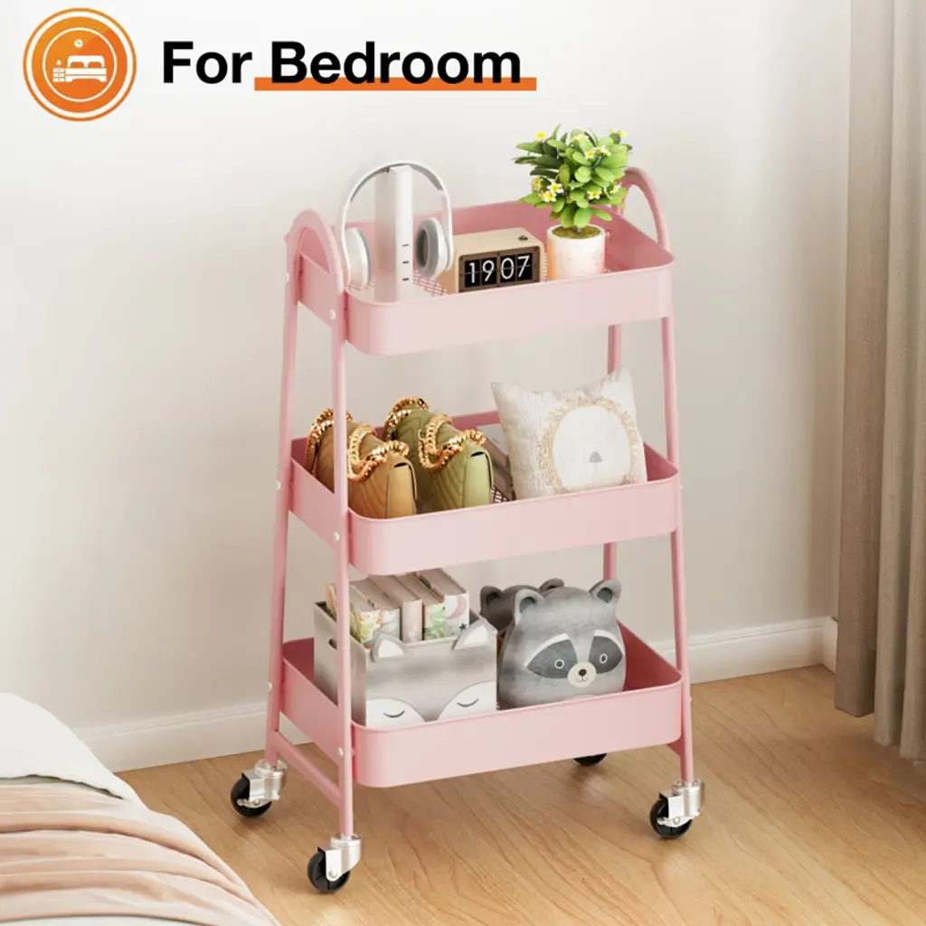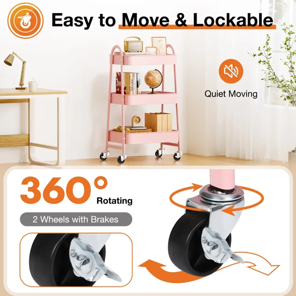 Rbied 3-shelf Metal Small Rolling Cart Pantry Organizer Snack Organizer Storage Rack With Wheels, Pink