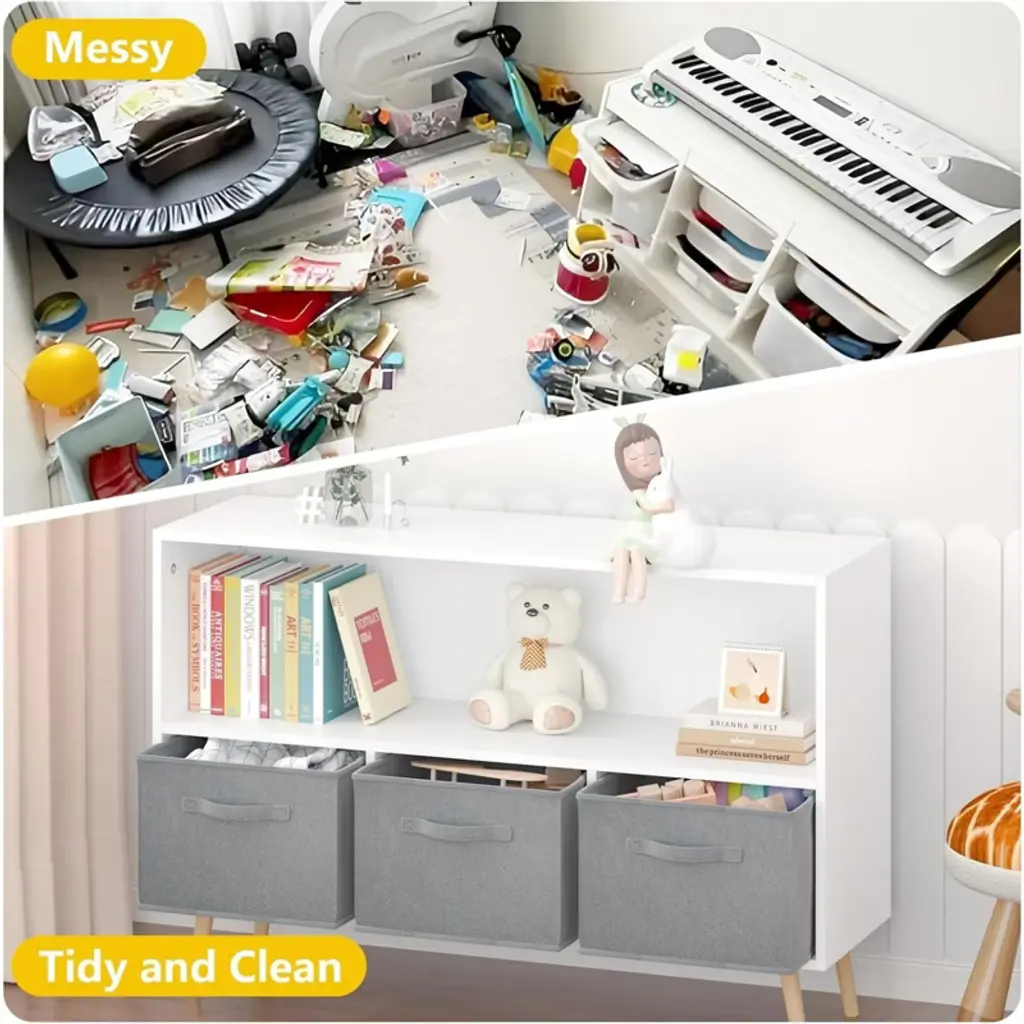 Maximize storage while keeping your child’s space clutter-free with the Kids Bookcase and Bookshelf. Designed for easy use, this versatile organizer combines collapsible fabric drawers and open cubbies to adapt to your toddler’s ever-changing needs.The 3 foldable fabric drawers offer instant, flexible storage for small toys, craft supplies, or accessories. When playtime ends, simply fold the drawers flat to reclaim floor space. Up top, the multi-tiered shelves keep books and decorative items neatly displayed and within reach, encouraging kids to explore reading independently.Built with parent-friendly simplicity in mind, the bookshelf assembles in minutes and moves effortlessly from playrooms to bedrooms thanks to its lightweight frame. Its compact design fits snugly in tight spaces like hallways or under windows, while the rounded edges and sturdy wood construction prioritize safety for curious little ones.Perfect for busy families, this storage solution grows with your child—use it as a nursery bookshelf, a toy organizer for playdates, or a stylish display rack in shared living areas. Simplify cleanup, inspire organization, and add a modern touch to any room with this practical, easy-to-use centerpiece for your child’s world.