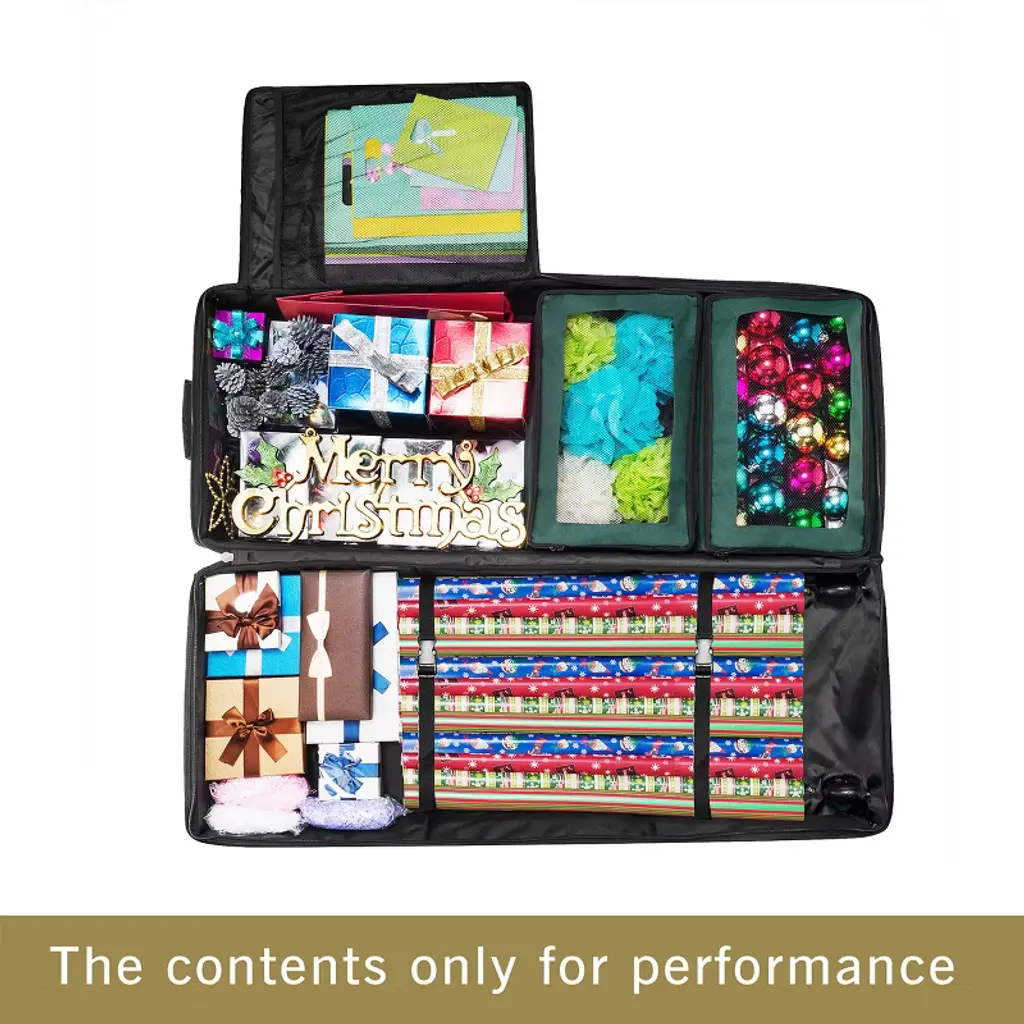 Store, organize, and transport wrapping paper for every occasion inside this Rolling Wrapping Paper Organizer and Gift Wrap Station by Elf Stor. Designed to prevent gift wrap supplies from flattening and wrinkling, this paper organizer holds 30 to 40-inch wrapping paper rolls securely with a strap that keeps them in place and includes two removable storage bags and four mesh pockets for seamless storage of gift bags, ribbons, bows, and tissue paper alongside your gift wrap. Rollerblade wheels on the base make this paper organizer simple to move, even if you use the wrapping paper holder for stowing Christmas decorations.