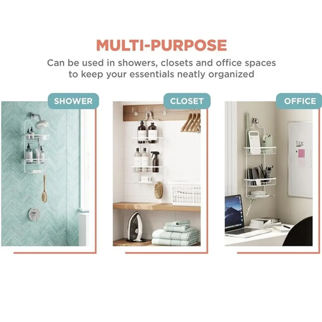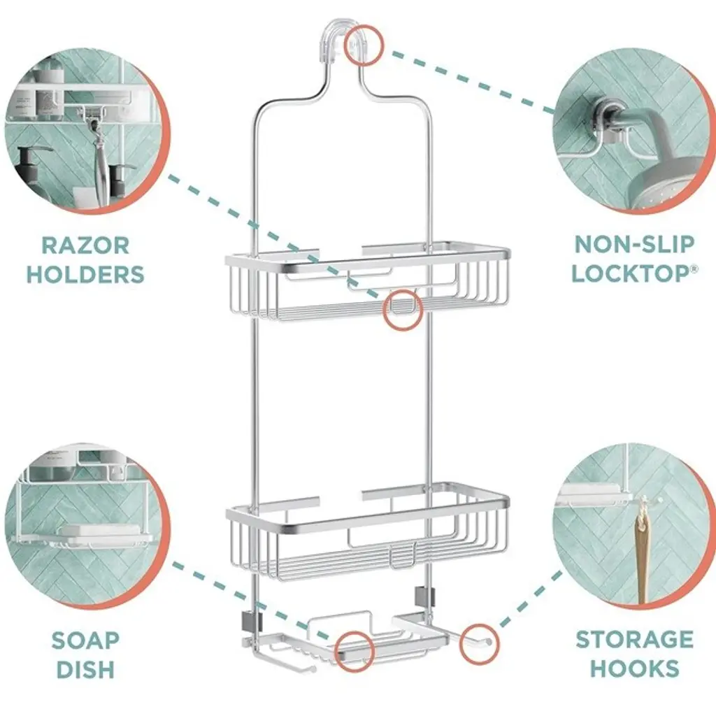 MULTIFUNCTIONAL SHOWER ORGANIZATION SOLUTION: This hanging shower tub has 2 spacious shelves with built-in inverted bottle organizer. Perfect for organizing a variety of bathroom essentials such as shampoo, conditioner, body wash and shower gel. RUST-RESISTANT ALUMINUM CONSTRUCTION: This shower head hanging basket is made of lightweight and durable rust-resistant aluminum, strong and durable. Guaranteed to last effortlessly in high humidity bathroom environments. EFFECTIVELY ORGANIZE YOUR BATHROOM: Keep your shower space neat and tidy with this above shower head organizer. Includes hooks and holders for razors, towels and more. Ideal for keeping all your shower essentials and accessories neatly organized. OPEN WIRE DESIGN FOR QUICK DRYING: The open wire shelf ensures that water drains away quickly, keeping your shower essentials dry and preventing mold and mildew from growing. Easy to clean with just a damp cloth for easy maintenance and optimal shower storage. EASY AND SAFE INSTALLATION: The unique locking top system allows for secure installation on any standard shower head. No tools are required for installation; the included Allen wrench ensures a stable, wobble-free installation and reliable performance.