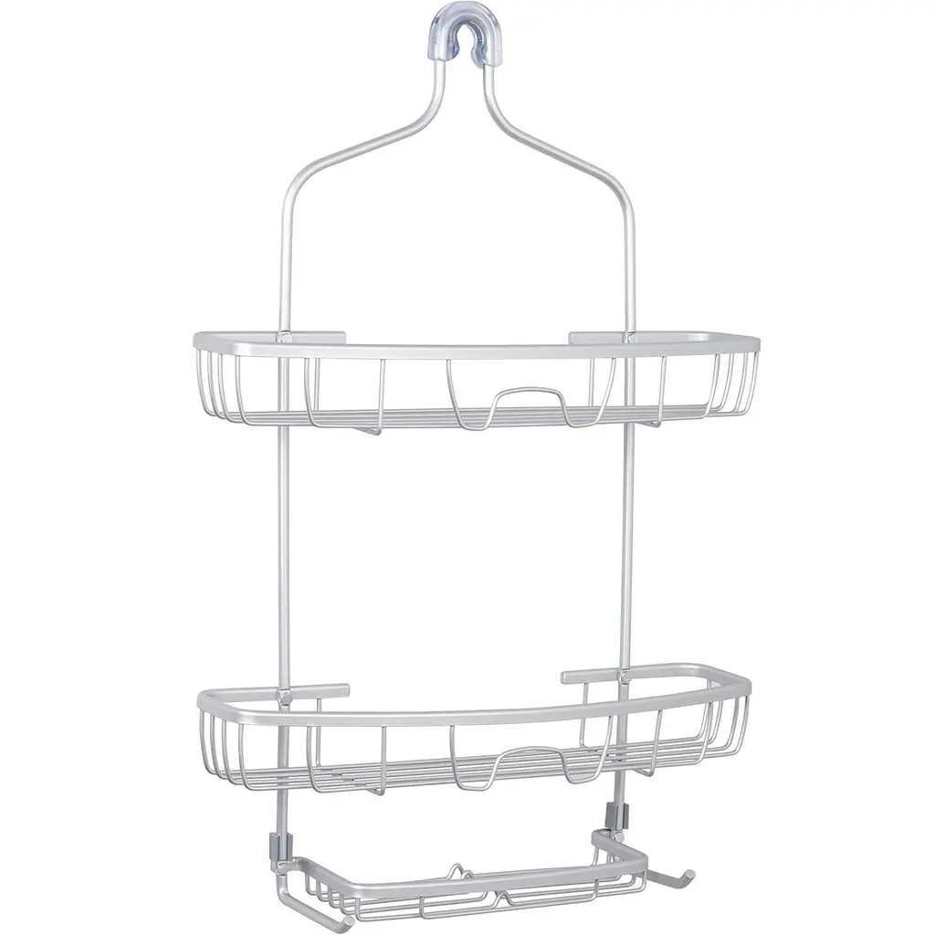 Rustproof Shower Bucket Hanging Bathroom Organizer Aluminum Shower Rack With 2 Shelves And Built-In Hooks - Satin Chrome