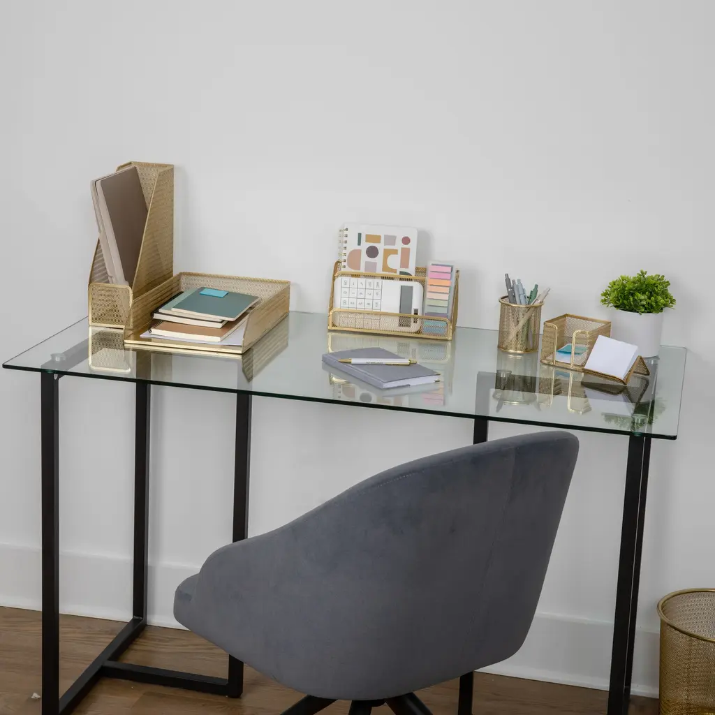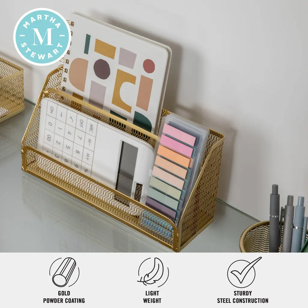 When your work at home tasks demand a great deal of your time, the Martha Stewart Six Piece Desktop Organizer Set will ensure your work space is organized and inspiring. Satisfying environmental cues can direct your energy toward productivity, creativity, and staying on task by keeping essential items within reach. This metal mesh desktop set serves multipurposes by providing you with an attractive and efficient solution for keeping important files, papers, and office supplies in a dedicated, organized place. Pair this timeless organizer set with other essentials in the collection for a chic and cohesive look in your remote office.
