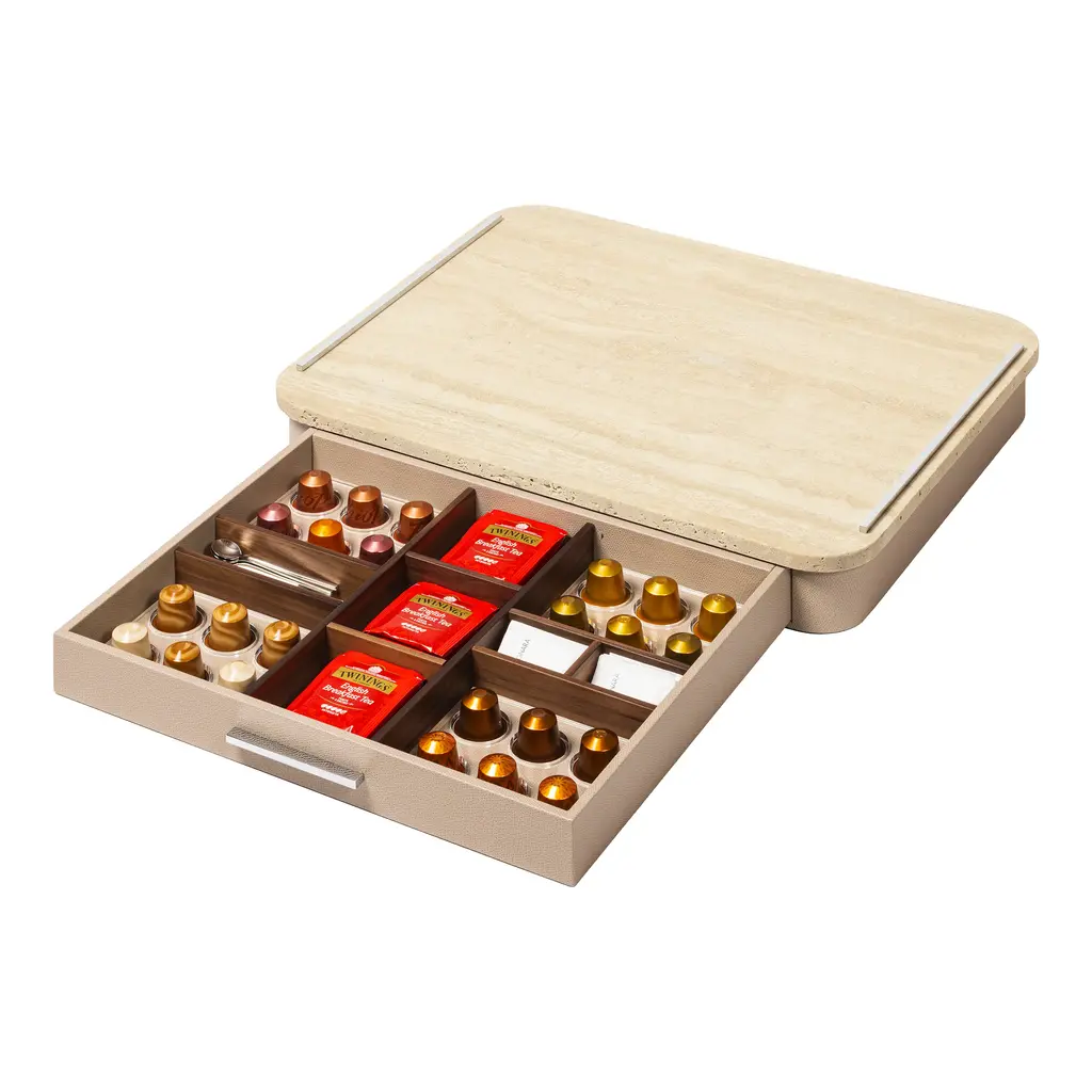 Inspired by the chic Parisian cafes of its namesake, the Saint Germain Drawer Organizer from Giobagnara transforms your countertop into a private coffee atelier. Expertly handcrafted in Italy, this piece features a leather-wrapped wooden structure with a top of luxurious marble, Corian, or matching leather. The drawer reveals a meticulously organized interior of walnut wood partitions, with dedicated compartments for Nespresso capsules, tea bags, and spoons—the ultimate expression of a refined, everyday ritual. Highlights: