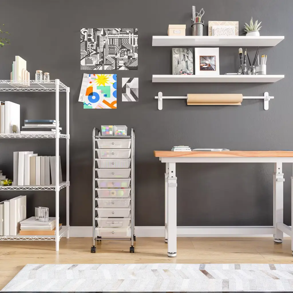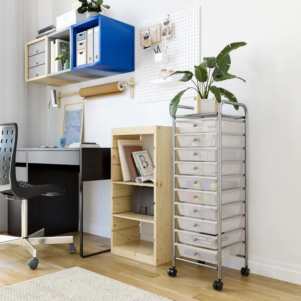 Save space with Seville Classics 10-Drawer Organizer Cart. Constructed with industrial-strength steel finished in chrome, the cart features tall, easy-to-grab handles and a removable perforated steel top shelf. Cart includes 10 removable polypropylene drawers and chrome finished drawer pull knobs; the interior of each drawer measures 13.63 in. long, 9.5 in. wide and 2.5 in. tall. That's deep enough to hold a ream of printer paper with space to spare. Each drawer can hold up to 3.3 lbs. while the top shelf can withstand up to 16.5 lbs. Remove drawers and re-order them as needed for an organization solution that works for you. Create an organization system for any room in your home. Use it as a makeup organizer or as arts and crafts storage. Fill it with notepads, binders, staples, and other supplies next to your desk as an office storage cart; the cart includes four 1.5 in. casters with two that lock, so the cart goes where you need and stays where you put it. This convenient organizer is ideal for use in the dorm room, classroom, office, bedroom, bathroom, kitchen, garage or workspace.