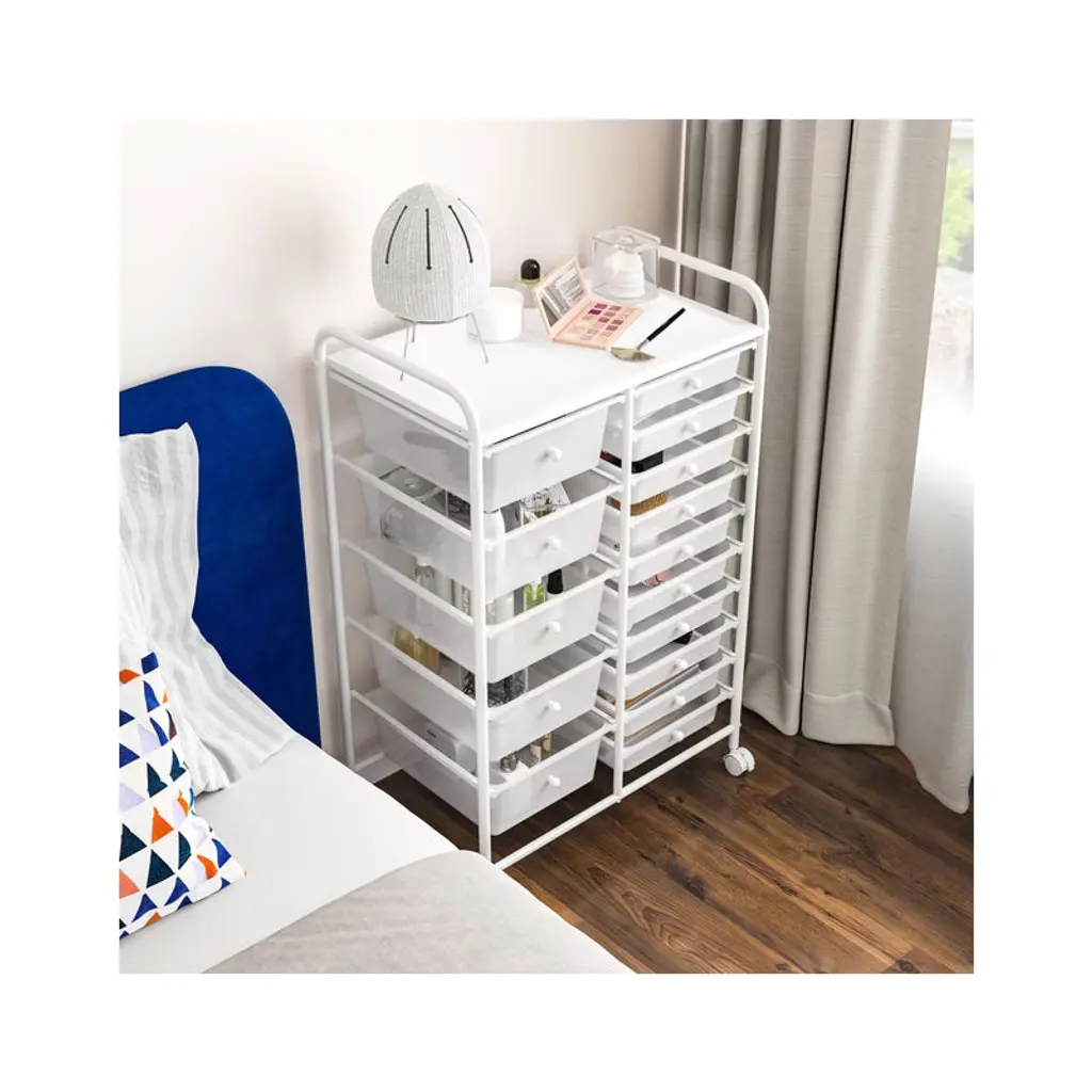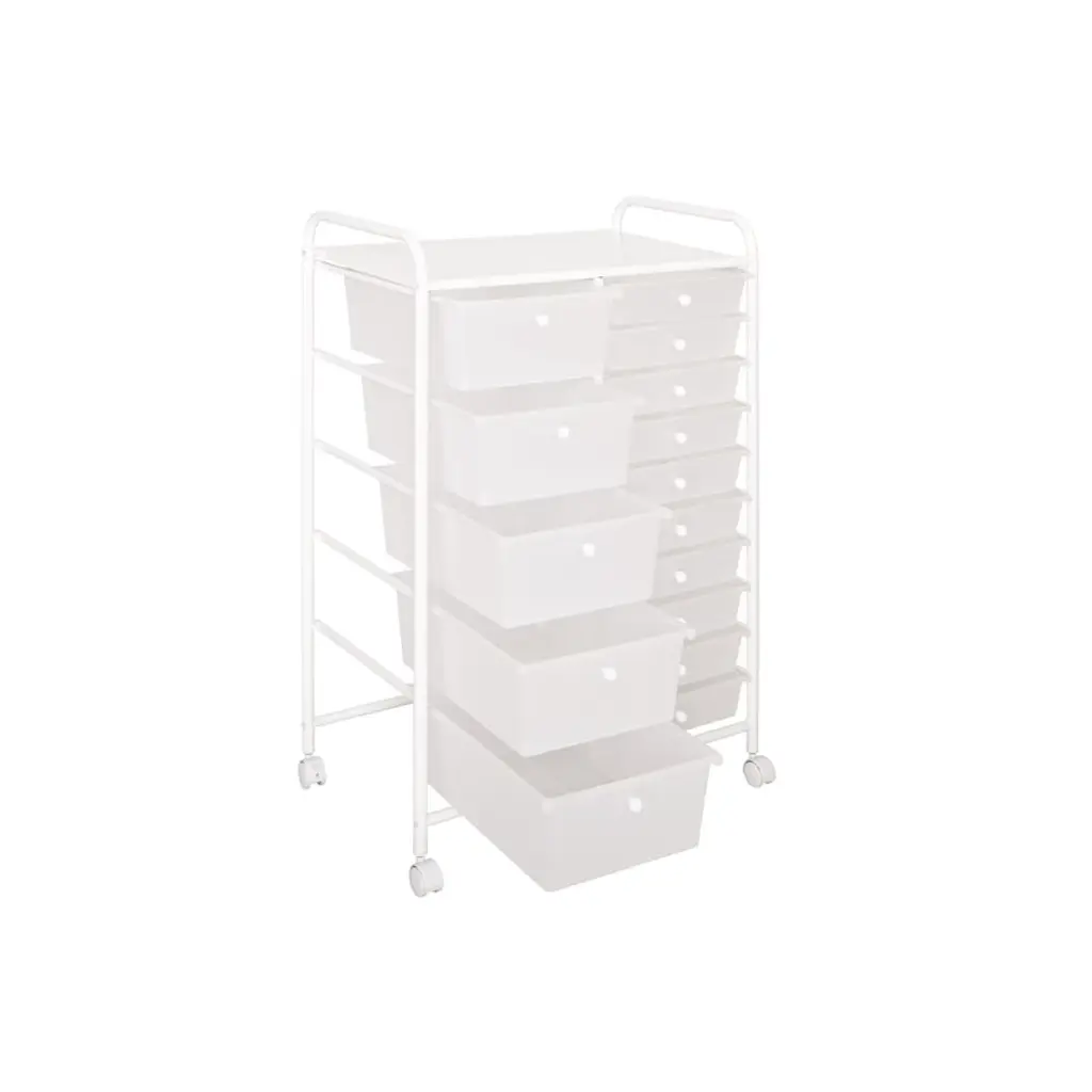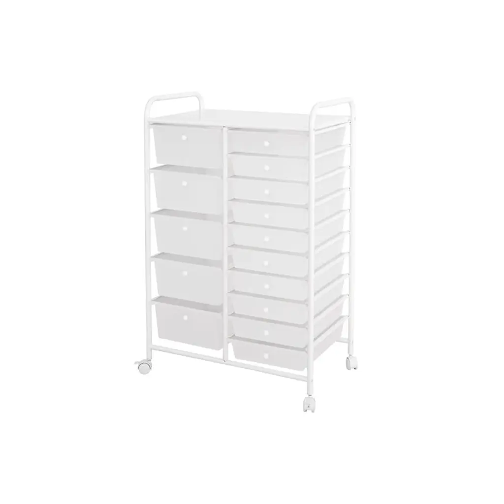 Save more space with this simple but stylish 15-Drawer Organizer Cart by Seville Classics. Constructed with industrial-strength tubular steel finished in chrome, the cart features tall, easy-to-grab handles and a removable perforated steel top shelf. Cart includes 15 removable polypropylene drawers in opaque Multicolor (Pearlized) with chrome drawer pull knobs. Get organized with 10 smaller drawers and 5 large drawer bins, making it perfect for storing both lightweight and bulky supplies. The interior of each drawer measures 13.5 inches long and 9.5 inches wide--deep enough to hold a ream of printer paper with space to spare. Each drawer can hold up to 3.3 lbs. while the top shelf can withstand up to 16.5 lbs. Remove drawers and re-order them as needed for an organization solution that works for you. Use it as a makeup organizer or as arts and crafts storage. Fill it with notepads, binders, staples, and other supplies next to your desk as an office storage cart. The cart includes four 1.5-inch casters with two that lock, so the cart goes where you need and stays where you put it. This convenient organizer is versatile and can be used in the dorm room, school classroom, office, bedroom, bathroom, kitchen, garage or workspace.