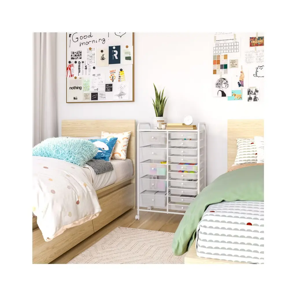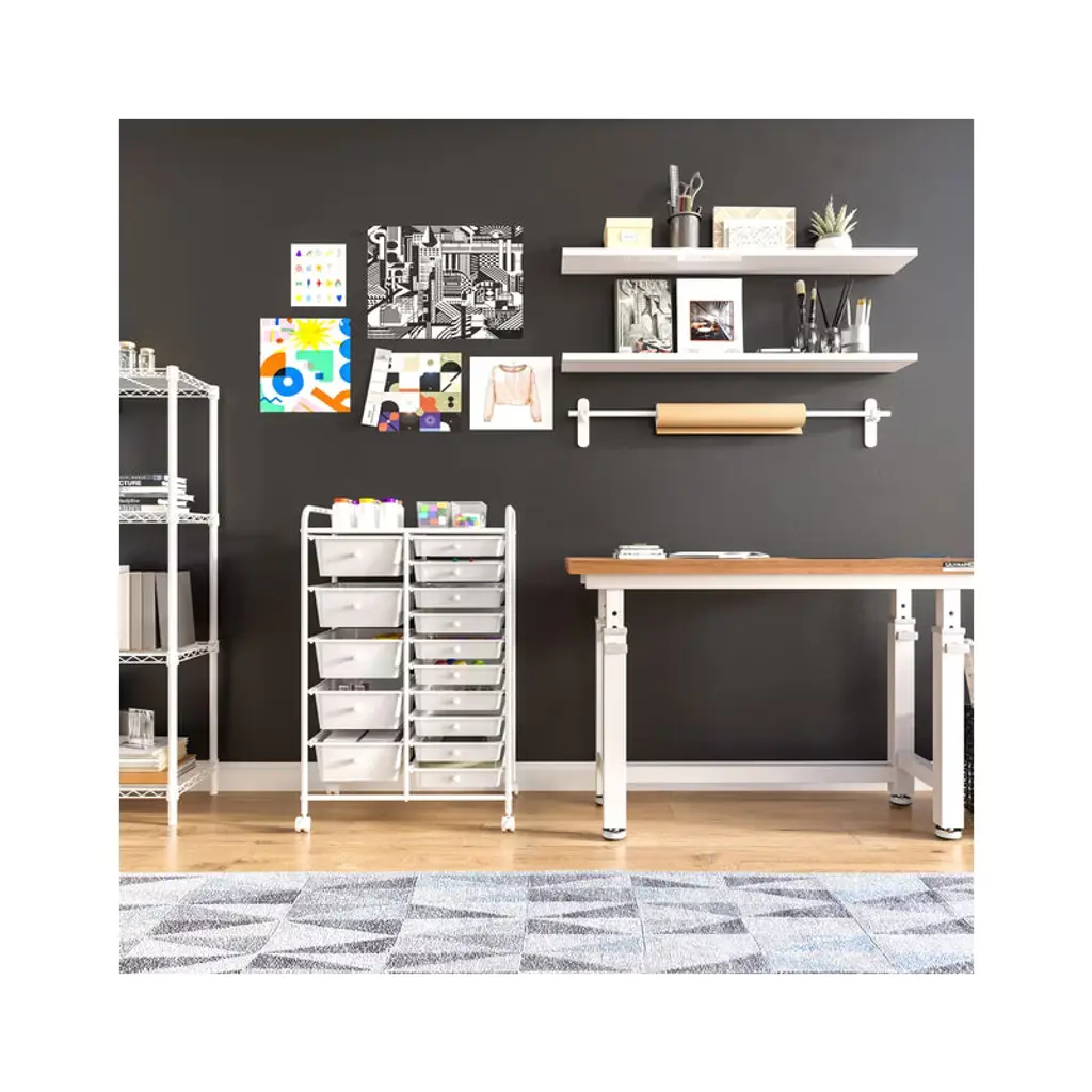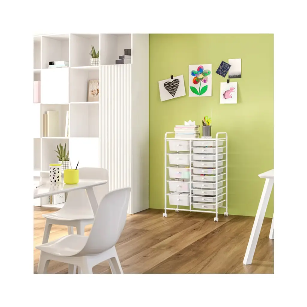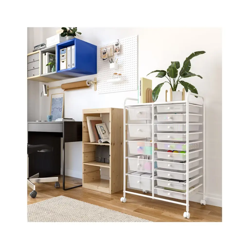 Save more space with this simple but stylish 15-Drawer Organizer Cart by Seville Classics. Constructed with industrial-strength tubular steel finished in chrome, the cart features tall, easy-to-grab handles and a removable perforated steel top shelf. Cart includes 15 removable polypropylene drawers in opaque Multicolor (Pearlized) with chrome drawer pull knobs. Get organized with 10 smaller drawers and 5 large drawer bins, making it perfect for storing both lightweight and bulky supplies. The interior of each drawer measures 13.5 inches long and 9.5 inches wide--deep enough to hold a ream of printer paper with space to spare. Each drawer can hold up to 3.3 lbs. while the top shelf can withstand up to 16.5 lbs. Remove drawers and re-order them as needed for an organization solution that works for you. Use it as a makeup organizer or as arts and crafts storage. Fill it with notepads, binders, staples, and other supplies next to your desk as an office storage cart. The cart includes four 1.5-inch casters with two that lock, so the cart goes where you need and stays where you put it. This convenient organizer is versatile and can be used in the dorm room, school classroom, office, bedroom, bathroom, kitchen, garage or workspace.