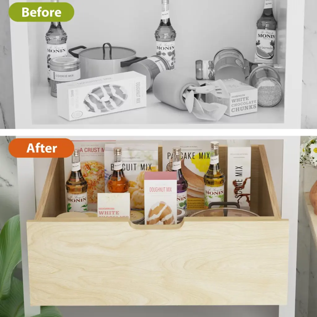 SEVOBAL Utility Storage Drawers offers a stylish and practical solution for kitchen organization. This pull out cabinet organizer features a protective design with doubled side and back heights to secure items while sliding smoothly on full extension rails for quiet and easy access. Crafted from high quality birch and oak this durable drawer adds elegance and function to any pantry or cabinet space.