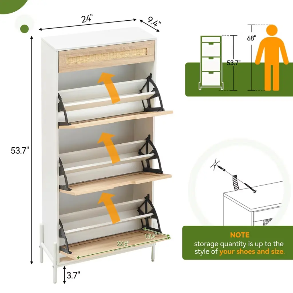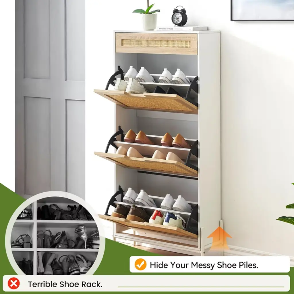 Shoe Storage Cabinet for Entryway, Rattan Shoe Organizer with Metal Legs, 3 Flip Freestanding Hidden Shoe Organizer for Hallway