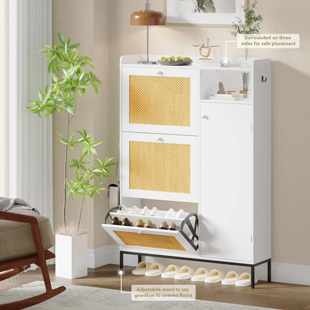 【Entryway Shoe Cabinet】This rattan hidden shoe cabinet with 3 flip drawers is stylish and minimalist, perfect for various home styles. Ideal for entryway, hallway, living room, or porch, it provides a neat looking in your home and space saving. 【Flip Drawers Shoe Cabinet】The modern freestanding shoe cabinet features space-saving flip drawers that are easy to open and close. Unlike regular shoe racks, this narrow shoe cabinet can fit in tight spaces, keeping your shoes away from dust and preventing pets from biting your shoes.The bottom flip drawer is specially designed for kids shoes to develop their organization skills. 【Large Capacity Shoe Cabinet】The drawer shoe cabinet can store up to 32-40 pairs. The left cabinet has 3 Flip drawers, each with two storage spaces. The panel can be adjusted or removed in two grooves to accommodate different heights and sizes of flats, mid boots or heels. The right cabinet has 2 adjustable shelves for storing women's knee-high boots or other items. Any shoes in the house can find a place in this shoe cabinet. 【More Thoughtful Designs】The bottom space can hold slippers or a sweeping robot and the 360° adjustable metal legs make the cabinet stable even on uneven floors. The top fence keeps items like plants, ornaments, socks, and keys safe from falling. The hooks on both sides can be used to store umbrellas or shoe horns. The unique silent cotton design ensures no noise when opening and closing the cabinet doors. Despite its narrow size, this shoe cabinet has complete and powerful functions. 【Safe and Reliable Quality】This slim shoe cabinet includes an anti-toppling device that can be fixed to the wall to prevent tipping and ensure child safety. Made of high-quality MDF wood and metal legs, the structure is stable, ensuring strong load-bearing capacity. The cabinet surface is waterproof and wear-resistant, making it easy to clean with a damp cloth. 【Easy to Install】Our packaging box comes with installation instructions and tools. Simply follow the instructions to quickly complete the installation. The specific installation time will depend on your situation. If you encounter any problems during installation or use, please contact us promptly, and we will provide a satisfactory solution.