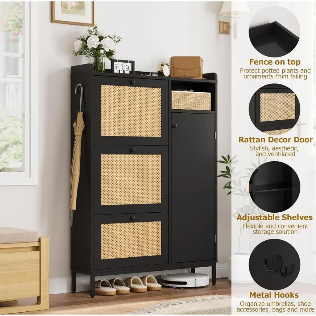 Shoe Storage Cabinet With 3 Flip Drawers, Rattan Hidden Freestanding Organizer With Adjustable Shelves,black