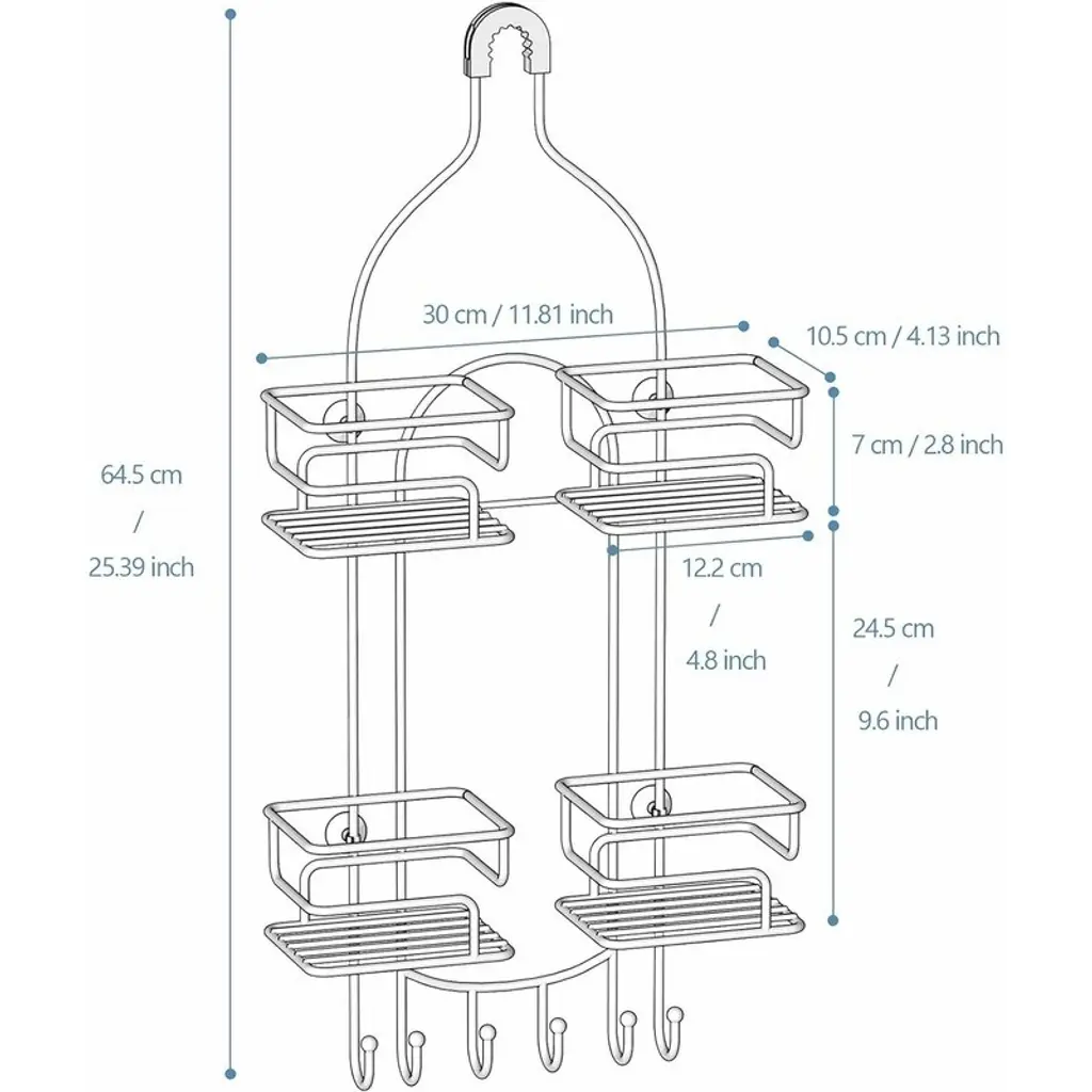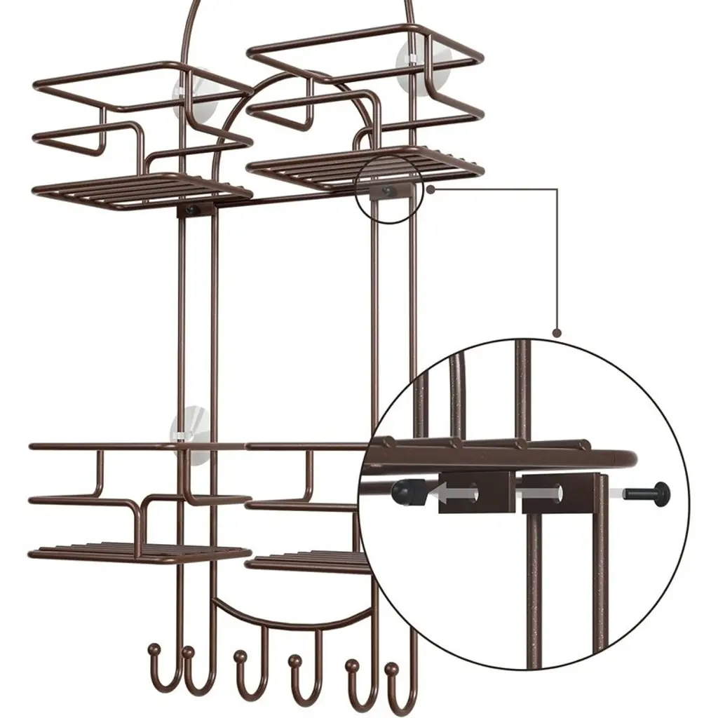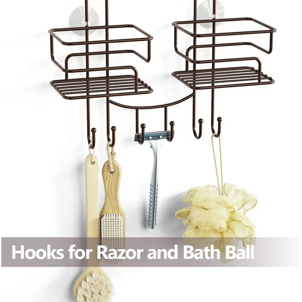 Organized 4-Basket System – Features symmetrical compartments to neatly sort shampoo, conditioner, and bath products—no more cluttered bottles. The streamlined design keeps essentials visible and accessible.Shower Hose-Friendly Split Design – Center opening accommodates handheld shower hoses, allowing them to hang freely without tangling or disrupting storage space.Rustproof & Quick-Dry Construction – Made of coated stainless steel with hollow drainage bases to prevent water buildup, reducing rust and mildew for long-lasting use.Ultra-Stable Mounting – U-shaped rubber collar fits most showerheads, while 4 suction cups (for smooth walls) and 6 bonus hooks keep it secure and sway-free.Tool-Free Installation – No drilling needed—just assemble, place over the showerhead, and secure with the collar and suction cups for instant organization.