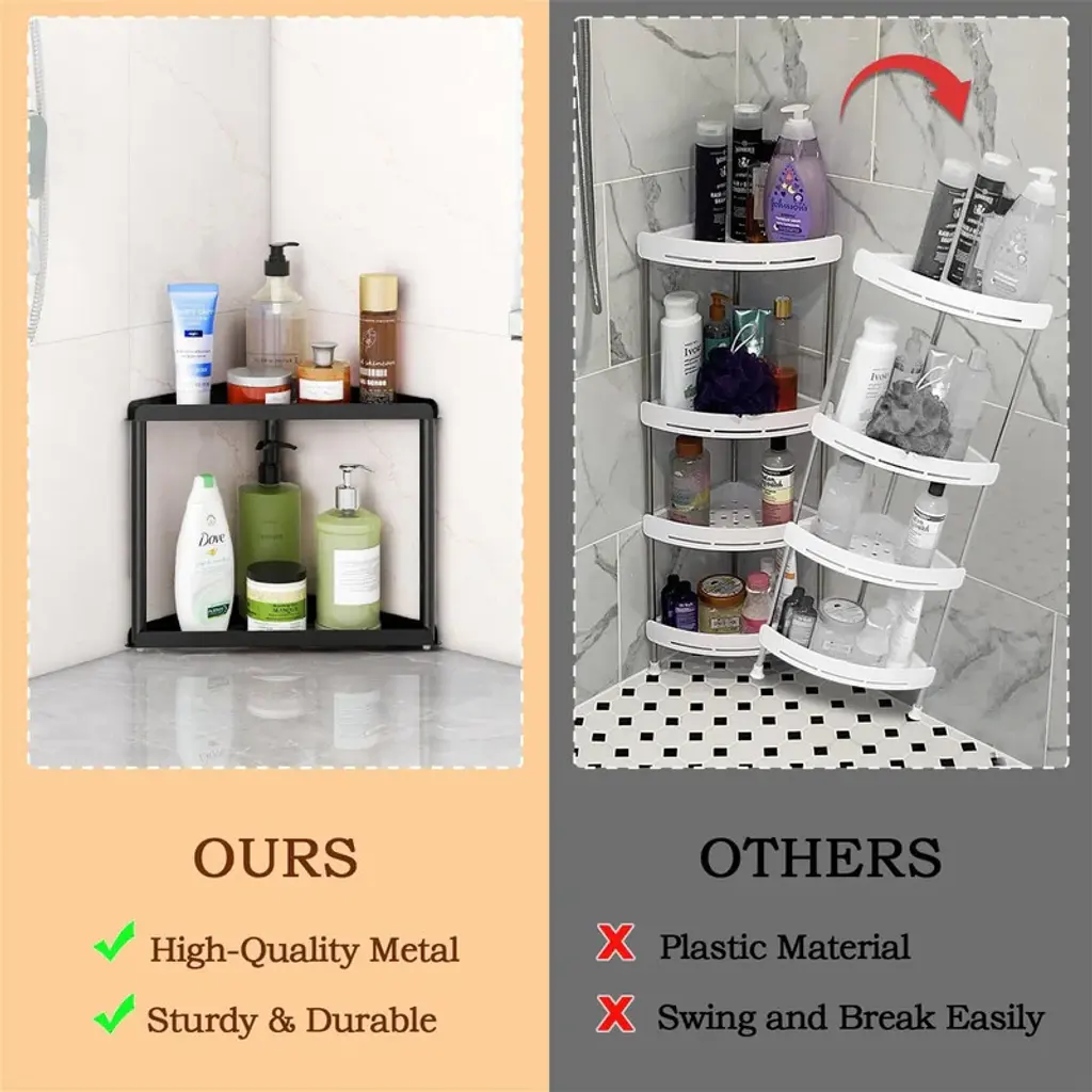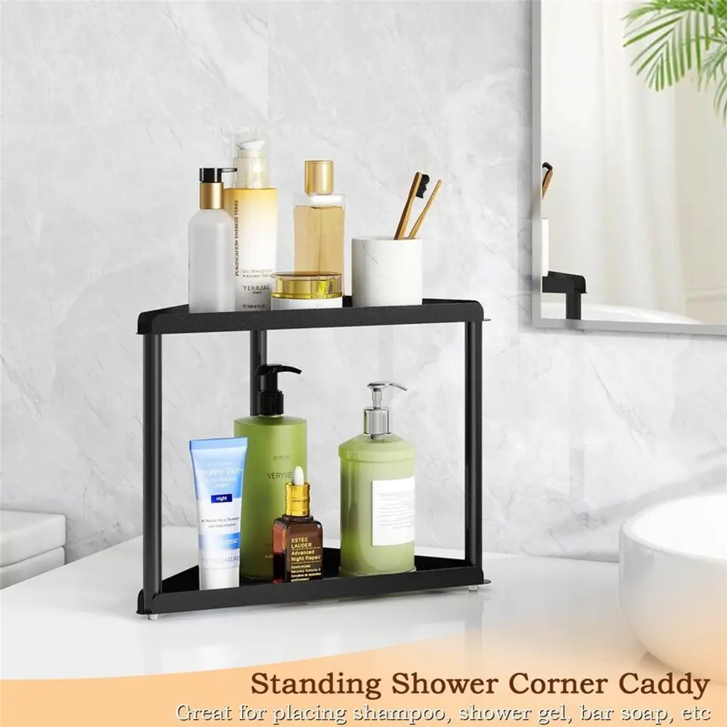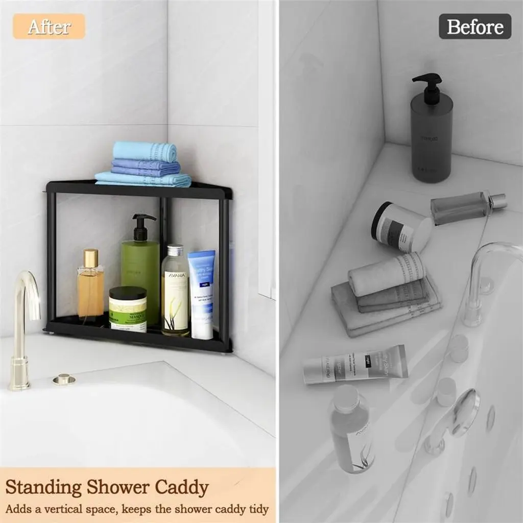 Corner Shower Caddy Standing: Free standing, adds a lot of vertical space. 2-tier, has enough shelves to hold all their shower items and fits perfectly in the corner of inside shower 2or3-Tier standing shower caddy corner: Overall size: H11.8" x L15.75" x W11", which can hold a large capacity of shampoo, body wash and other toiletries for family use Sturdy & Durable: Made from high-quality metal, with a solid construction and strong load-bearing capacity. Black matte surface coating, smooth and easy to clean Drain Well: Each tier of the corner shower shelf has multiple drain slats for efficient drainage, preventing water buildup. Keeps the shower caddy dry and tidy Easy to Assemble: All hardware and instructions are included, just takes only a few minutes to assemble. Classic black design is suitable for all bathroom styles
