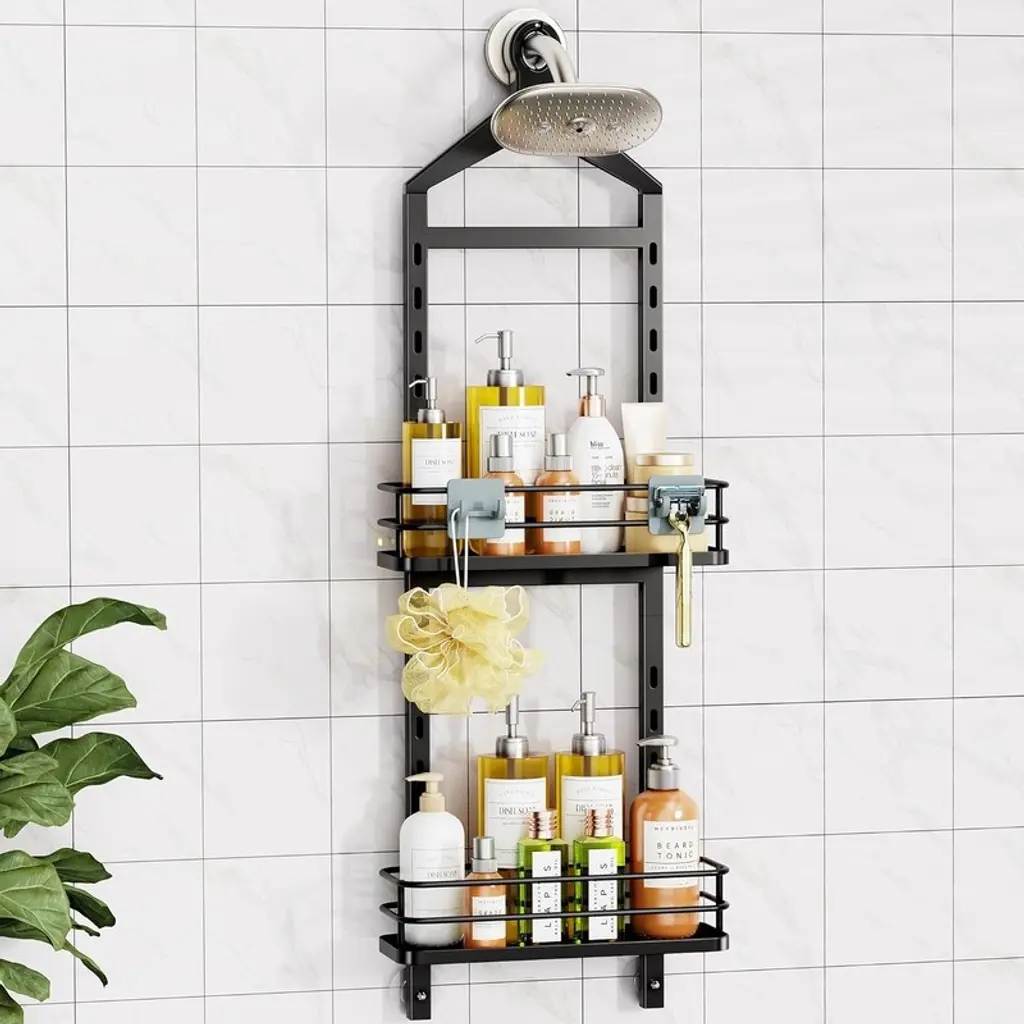 NON-SLIP SHOWER HANGING HEAD: There is a ring of silicone non-slip material on the inner circle of the top of the shower hanging head, and the outer circle has screws locking, double fixing to avoid the shelf slipping or shaking.HEIGHT ADJUSTABLE LARGE CAPACITY SHELVES: You can adjust the height between the shelves to accommodate any size bath products.STRONG AND RUST RESISTANT: The shelves are designed with metal plates that are specially treated to be rust resistant and very stable.NO-DRILL SCREW ADHESIVE: Screw adhesive is more stable than suction cups, no-drill design no need to worry about damaging the wall.DUAL DESIGN HOOKS: Four stable and rust-resistant removable hooks can be used to hang razors, bath sponges and brushes.