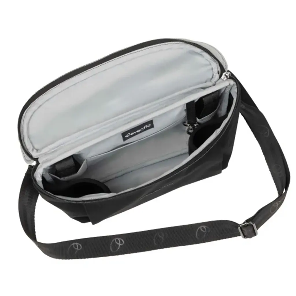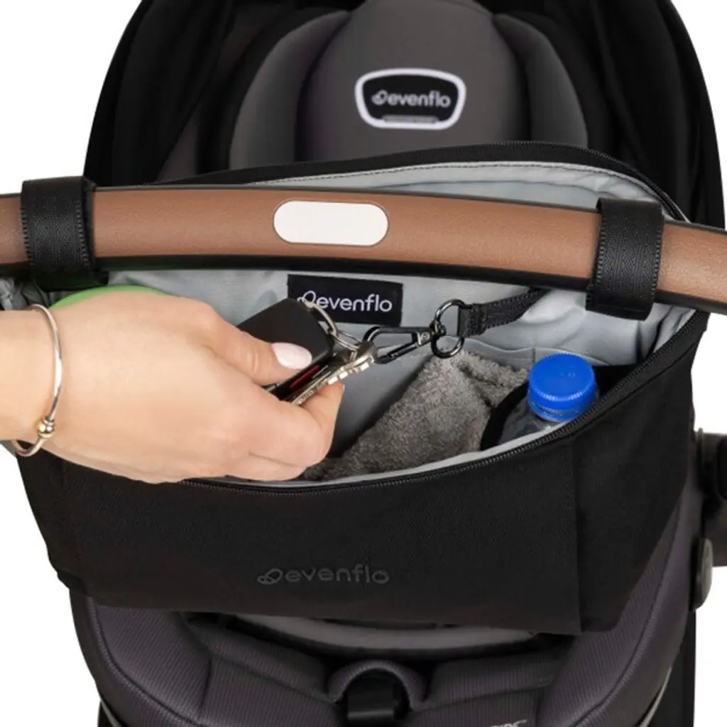 Stay organized in style and get even more convenience from your Evenflo® Shyft™ DualRide™ Infant Car Seat and Stroller Combo with our Stroller Organizer Crossbody Bag! Designed with a durable polyester weave, our lightweight 6.5 in. h x 12.5 in. w x 3.75 in. d bag coordinates with your DualRide, attaching to the handle in seconds via Velcro loops and functions as an open organizer for one-hand access to everything from your iced coffee to backup diapers. Non-slip grip keeps your bag in place. Lined in light grey to help you find what you need quickly, the spacious interior has a place for everything you need to keep handy. Inside, 2 neoprene cupholders secure bottles or cups, a slide pocket holds your phone, the handy key ring loop keeps keys handy, with plenty of room for more necessities. The convenient neoprene back pocket has additional room for sunscreen or wipes. But this essentials bag isn't done impressing — it converts to a sleek crossbody messenger or hip bag for hands-free wear using a removable nylon twill crossbody strap that tucks into a dedicated pocket on the side of the bag. The adjustable strap extends from 22.5 in. to 42.5 in. so you can get the fit just right. Premium chrome zippers and pulls add finesse to the minimal, modern profile, while the lobster claw clasp swivels to hold your bag comfortably against you when worn as a crossbody bag or hip bag. Designed to stand up to daily use, our Stroller Organizer Crossbody Bag can be spot-cleaned as needed. Holds a maximum of 2 lb.It's been 100 years and Evenflo continues to push the boundaries in baby and children's gear design and innovation. We meet the needs of new generations of parents by focusing on what they really care about: leading-edge safety, smart design and technology, and convenient features that help them enjoy the journey of parenthood.