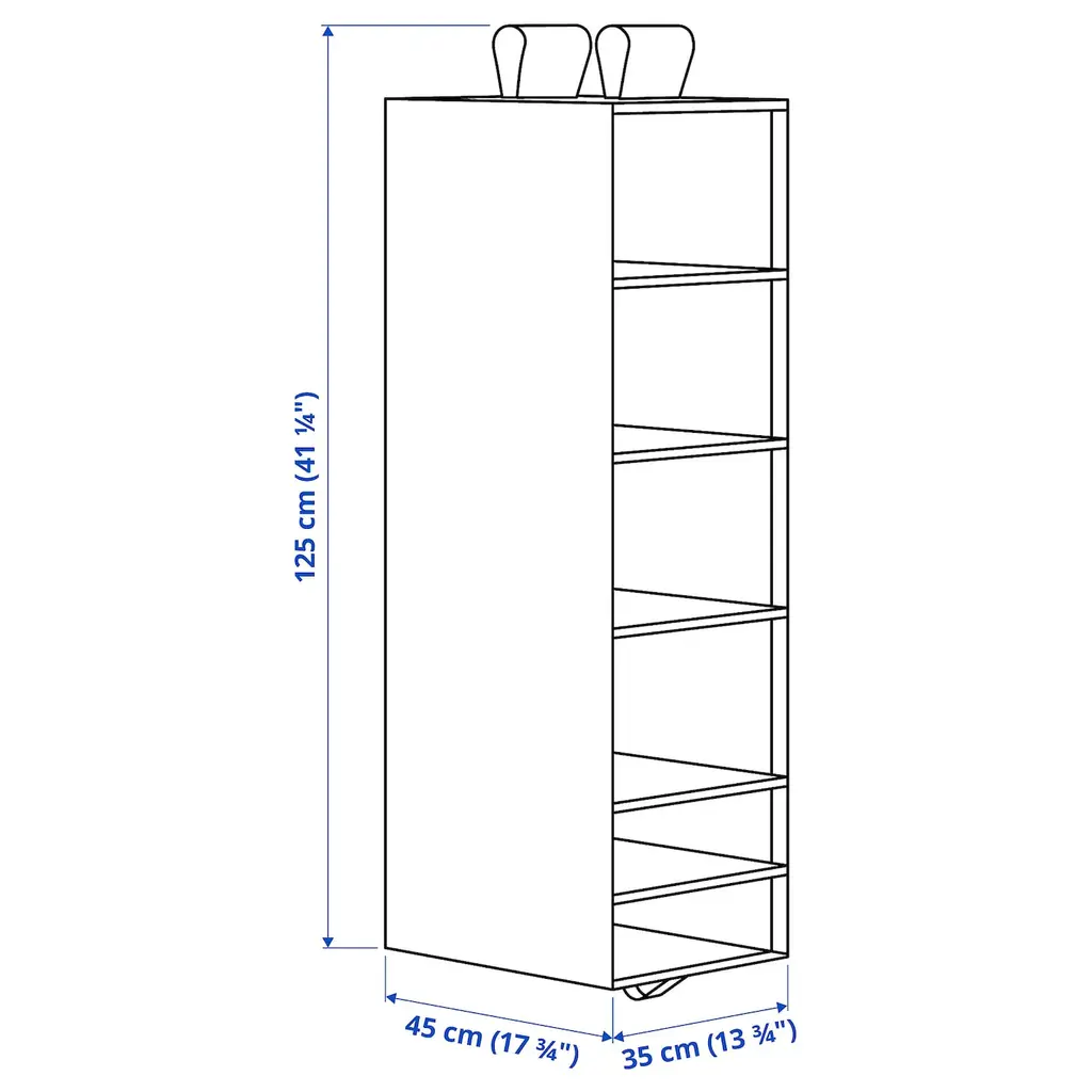 SKUBB Organizer with 6 compartments - dark gray 13 ¾x17 ¾x49 ¼ ". This product is made of polyester, of which at least 90% is recycled. The hook and loop fastener makes it easy to hang up and move. It is easier to pull the boxes out of the compartments if you hold on to the strap at the bottom.