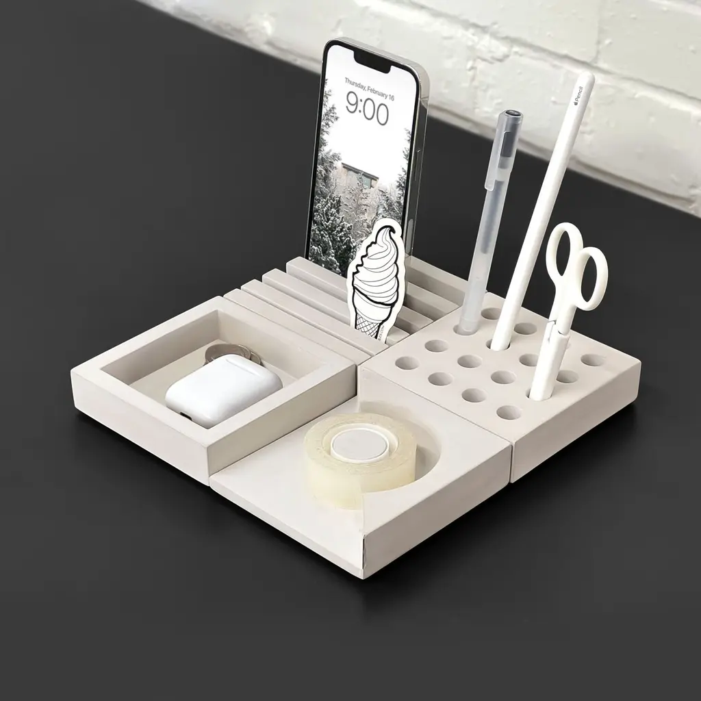 A concrete desk organizer that actually stays put—pens, cards, and your phone all have a home. By iLoveHandles, this is a single cast piece of concrete shaped into a low tray with smart recesses: a couple of pen wells, a shallow catch-all for clips and coins, and a phone slot that keeps the screen at a readable angle. Heavy. Calm. Ready. The feel is architectural—crisp edges, a soft matte surface, and enough mass that it doesn’t skate when you grab a pen. Chamfered rims won’t snag a desk pad, and the open layout means you see what you need at a glance. Drop it by your keyboard, on a studio workbench, or at the entry as a key-and-wallet station. Real-life tidy without fuss; the concrete picks up a gentle patina with use.