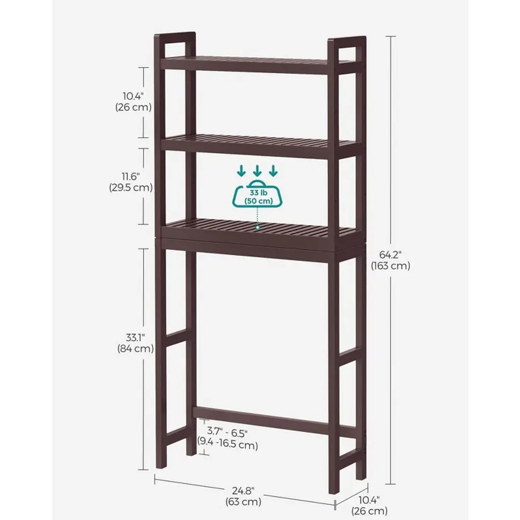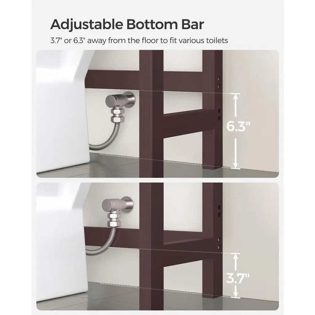 Optimized Bathroom Storage: For those who look to add extra storage to their bathrooms, this over-the-toilet storage shelf is a game changer. It makes the most of the space that would be otherwise wasted to offer oodles of storage while bringing a bathroom to life. This Over-Toilet Bathroom Organizer Has a Lot Going for It: Storage galore: 3 shelves give you plenty of storage for bathroom essentials. Bamboo structure: The over-the-toilet shelf made of natural bamboo is strong, solid, and durable for years to come. Adjustable middle shelf: Adjust it to 3 heights to accommodate items of different heights. Adjustable bottom bar: Set it 3.7” or 6.5” away from the floor to fit various toilets. Versatile: It can also fit over a trash can in the kitchen. Easy to assemble: the clear instructions and labeled parts make the assembly a breeze. Specifications: Material: Bamboo Product Size: 10.2"D x 24.8"W x 64.2"H (26 x 63 x 163 cm) Product Weight: 12.1 lb (5.5 kg) Max. Static Load Capacity per Shelf: 33 lb (15 kg) Package Contents: 1 x Over-the-Toilet Organizer 1 x Accessory Kit 1 x Anti-Tip Kit 1 x Instructions SONGMICS Notes: Mount the product to the wall with the anti-tip kit included for safe use. Do not put overweight items on it.