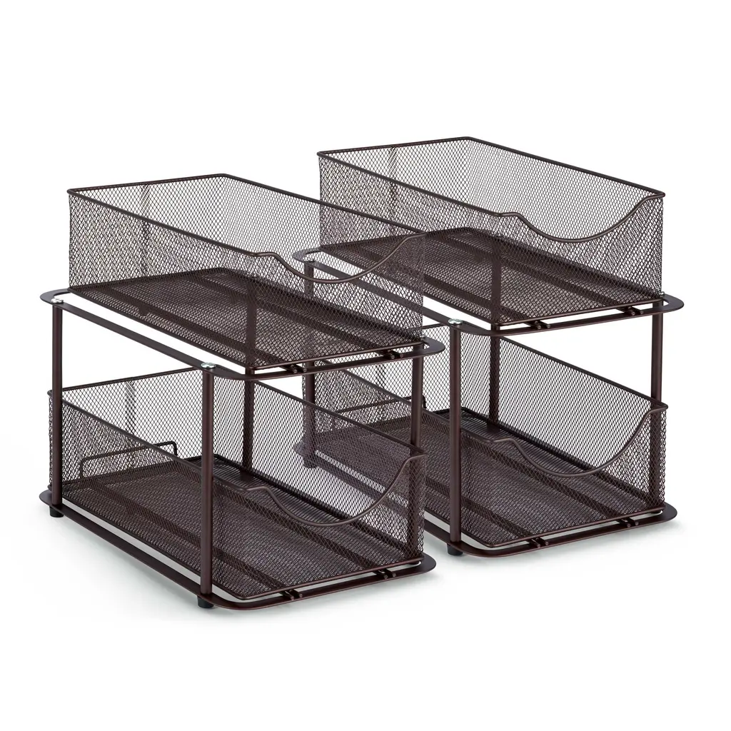 Sorbus 2 Tier Under Sink Bathroom Organizers and Storage, Strong Steel Mesh Sliding Drawers for Enhanced Bathroom Storage, Bathroom Organization and Storage & Under Kitchen Sink Organizer (2 Pack)If clutter makes you crazy, add style, efficiency, and productivity with organizer baskets! Whether you're storing special seasonings, everyday toiletries, or an overload of office supplies, the Sorbus 2 Tier Mesh Organizer Baskets maximizes your space so you can focus on what matters. The attractive 2-level design makes it perfect for the cabinet, countertop, pantry, vanity, workspace, and more. Create extra storage space virtually anywhere and bring items front and center with pull out sliding drawers. Are you tired of digging through cabinet clutter just to find one simple item? For kitchen organization that fits your every need, turn your tight spaced pantry into an organized extensive spice collection. Create storage in lower cabinets for canned goods and baking supplies or under the sink for cleaning products and miscellaneous items. Beautifully organize coffee, tea, and other add-ins on the countertop next to the Keurig machine for a mini café! For a fully-functional bathroom, use our 2-drawer solution to store toiletries under the bathroom vanity. Keep bottles, lotion, hairspray, make-up, toothpaste, etc. well within reach. Enhance your office with a well-designed workspace so you can quickly find paper clips, rubber bands, staplers, and much more to meet that impossible project deadline. Experience a functional design concept, stacked to suit your space confinements! Enjoy a 2-tier design constructed of durable steel mesh to prevent small items from falling through with a sleek black finish. Drawers smoothly glide in and out for easy access with built in handles for easy transport. Minimal assembly required. Add multiple organizer baskets for additional storage! Measures Approximately 14" L x 9.3" W x 3.6" H