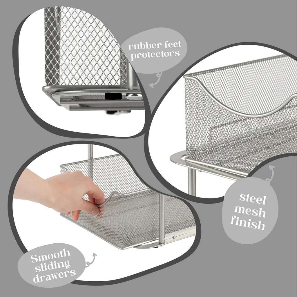 Sorbus 2 Tier Under Sink Bathroom Organizers and Storage, Strong Steel Mesh Sliding Drawers for Enhanced Bathroom Storage, Bathroom Organization and Storage & Under Kitchen Sink Organizer (2 Pack)If clutter makes you crazy, add style, efficiency, and productivity with organizer baskets! Whether you're storing special seasonings, everyday toiletries, or an overload of office supplies, the Sorbus 2 Tier Mesh Organizer Baskets maximizes your space so you can focus on what matters. The attractive 2-level design makes it perfect for the cabinet, countertop, pantry, vanity, workspace, and more. Create extra storage space virtually anywhere and bring items front and center with pull out sliding drawers. Are you tired of digging through cabinet clutter just to find one simple item? For kitchen organization that fits your every need, turn your tight spaced pantry into an organized extensive spice collection. Create storage in lower cabinets for canned goods and baking supplies or under the sink for cleaning products and miscellaneous items. Beautifully organize coffee, tea, and other add-ins on the countertop next to the Keurig machine for a mini café! For a fully-functional bathroom, use our 2-drawer solution to store toiletries under the bathroom vanity. Keep bottles, lotion, hairspray, make-up, toothpaste, etc. well within reach. Enhance your office with a well-designed workspace so you can quickly find paper clips, rubber bands, staplers, and much more to meet that impossible project deadline. Experience a functional design concept, stacked to suit your space confinements! Enjoy a 2-tier design constructed of durable steel mesh to prevent small items from falling through with a sleek black finish. Drawers smoothly glide in and out for easy access with built in handles for easy transport. Minimal assembly required. Add multiple organizer baskets for additional storage! Measures Approximately 14" L x 9.3" W x 3.6" H