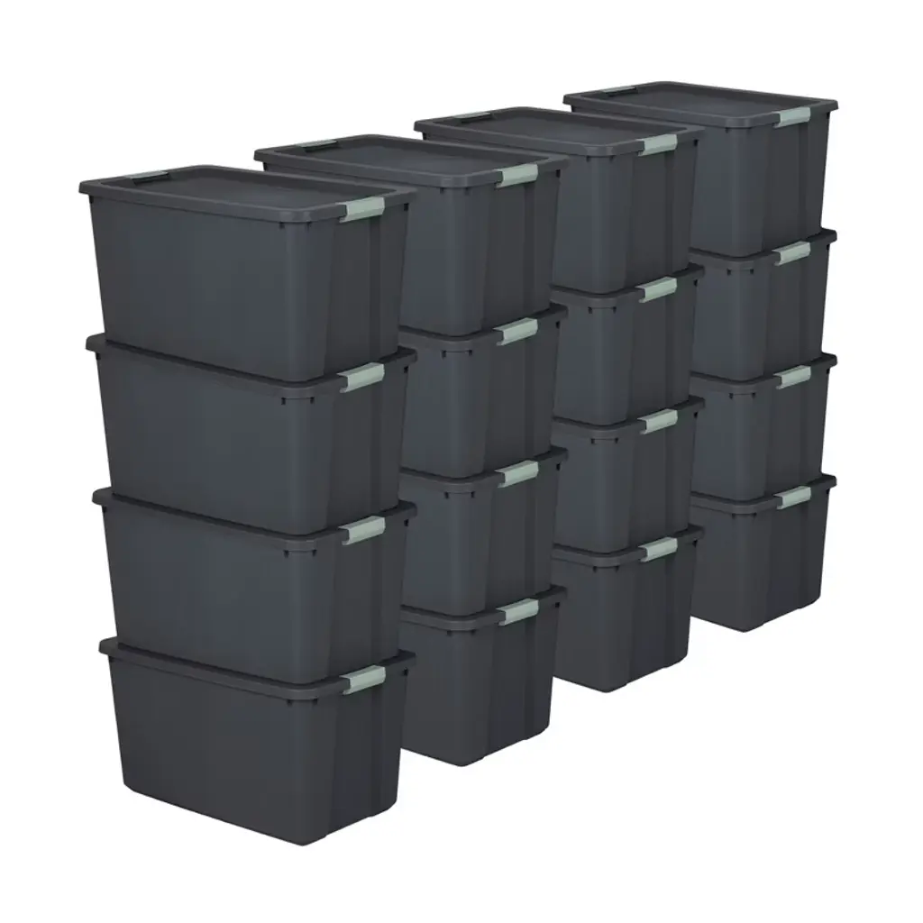 Sterilite 16 Pack 34 Gallon Stackable Plastic Storage Tote Container Organizer Bin With Latching Lid For Home And Garage Organization, Gray/green