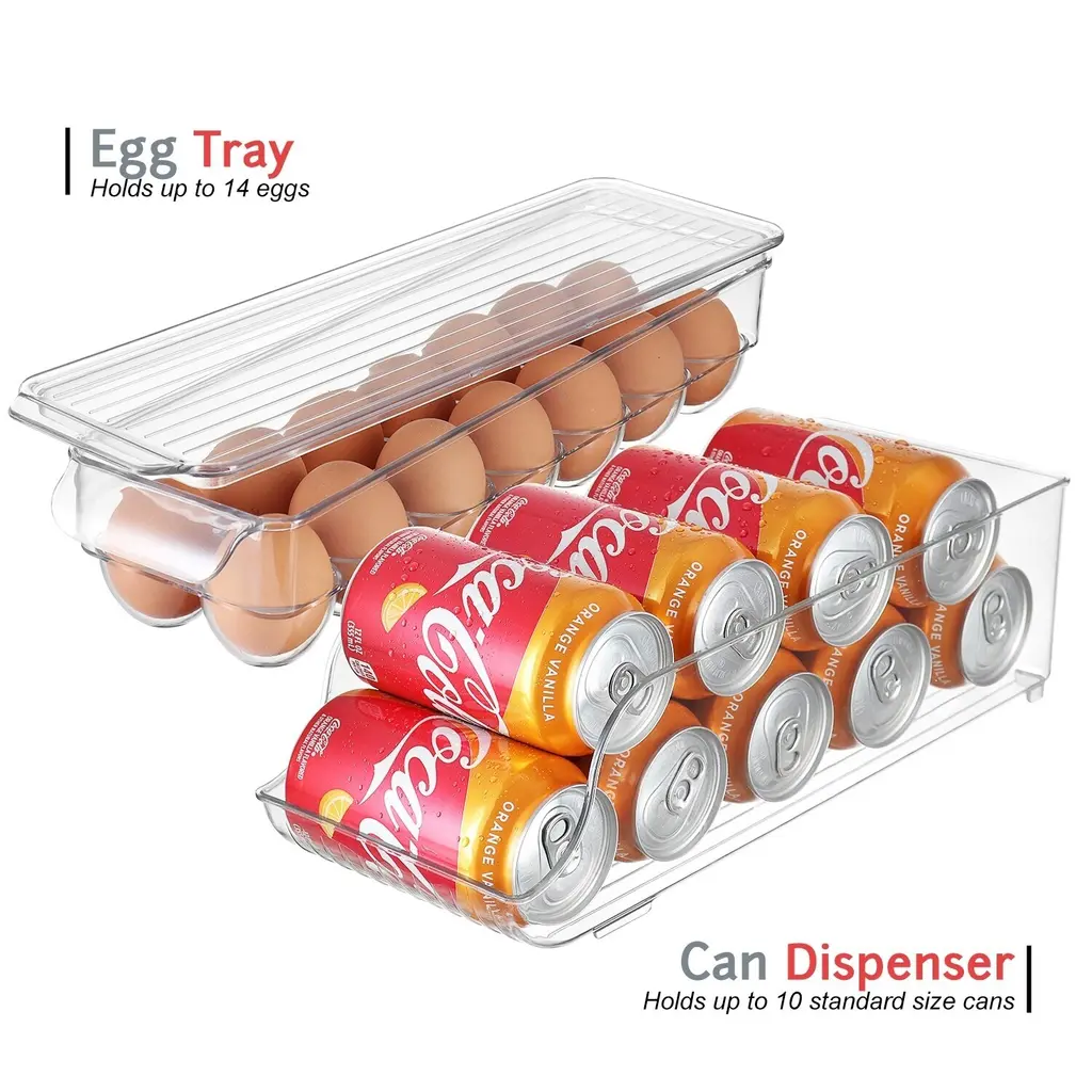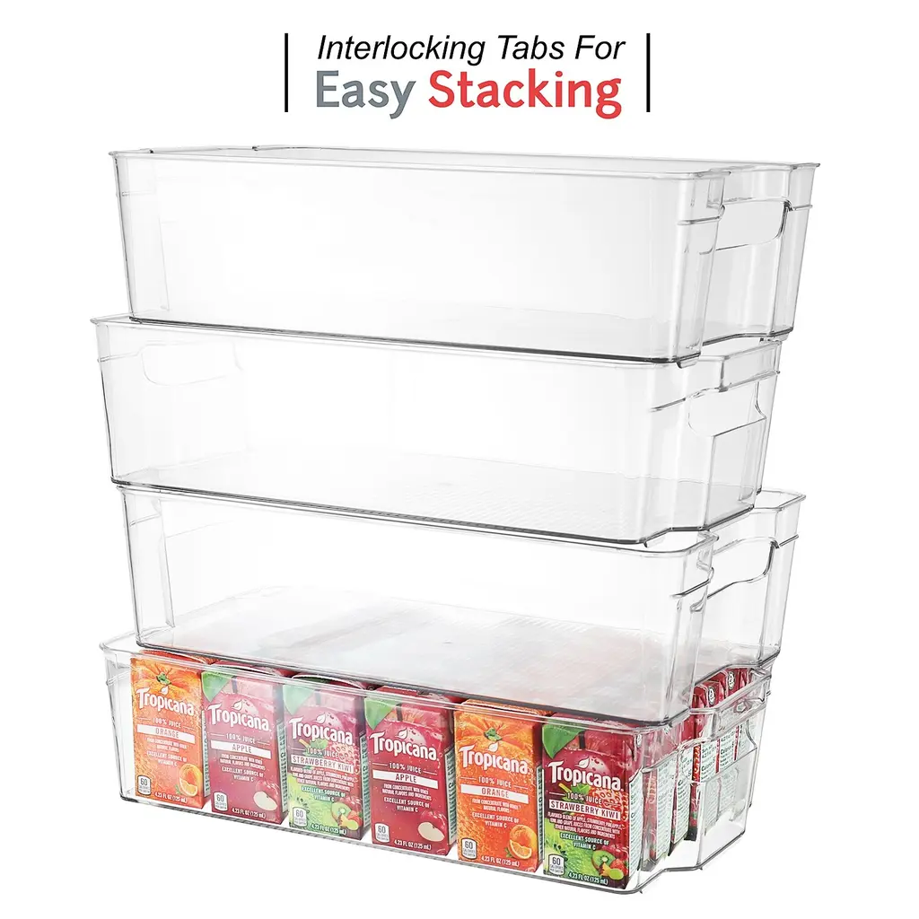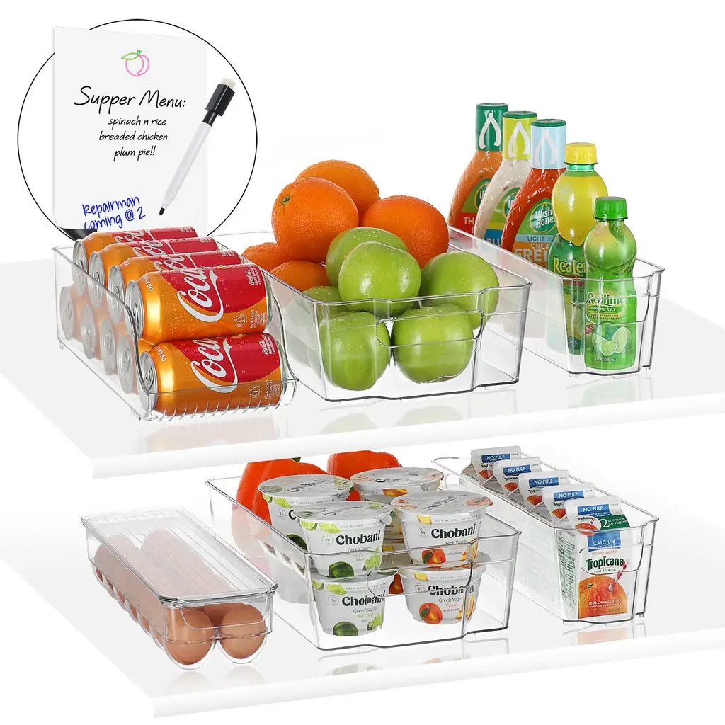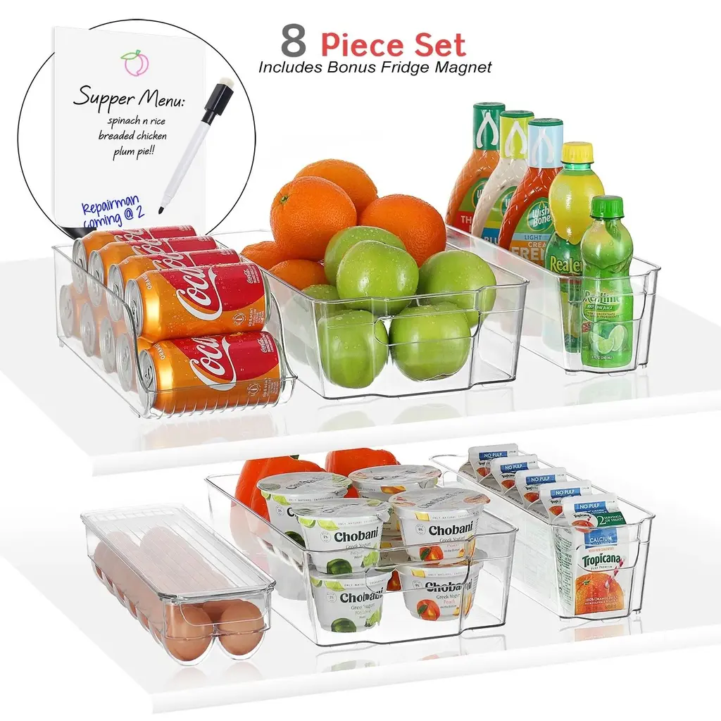 SIMPLIFY YOUR LIFE Tired of having to unpack your fridge or pantry every time you want something that got pushed to the back? the fridge is too full and disorganized? Allow us to present you with a simple fridge organizer solution! Our refrigerator organizer bins will streamline your life and make it simple to stay organized, clear pantry bins that are easy and beautiful to view and access all the items in your refrigerator and pantry!8-PIECE FRIDGE BINS SET INCLUDES 2 Wide fridge bins - perfect for fruits and vegetables, Juice, Milk, and Water bottles, Meal prep containers, and other large food items. 2 Narrow freezer bins - perfect for kids' snacks, condiments, juice boxes, yogurt, and other small food items. 1 Soda can organizer - holds 10 standard-size cans. 1 Egg holder container with lid - holds 14 eggs. BONUS! 1 magnetic whiteboard & marker.CONVENIENT & CLUTTER-FREE Organize your kitchen with our useful clear storage organizer bins, made of clear, sturdy, BPA-free plastic! Perfect for refrigerator organizers, freezer bins, and even pantry storage, these bins feature a built-in handle for easy pull-out and transport. BBQs are a breeze! carry out all the stuff at once with our clear plastic storage bins. With our clear pantry bins, the kids will find their snacks, yogurts, and juice boxes easily to simplify meals and save time!CLEANING & DIMENSIONS Clean the acrylic storage bins by hand only with mild soap and warm water. These clear bins are NOT dishwasher safe - do not place them in the dishwasher! DIMENSIONS: Wide Pantry Bins: 14.5" L x 8.5" W x 4" H. | Narrow Freezer Bins: 14.75" L x 4.25" W x 4" H. | Soda Can Organizer: 13.25" L x 5.5" W x 4" H. | Egg Holder: 14.5" L x 4.37" W x 3.12" H. These clear pantry bins are stackable for better use of space and easier use!FRIDGE ORGANIZER SATISFACTION GUARANTEE Welcome to the StorageBud family! Every StorageBud fridge organizer and pantry bin purchase is backed by our HappyHome Warranty and includes a 100% money-back satisfaction guarantee! Our #1 goal is to provide you with unparalleled customer service and strong acrylic storage bins. we're only happy if our customers are happy. Shop with confidence because no matter what, we have a solution for you!