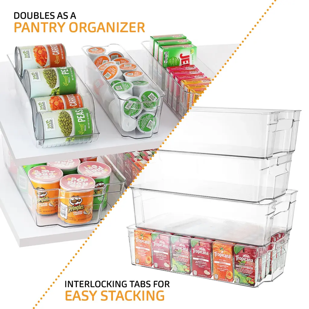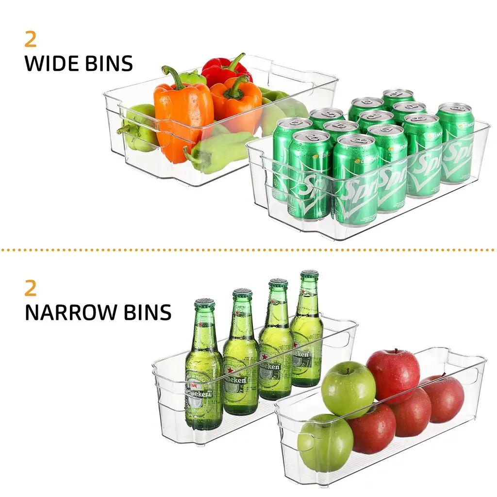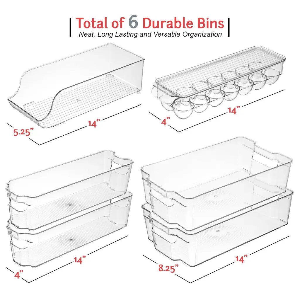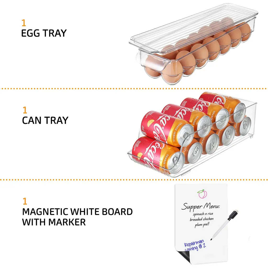 SIMPLIFY YOUR LIFE Tired of having to unpack your fridge or pantry every time you want something that got pushed to the back? the fridge is too full and disorganized? Allow us to present you with a simple fridge organizer solution! Our refrigerator organizer bins will streamline your life and make it simple to stay organized, clear pantry bins that are easy and beautiful to view and access all the items in your refrigerator and pantry!8-PIECE FRIDGE BINS SET INCLUDES 2 Wide fridge bins - perfect for fruits and vegetables, Juice, Milk, and Water bottles, Meal prep containers, and other large food items. 2 Narrow freezer bins - perfect for kids' snacks, condiments, juice boxes, yogurt, and other small food items. 1 Soda can organizer - holds 10 standard-size cans. 1 Egg holder container with lid - holds 14 eggs. BONUS! 1 magnetic whiteboard & marker.CONVENIENT & CLUTTER-FREE Organize your kitchen with our useful clear storage organizer bins, made of clear, sturdy, BPA-free plastic! Perfect for refrigerator organizers, freezer bins, and even pantry storage, these bins feature a built-in handle for easy pull-out and transport. BBQs are a breeze! carry out all the stuff at once with our clear plastic storage bins. With our clear pantry bins, the kids will find their snacks, yogurts, and juice boxes easily to simplify meals and save time!CLEANING & DIMENSIONS Clean the acrylic storage bins by hand only with mild soap and warm water. These clear bins are NOT dishwasher safe - do not place them in the dishwasher! DIMENSIONS: Wide Pantry Bins: 14.5" L x 8.5" W x 4" H. | Narrow Freezer Bins: 14.75" L x 4.25" W x 4" H. | Soda Can Organizer: 13.25" L x 5.5" W x 4" H. | Egg Holder: 14.5" L x 4.37" W x 3.12" H. These clear pantry bins are stackable for better use of space and easier use!FRIDGE ORGANIZER SATISFACTION GUARANTEE Welcome to the StorageBud family! Every StorageBud fridge organizer and pantry bin purchase is backed by our HappyHome Warranty and includes a 100% money-back satisfaction guarantee! Our #1 goal is to provide you with unparalleled customer service and strong acrylic storage bins. we're only happy if our customers are happy. Shop with confidence because no matter what, we have a solution for you!