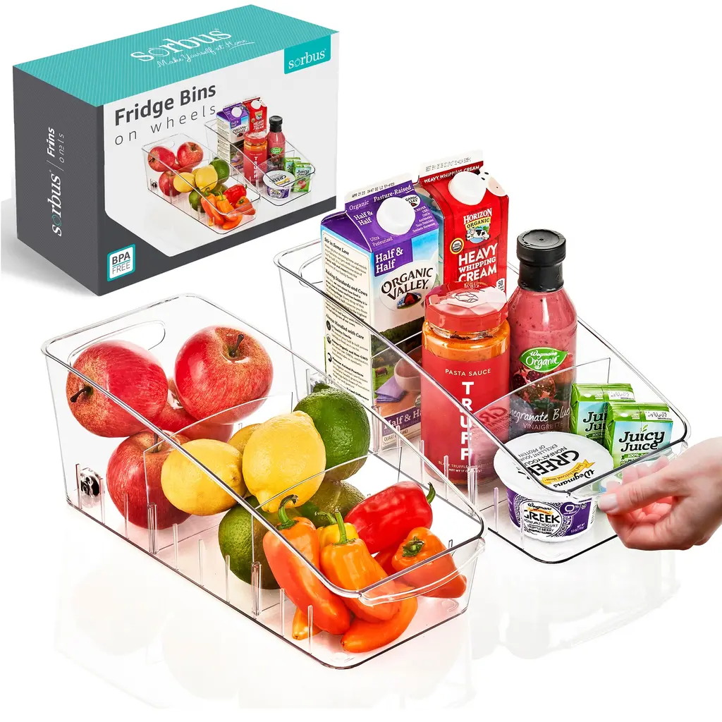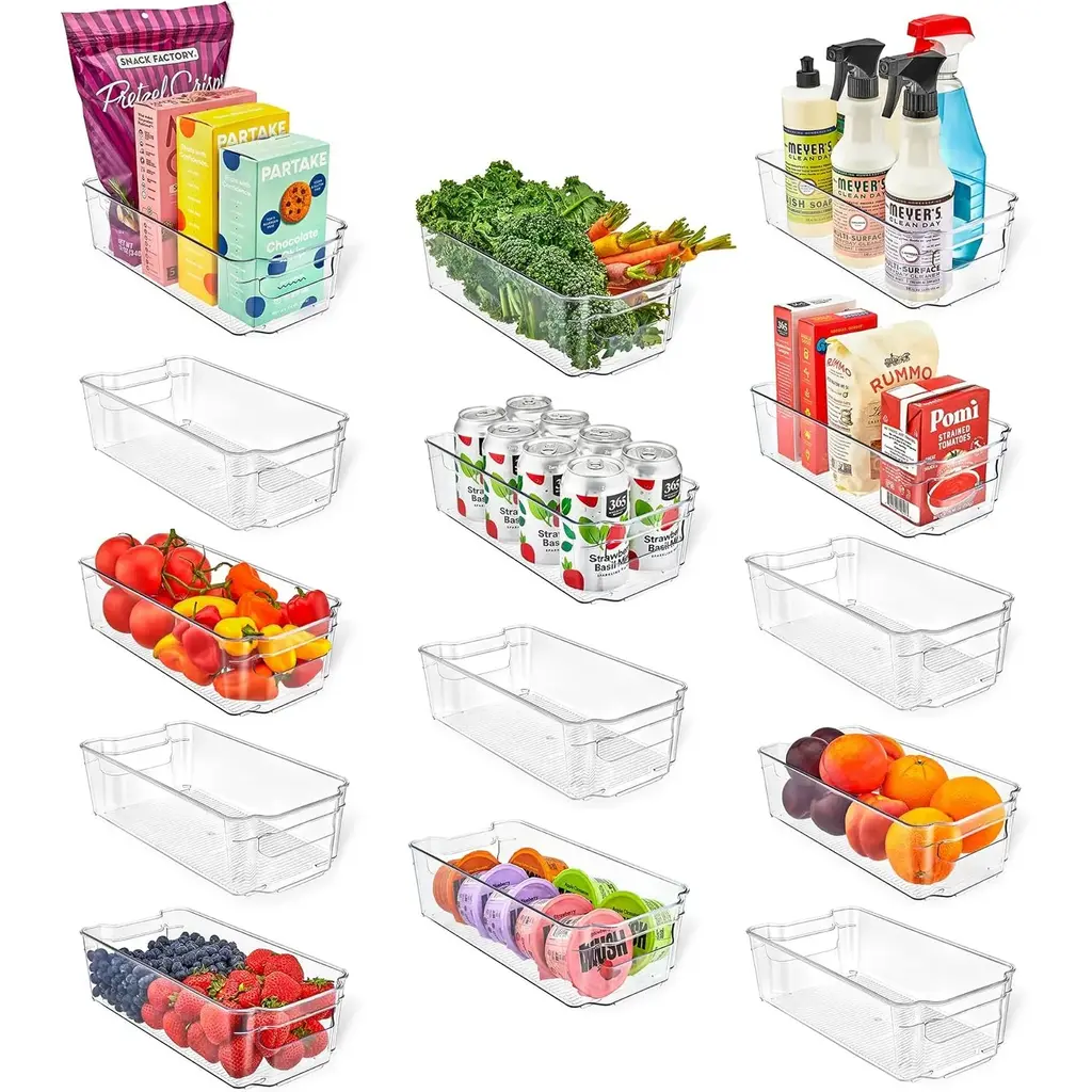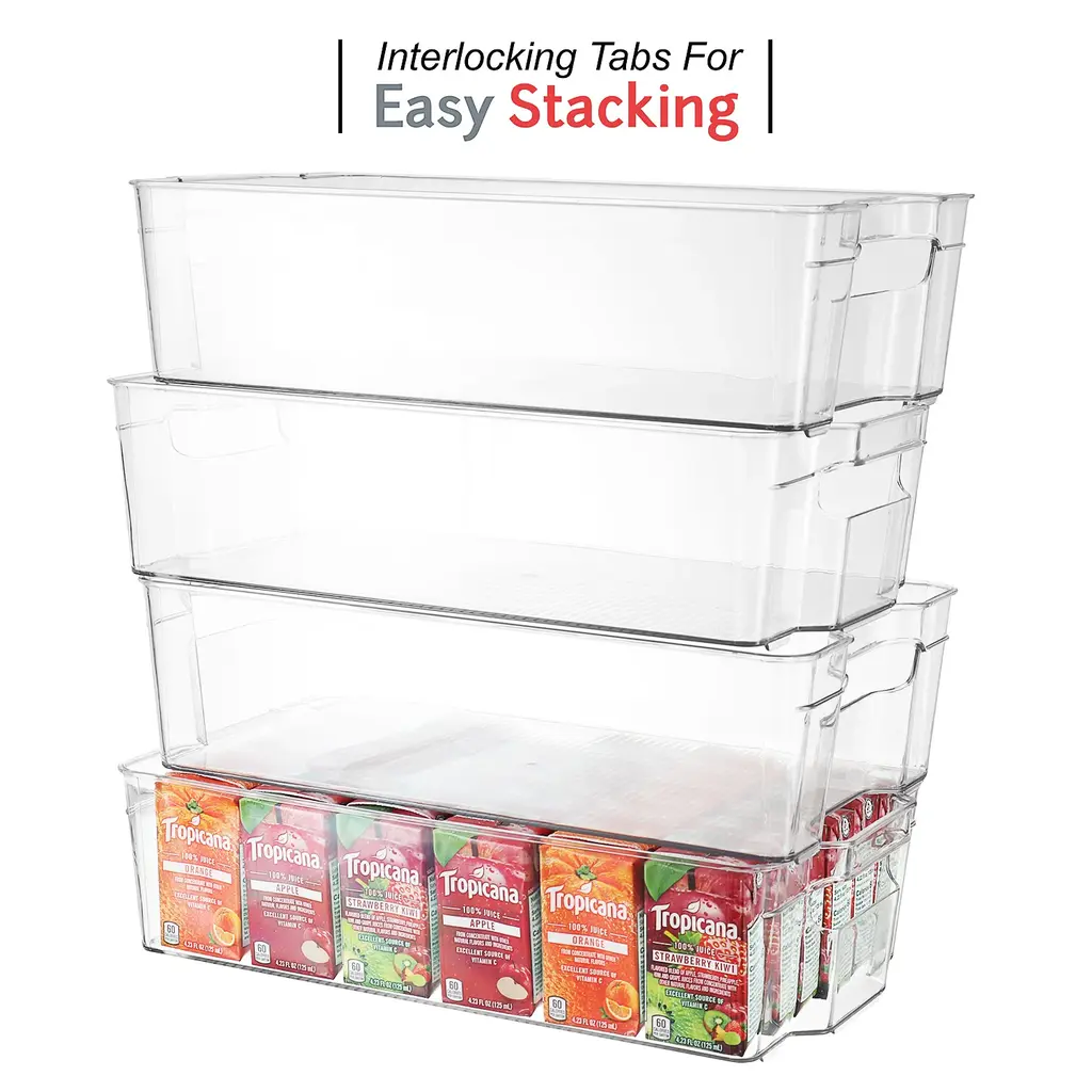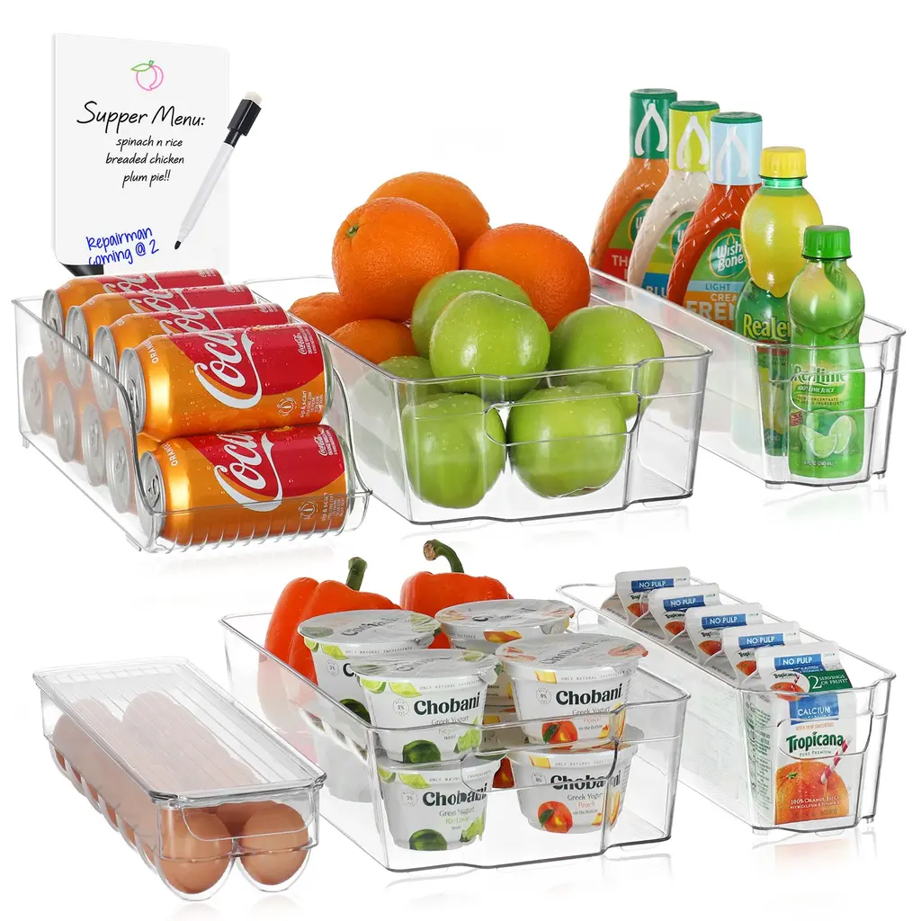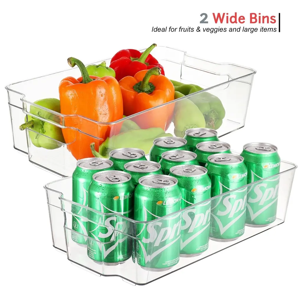 SIMPLIFY YOUR LIFE Tired of having to unpack your fridge or pantry every time you want something that got pushed to the back? the fridge is too full and disorganized? Allow us to present you with a simple fridge organizer solution! Our refrigerator organizer bins will streamline your life and make it simple to stay organized, clear pantry bins that are easy and beautiful to view and access all the items in your refrigerator and pantry!8-PIECE FRIDGE BINS SET INCLUDES 2 Wide fridge bins - perfect for fruits and vegetables, Juice, Milk, and Water bottles, Meal prep containers, and other large food items. 2 Narrow freezer bins - perfect for kids' snacks, condiments, juice boxes, yogurt, and other small food items. 1 Soda can organizer - holds 10 standard-size cans. 1 Egg holder container with lid - holds 14 eggs. BONUS! 1 magnetic whiteboard & marker.CONVENIENT & CLUTTER-FREE Organize your kitchen with our useful clear storage organizer bins, made of clear, sturdy, BPA-free plastic! Perfect for refrigerator organizers, freezer bins, and even pantry storage, these bins feature a built-in handle for easy pull-out and transport. BBQs are a breeze! carry out all the stuff at once with our clear plastic storage bins. With our clear pantry bins, the kids will find their snacks, yogurts, and juice boxes easily to simplify meals and save time!CLEANING & DIMENSIONS Clean the acrylic storage bins by hand only with mild soap and warm water. These clear bins are NOT dishwasher safe - do not place them in the dishwasher! DIMENSIONS: Wide Pantry Bins: 14.5" L x 8.5" W x 4" H. | Narrow Freezer Bins: 14.75" L x 4.25" W x 4" H. | Soda Can Organizer: 13.25" L x 5.5" W x 4" H. | Egg Holder: 14.5" L x 4.37" W x 3.12" H. These clear pantry bins are stackable for better use of space and easier use!FRIDGE ORGANIZER SATISFACTION GUARANTEE Welcome to the StorageBud family! Every StorageBud fridge organizer and pantry bin purchase is backed by our HappyHome Warranty and includes a 100% money-back satisfaction guarantee! Our #1 goal is to provide you with unparalleled customer service and strong acrylic storage bins. we're only happy if our customers are happy. Shop with confidence because no matter what, we have a solution for you!