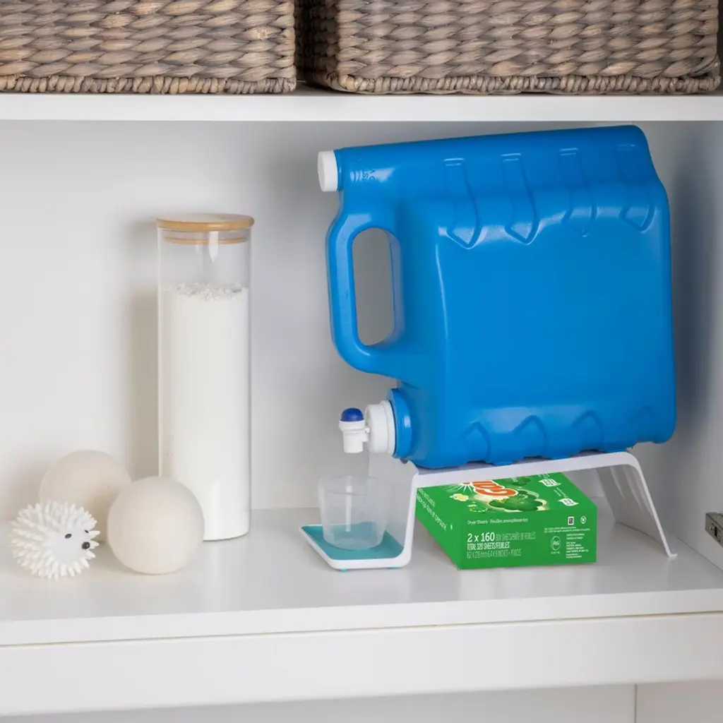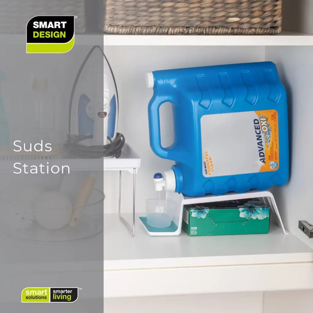 Angled Forward Design allows for Lift & Spill-Free Pouring makes it easier to do your laundry. Non-slid feet and tray prevents any unwanted spills. Package Includes Sud Station with convenient storage compartment underneath ideal for softeners, dryers balls, and more. Features and Benefits Easily pour your laundry detergent, soap, or bleach container into your cup without the hassle of carrying it or tilting it. Fits most laundry containers Product Specifications Dimensions: 12.675(L) x 5.825(W) x 3.9(H) inches Color: White Material: Durable Resin Material Holds: One detergent container & Softener box