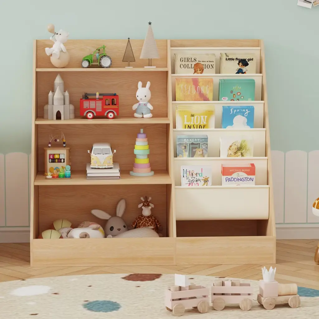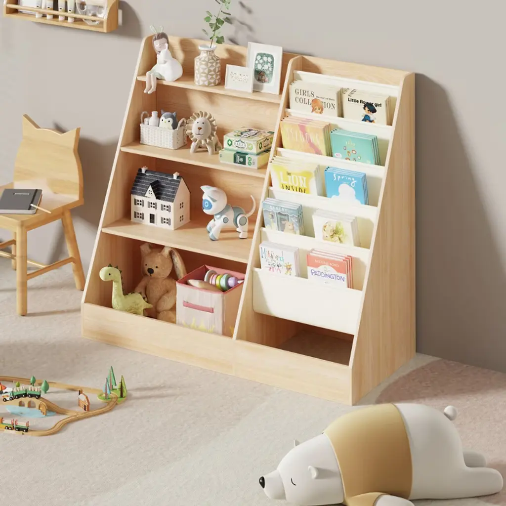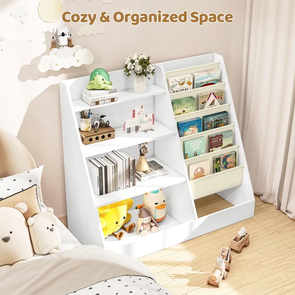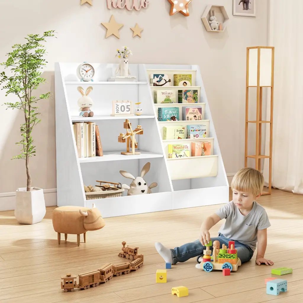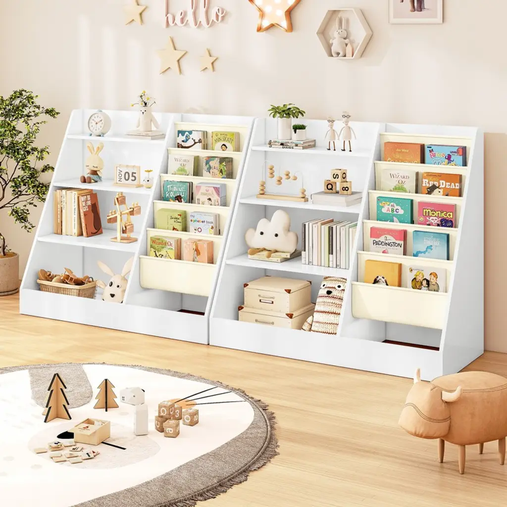 This versatile organizer seamlessly integrates book and toy storage into one unit, offering a cozy corner that doubles as a play area and a space to foster children’s storage habits.The bookshelf is designed at a height of 35.4'' to ensure that children's favorite storybooks are always within reach, encouraging them to embark on a journey of growth. Feature: Functional and practical Deep sling pockets Multi-Layer Storage No external leakage screws design Rounded design of the edges Strong Load Capacity Better Stability Easy to Assemble Specifications Color:White Material:Particleboard, Metal, Cotton Product Size:35.4"L x 15.7"W x 31.5"H Package Contents 1 x Kids Bookshelf; 1 x Accessory Kit; 1 x Anti-Tip Kit; 1 x Instructions