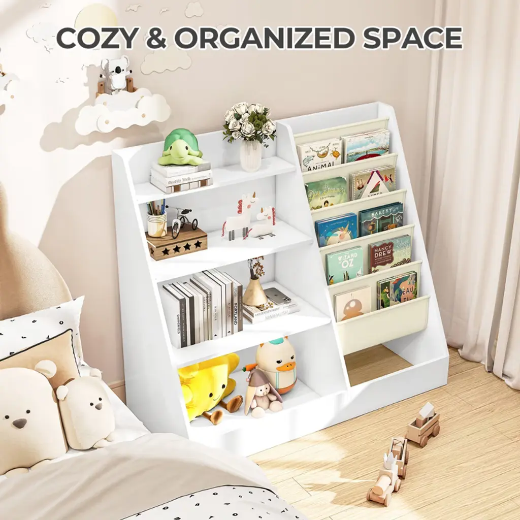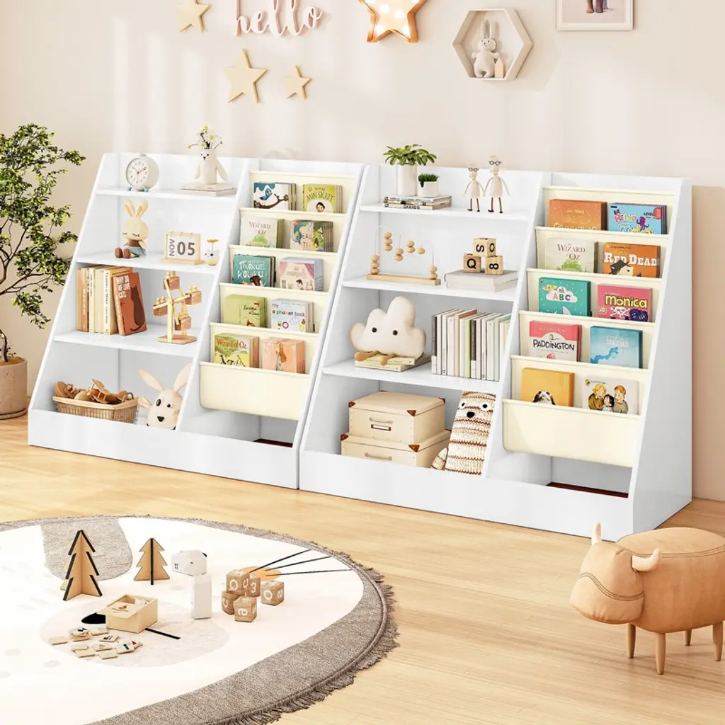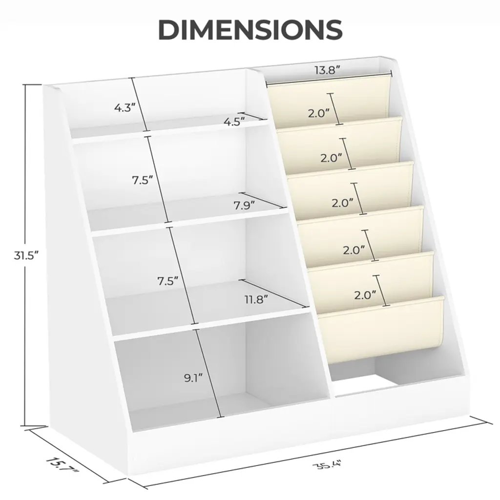 Encourage your child’s love of reading and organization with the SUGIFT 4-Tier Kids Bookshelf and Toy Storage Organizer. This functional and stylish unit combines a multi-level wood shelf with deep fabric sling pockets, offering the perfect balance between display and storage. Whether used in a nursery, playroom, or classroom, its toddler-friendly height ensures easy access, while the trapezoid design adds both charm and stability. Designed with smooth edges and equipped with an anti-tip kit, it's safe for little hands and minds. Features Dual-Sided Storage – 4 wooden shelves + 5 deep fabric pockets Toddler-Height Design – Easy for kids to reach and organize their books and toys Soft Cotton-Linen Pockets – Spacious and gentle on little hands Durable & Stable – Trapezoid frame with reinforced back and anti-tip strap Safe for Kids – Rounded corners and no visible external screws Easy to Assemble – Clear instructions, tools, and labeled parts included Multi-Purpose – Ideal for bedrooms, playrooms, nurseries, and classrooms Specifications Color: Natural Wood + White Materials: Particleboard, Cotton Linen, Metal Overall Dimensions: 35.4"L x 15.7"W x 31.5"H Recommended Age: 1–8 years Assembly Required: Yes (Tools Included)Net Weight: Approx. 10.8 lbs 1 x Kids Bookshelf 1 x Accessory Kit 1 x Anti-Tip Kit 1 x Instruction Manual